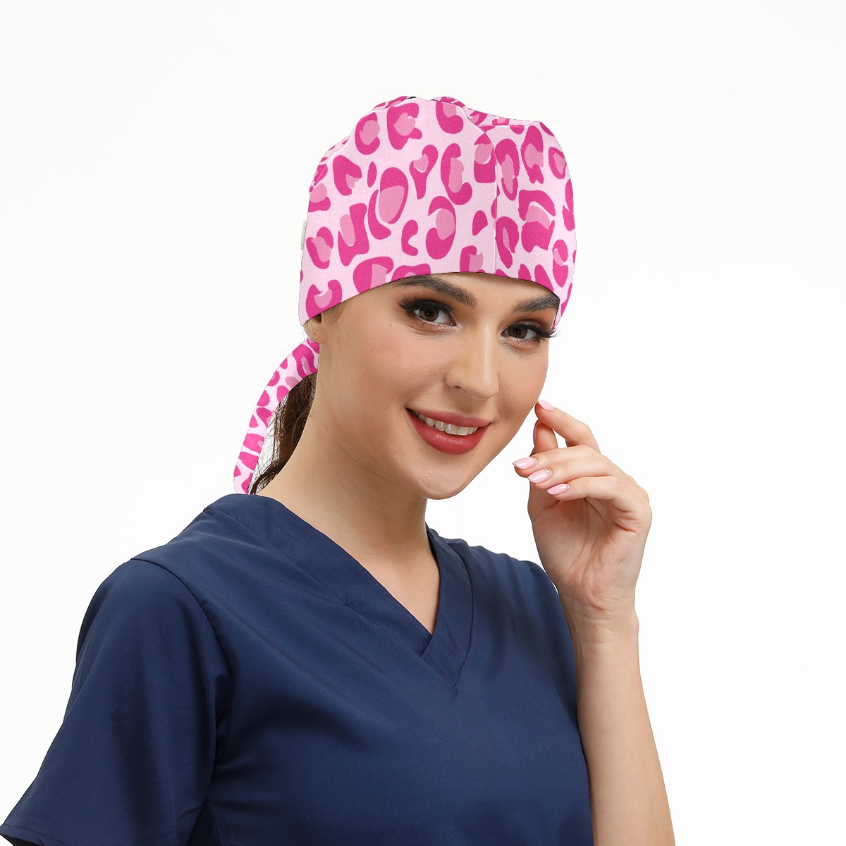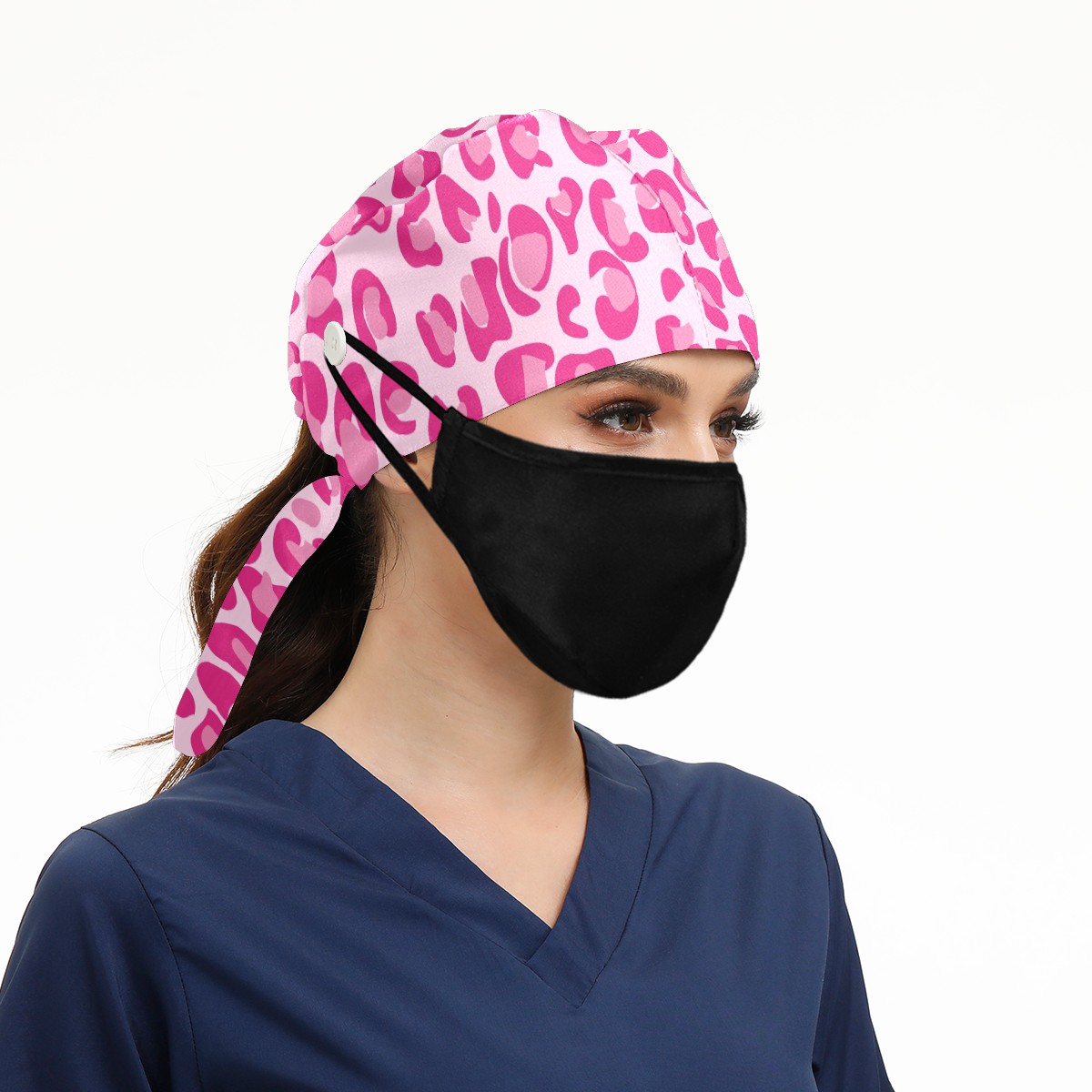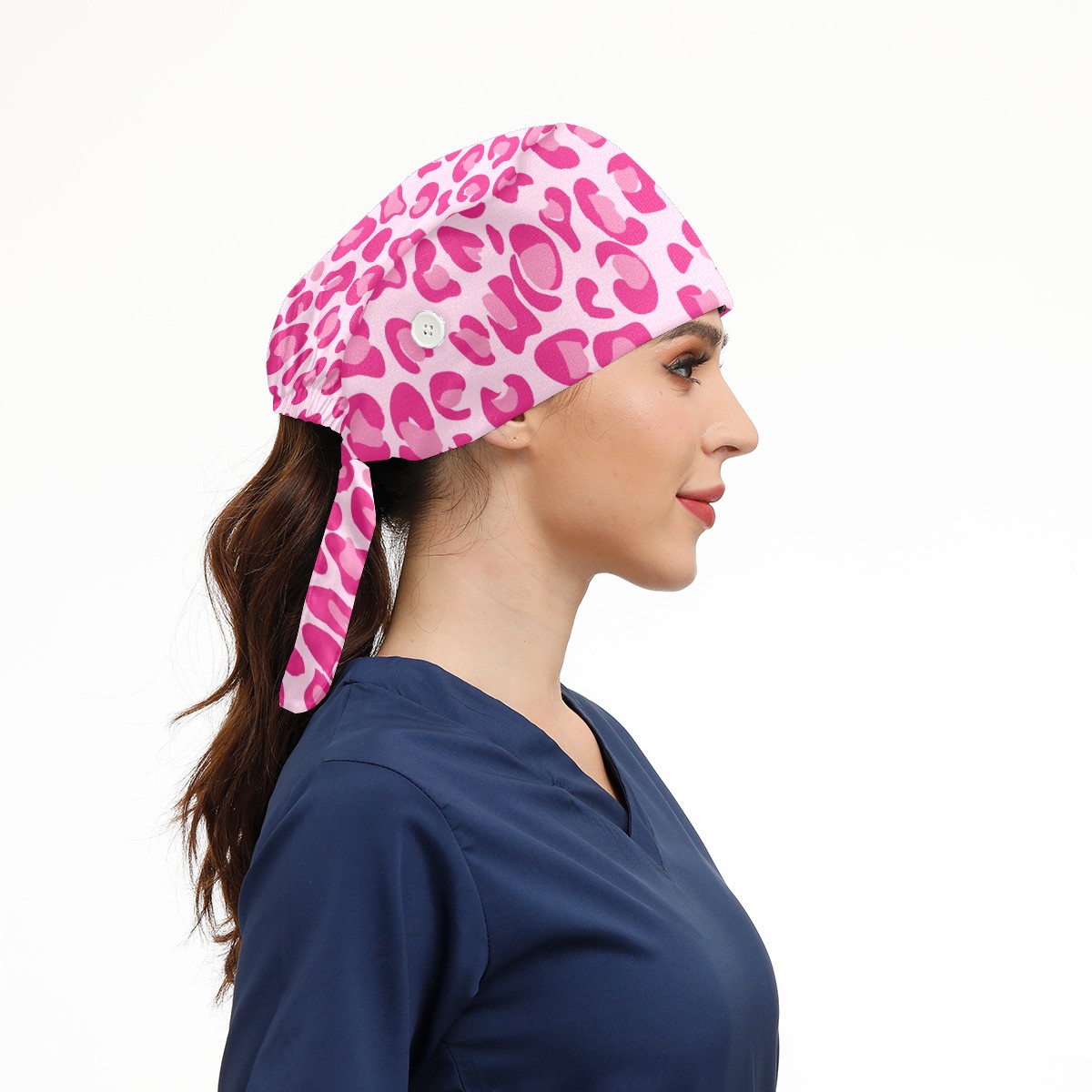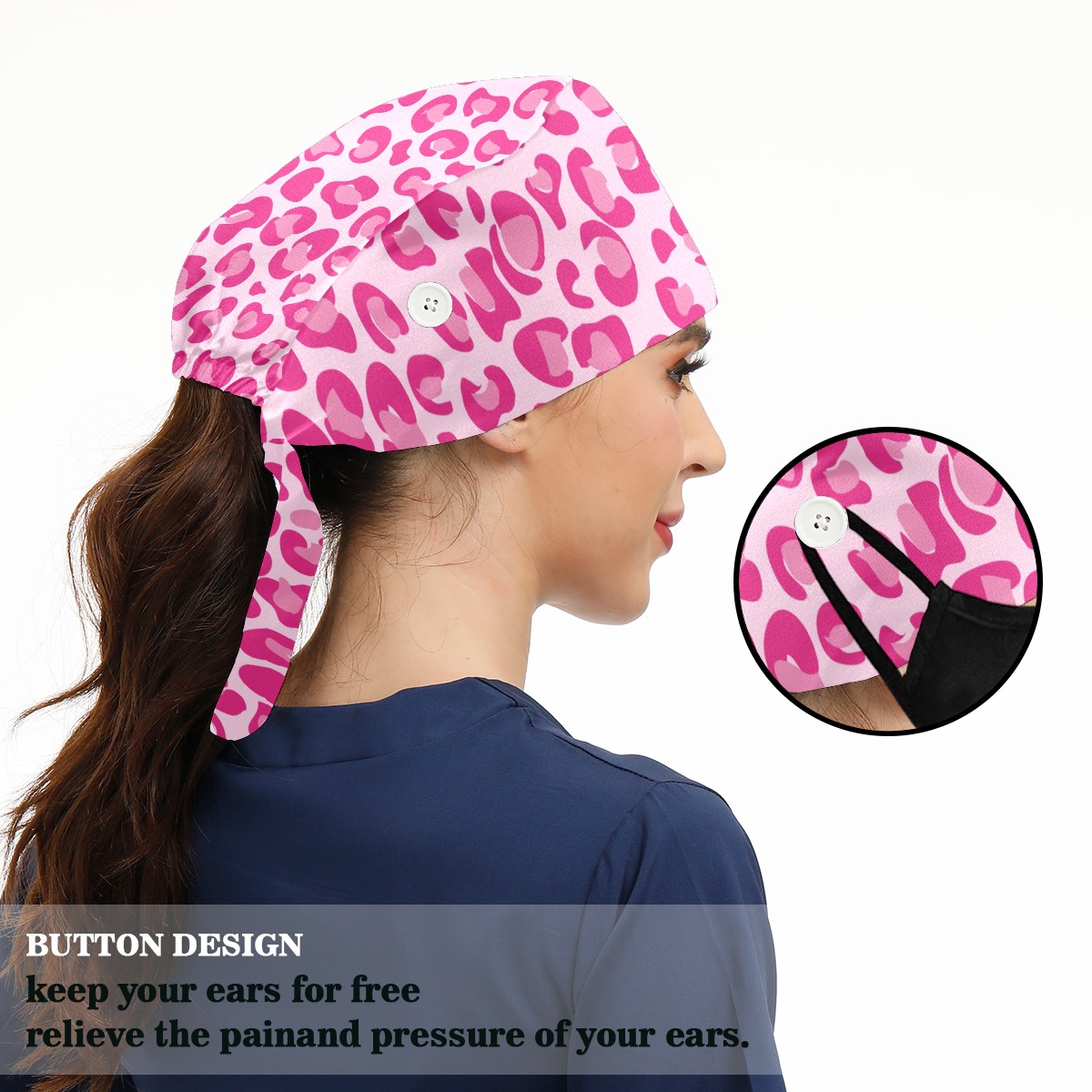 Working Caps with Button & Sweatband Satin Lined Cotton Adjustable Nurse Hats Elastic Band Scrub Cap Surgeon Hat Pink Leopard Print