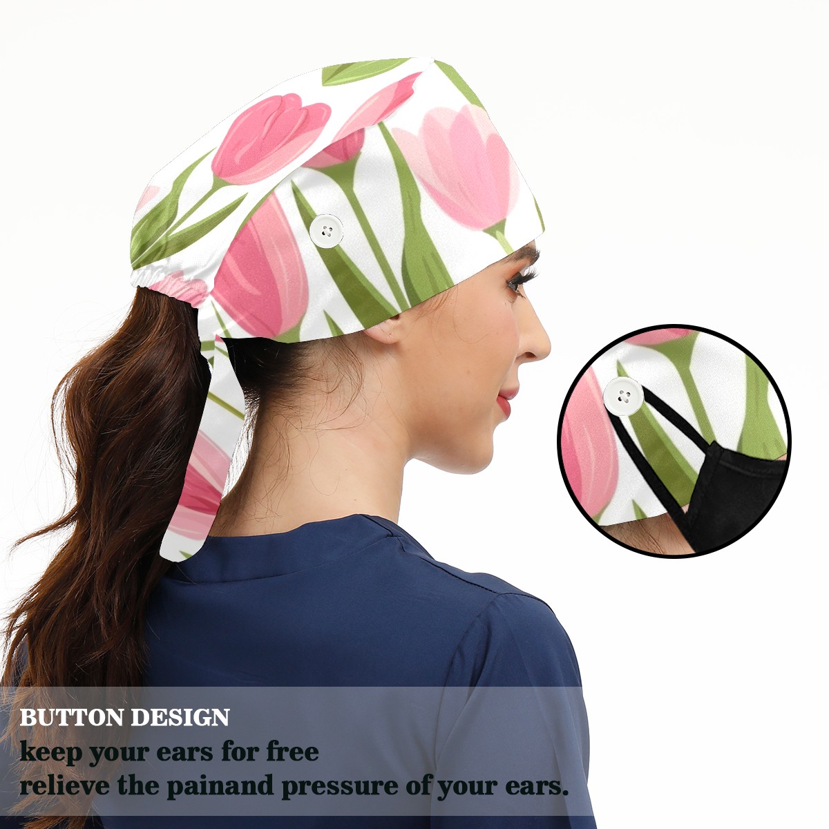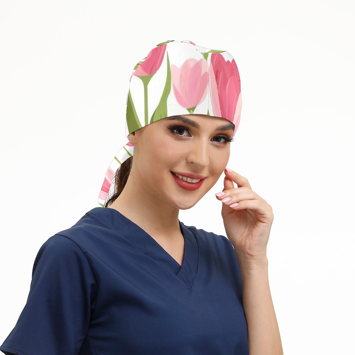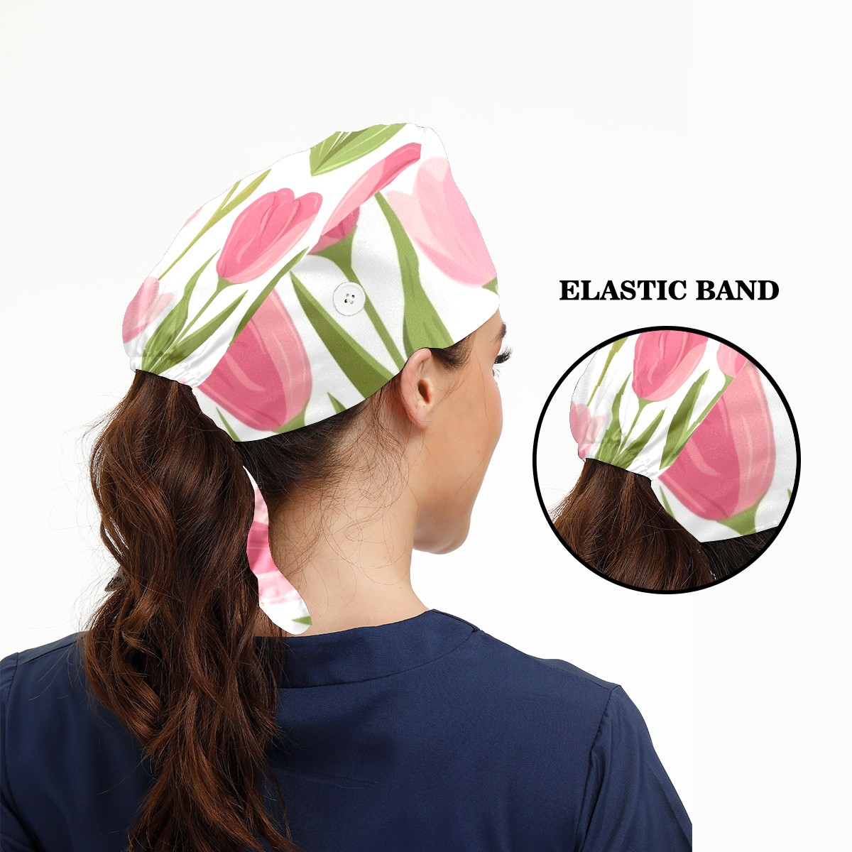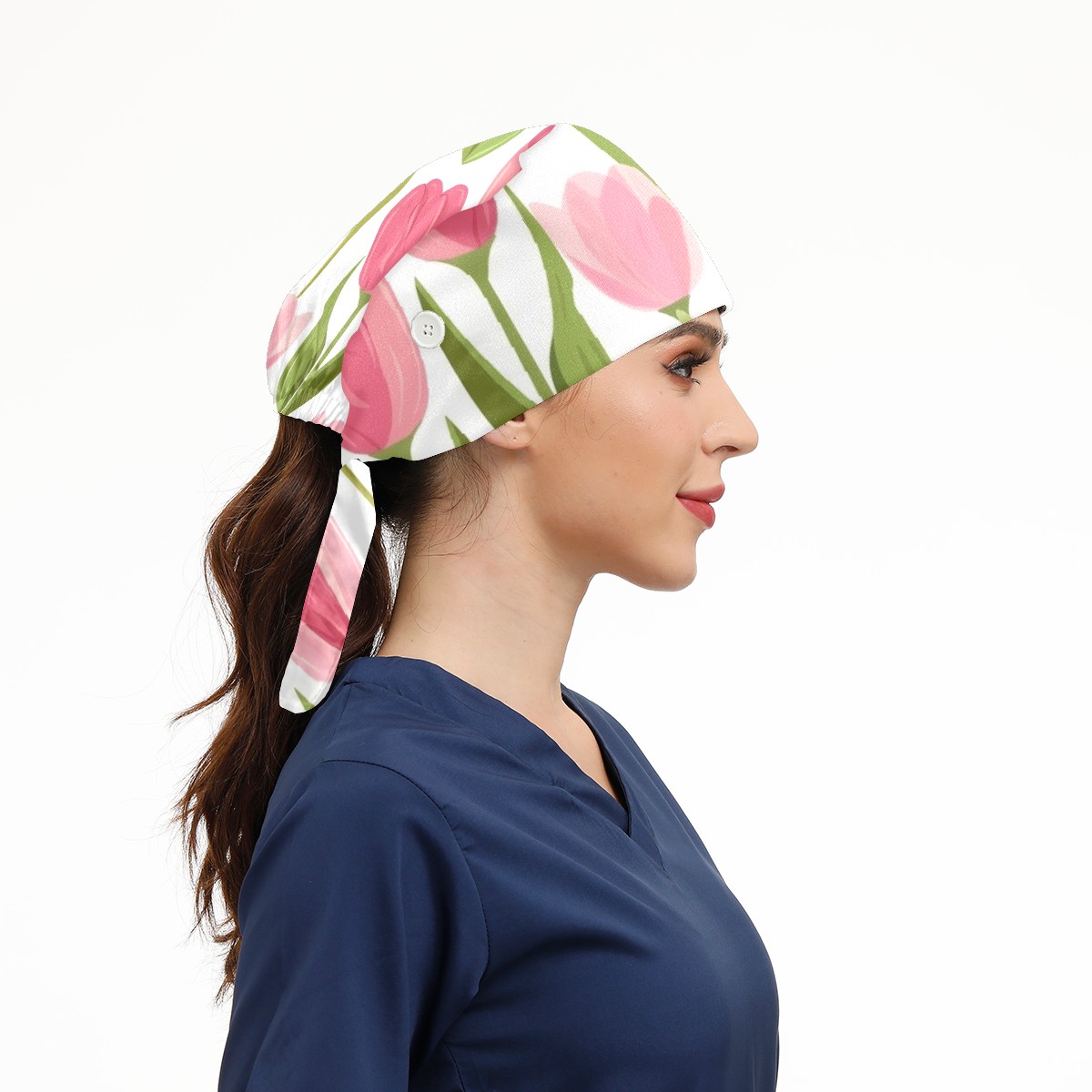 Working Caps with Button & Sweatband Satin Lined Cotton Adjustable Nurse Hats Elastic Band Scrub Cap Surgeon Hat Flower Tulip