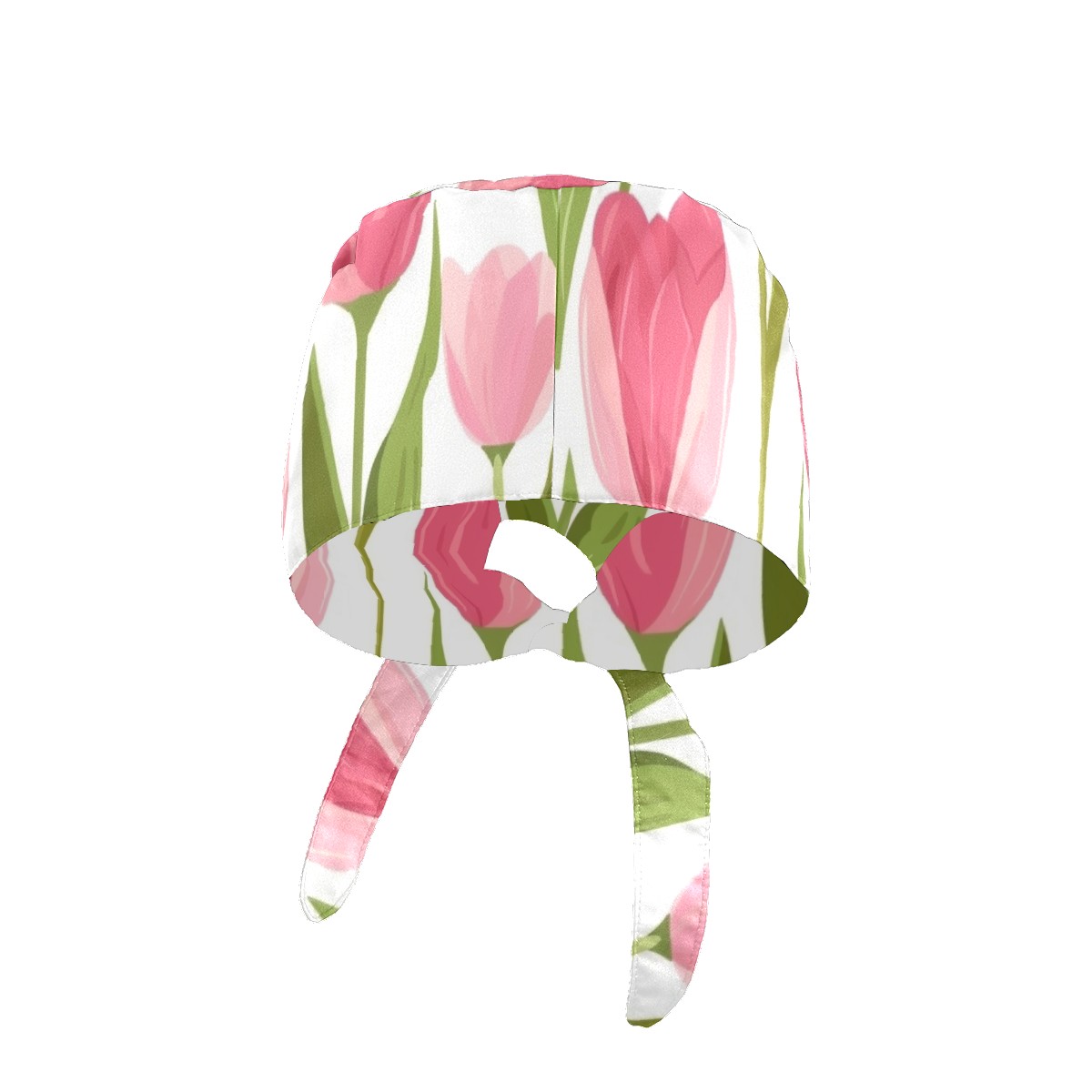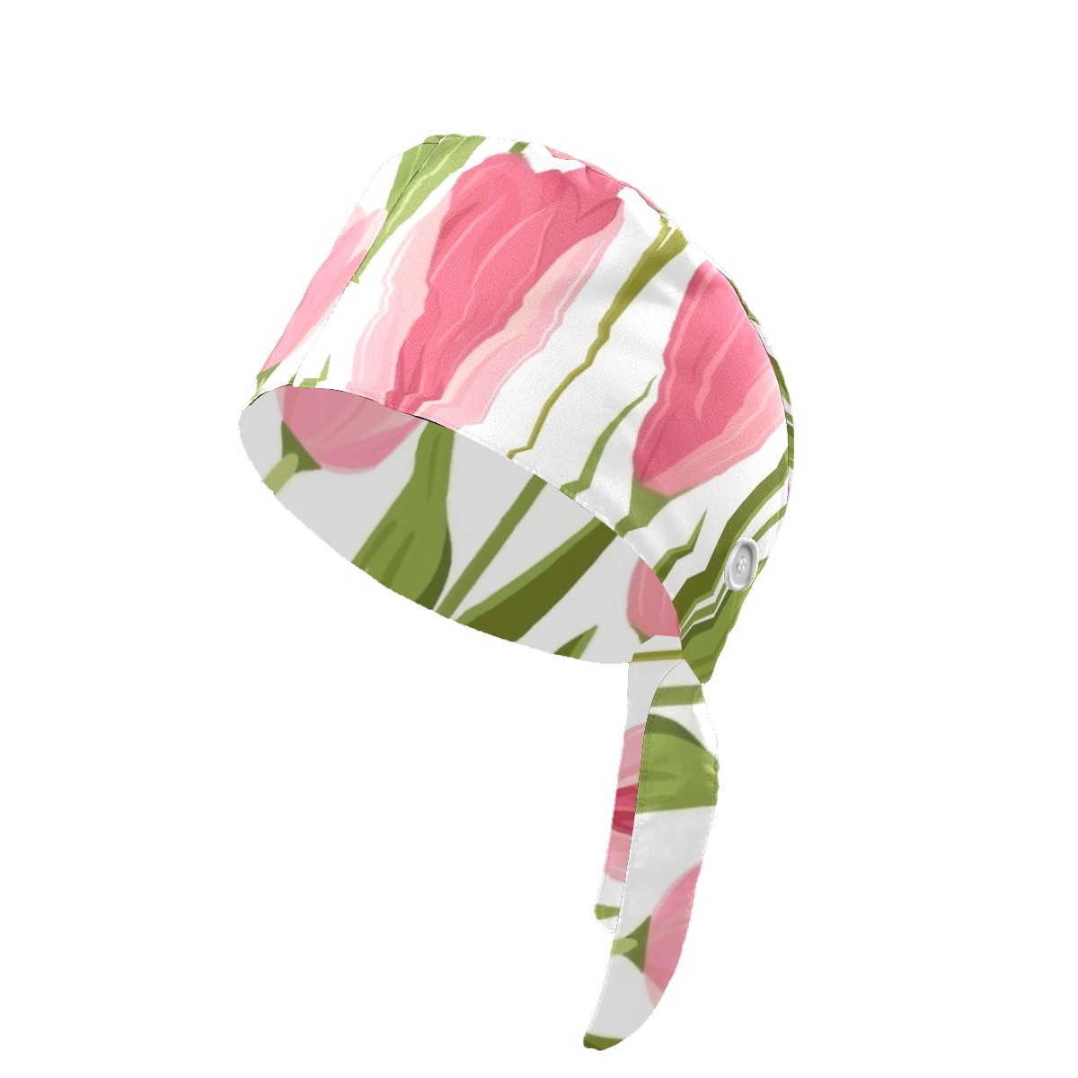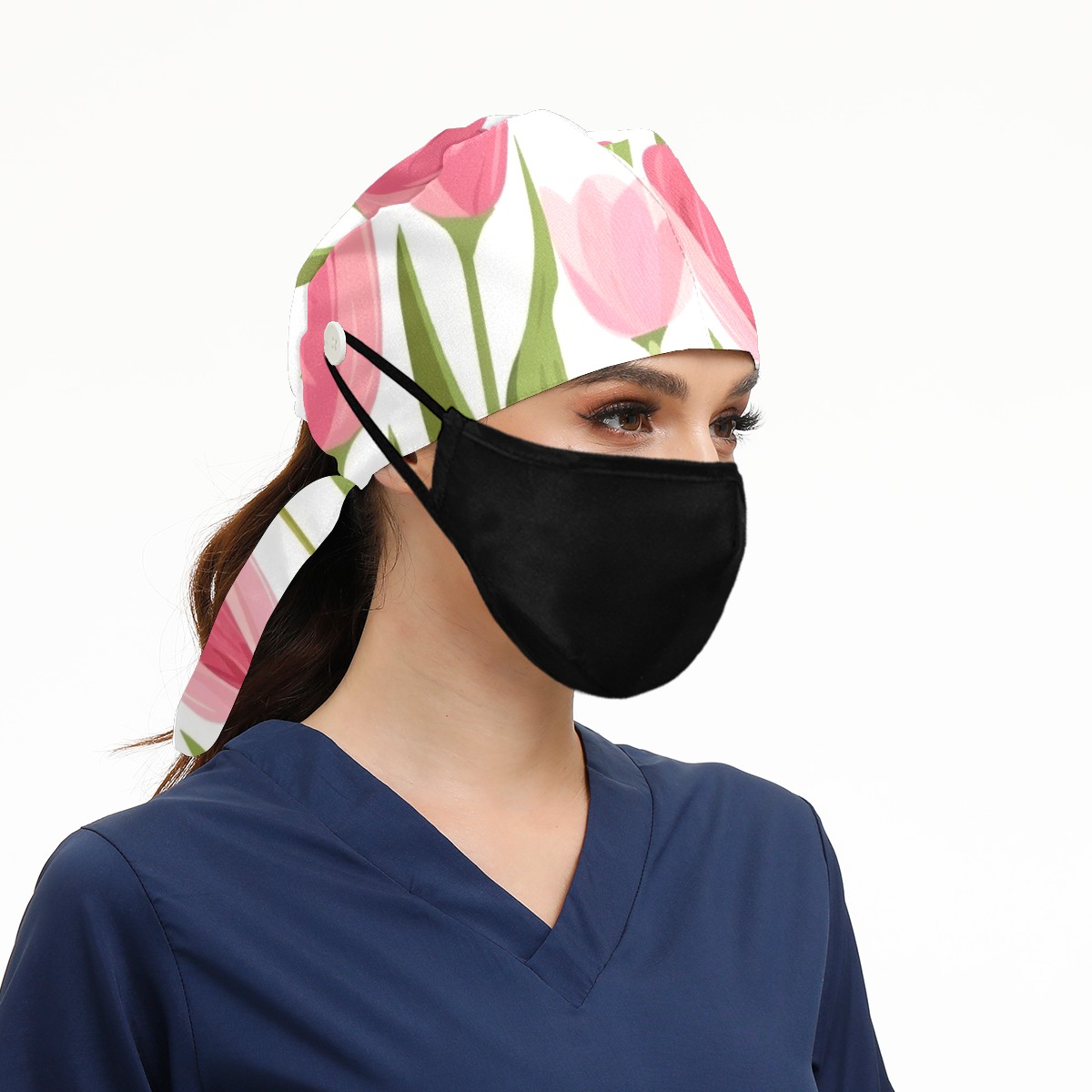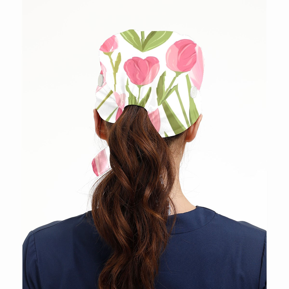 Working Caps with Button & Sweatband Satin Lined Cotton Adjustable Nurse Hats Elastic Band Scrub Cap Surgeon Hat Flower Tulip