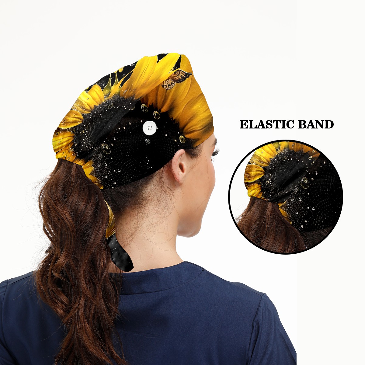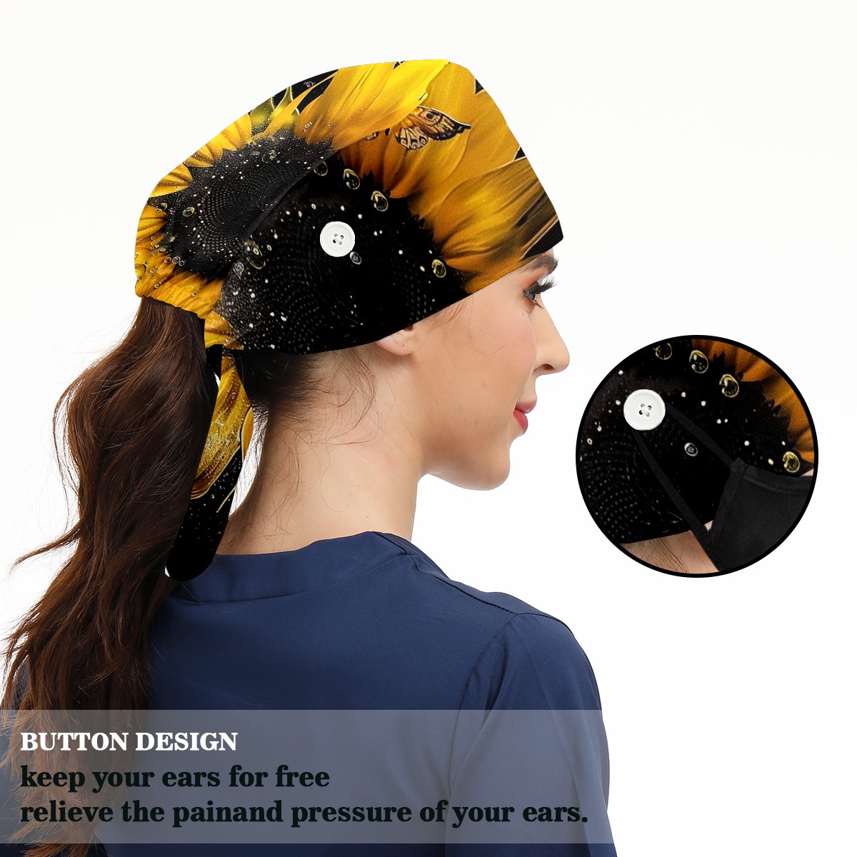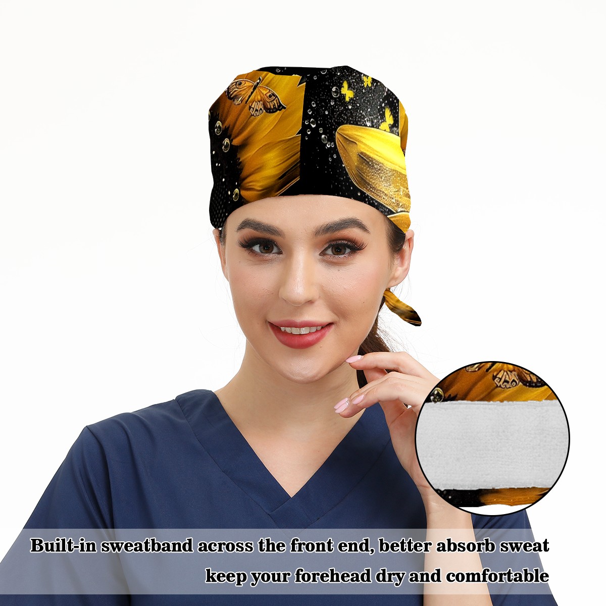 Working Caps with Button & Sweatband Satin Lined Cotton Adjustable Nurse Hats Elastic Band Scrub Cap Surgeon Hat Daisy