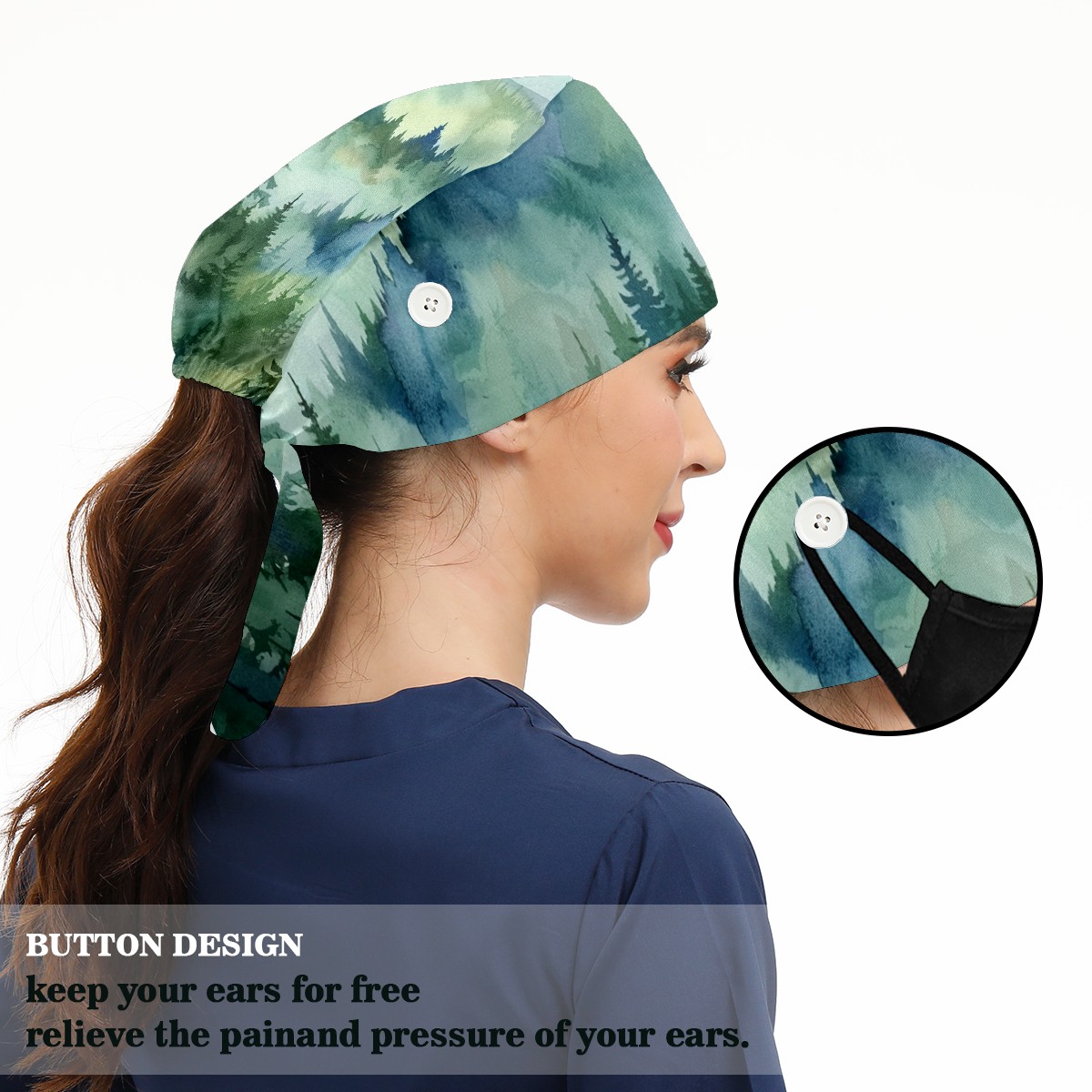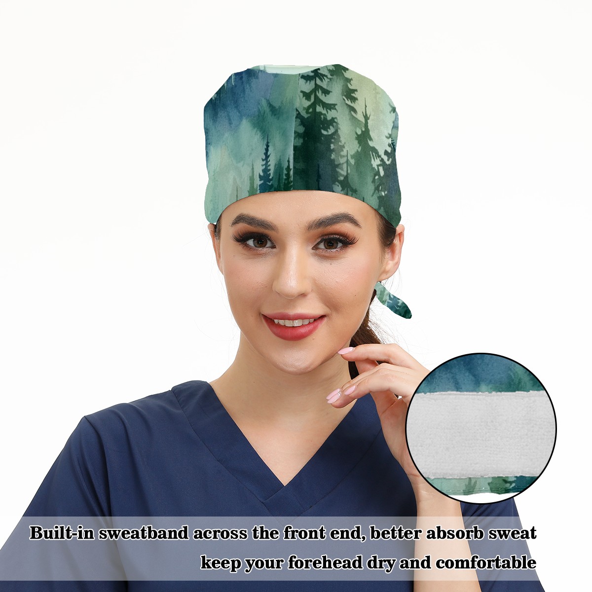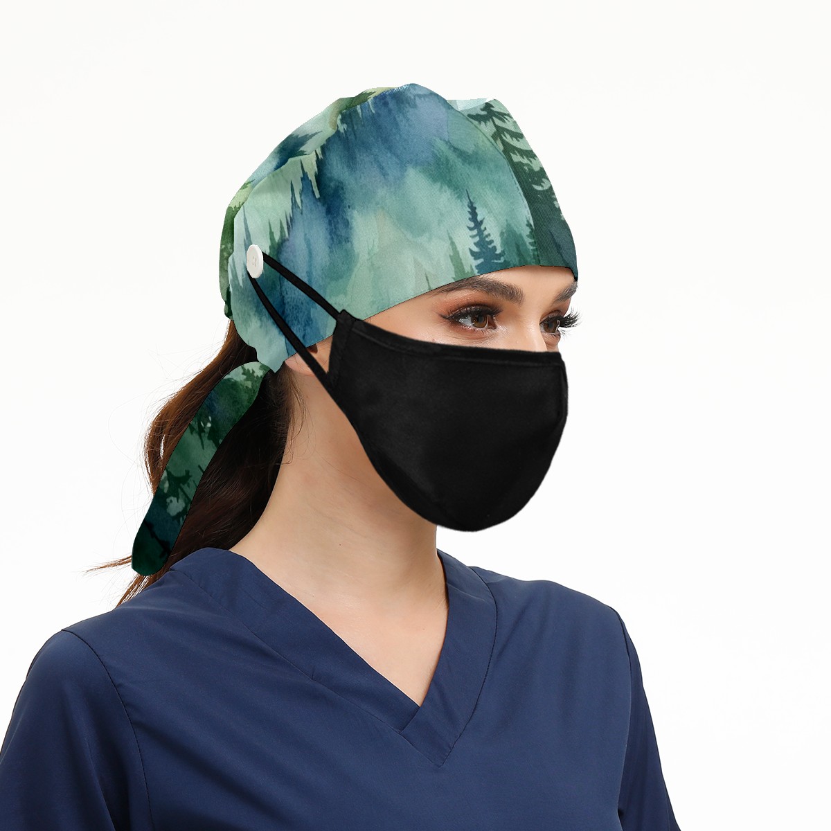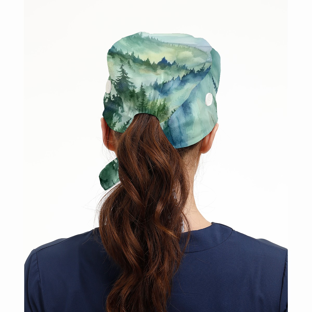Working Caps with Button & Sweatband Satin Lined Cotton Adjustable Nurse Hats Elastic Band Scrub Cap Surgeon Hat Painting Moutain