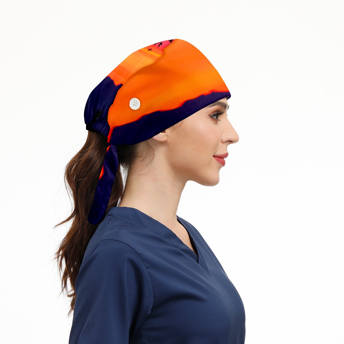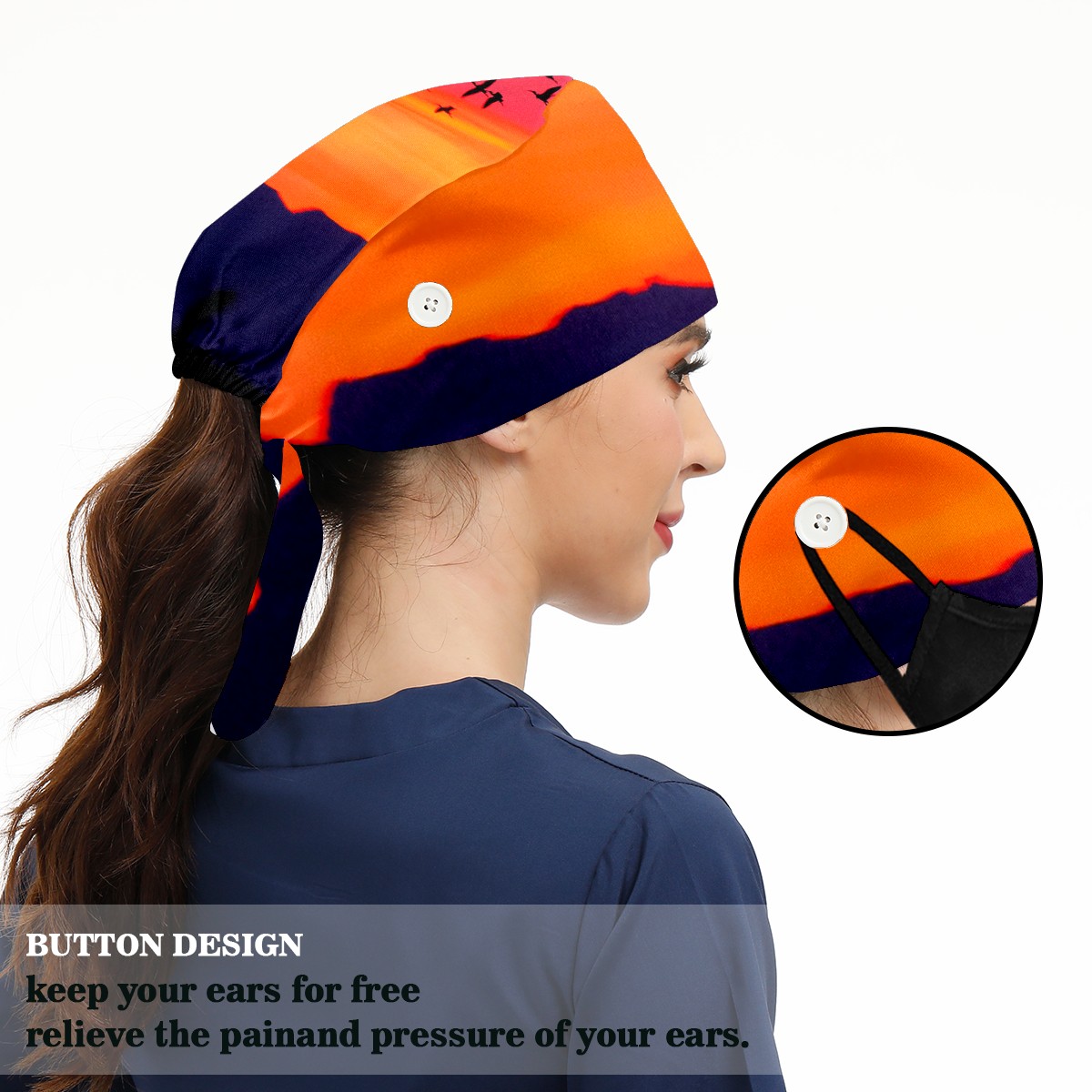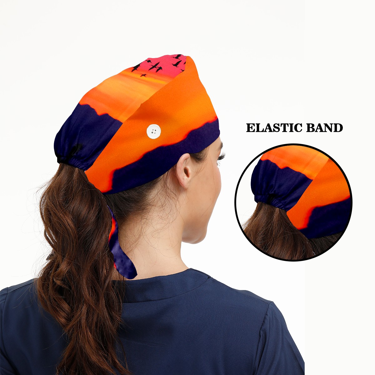 Working Caps with Button & Sweatband Satin Lined Cotton Adjustable Nurse Hats Elastic Band Scrub Cap Surgeon Hat Sea Sunset