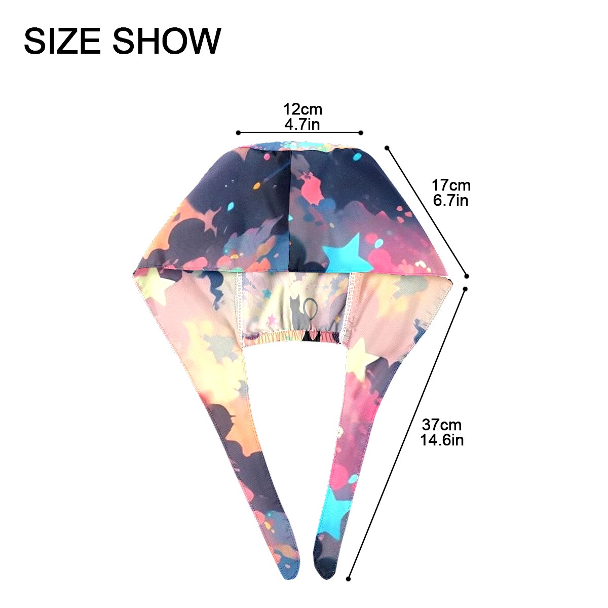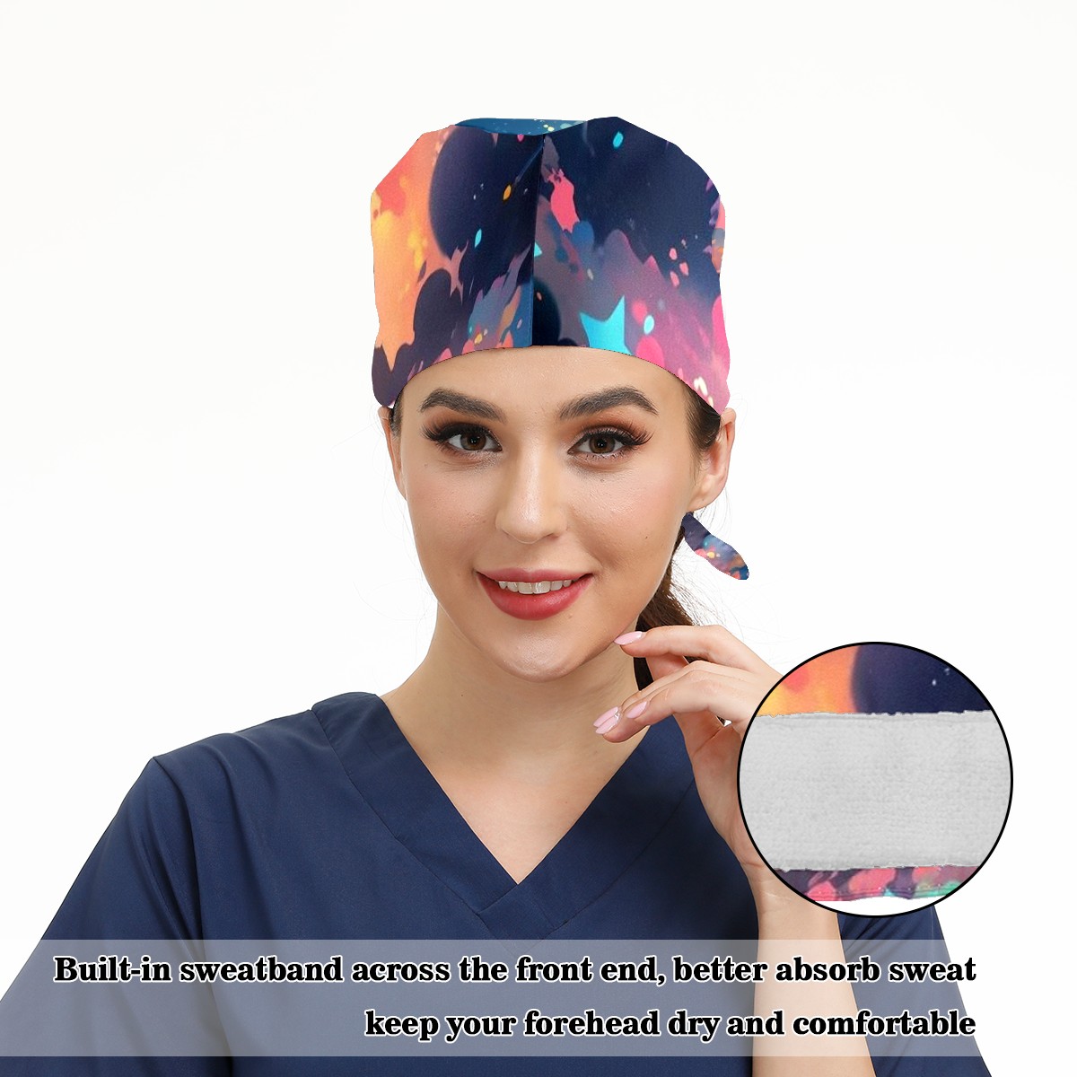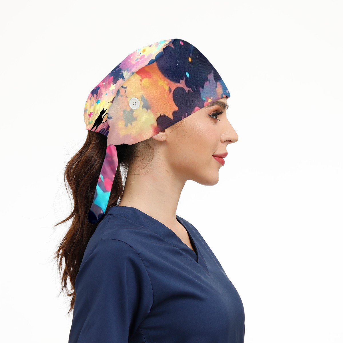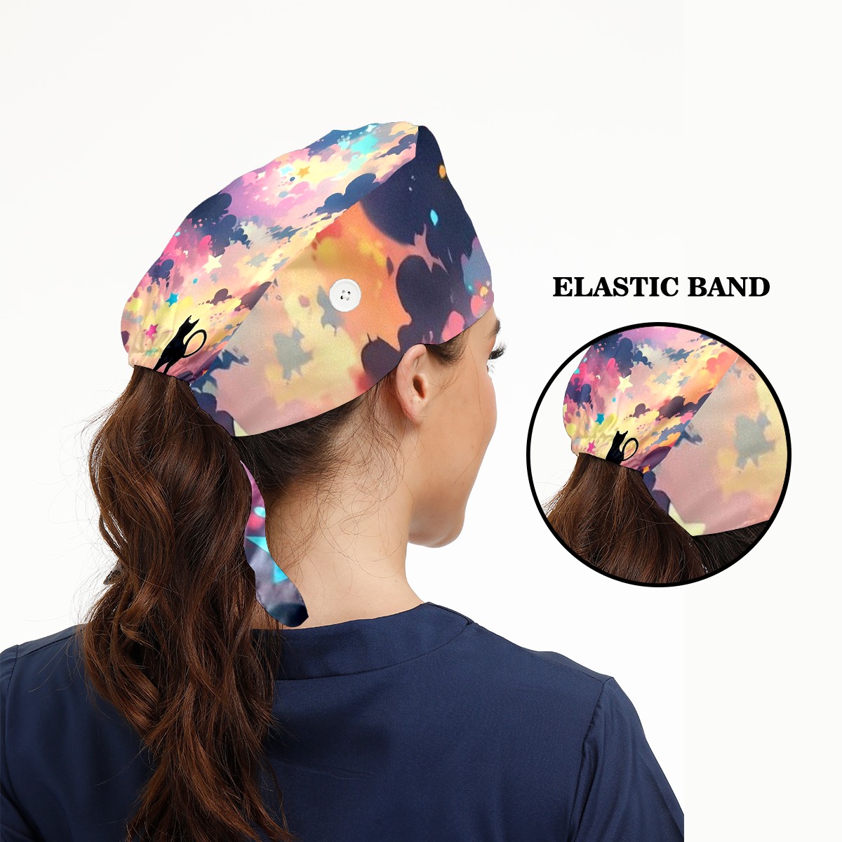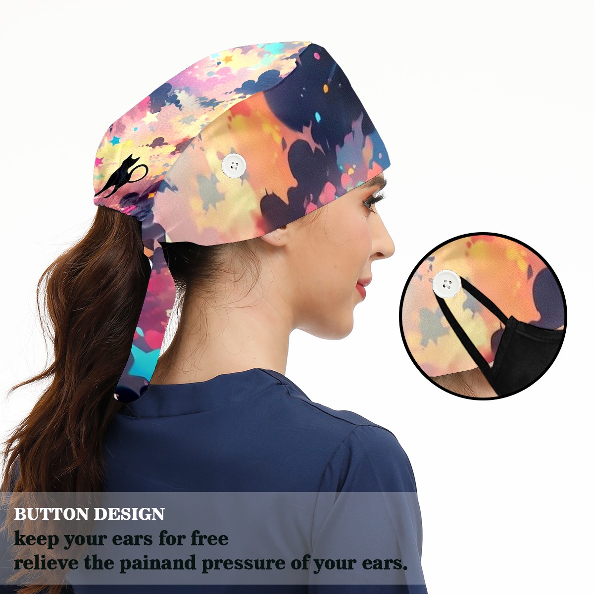 Working Caps with Button & Sweatband Satin Lined Cotton Adjustable Nurse Hats Elastic Band Scrub Cap Surgeon Hat Cat Starry Sky