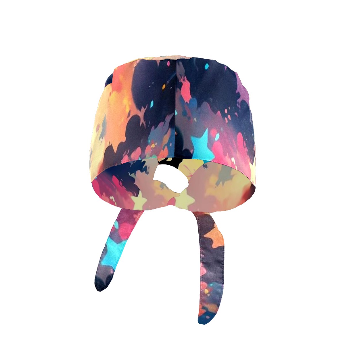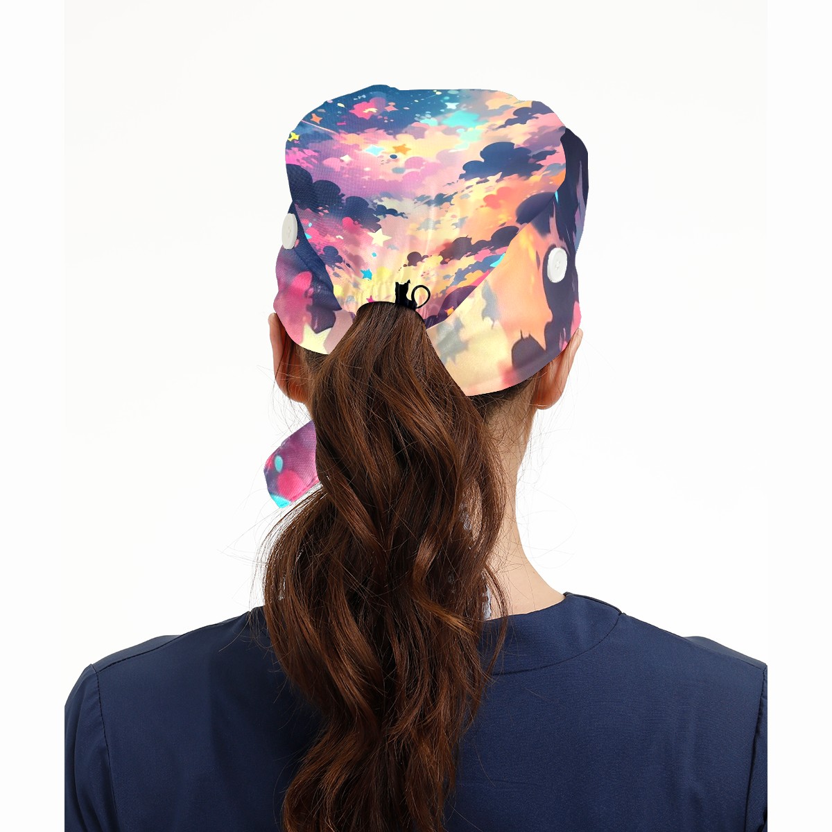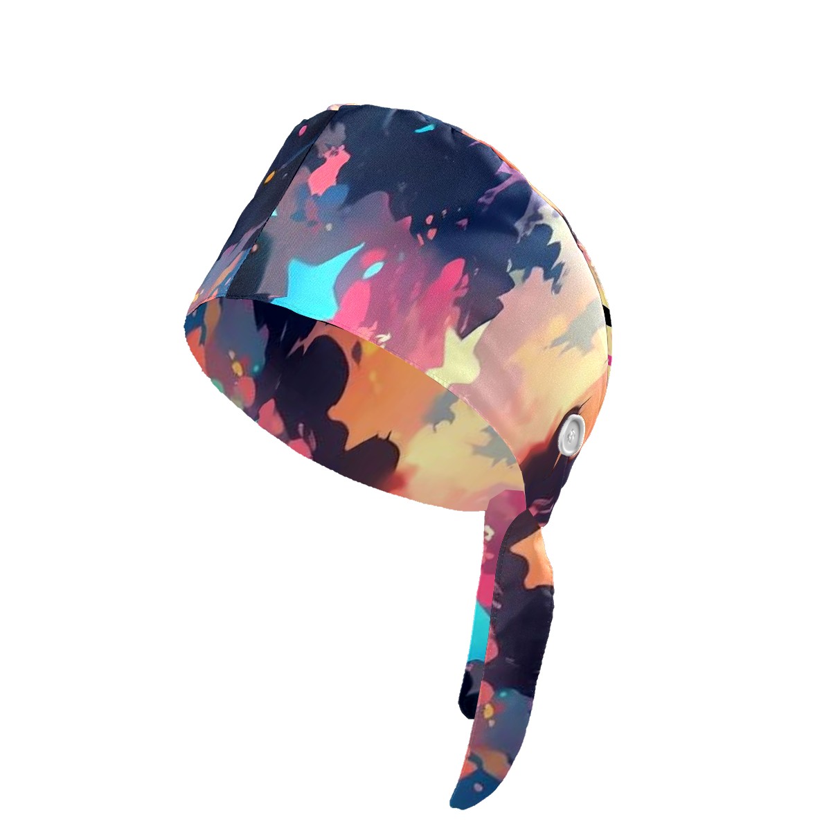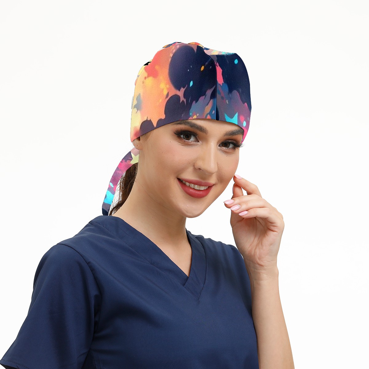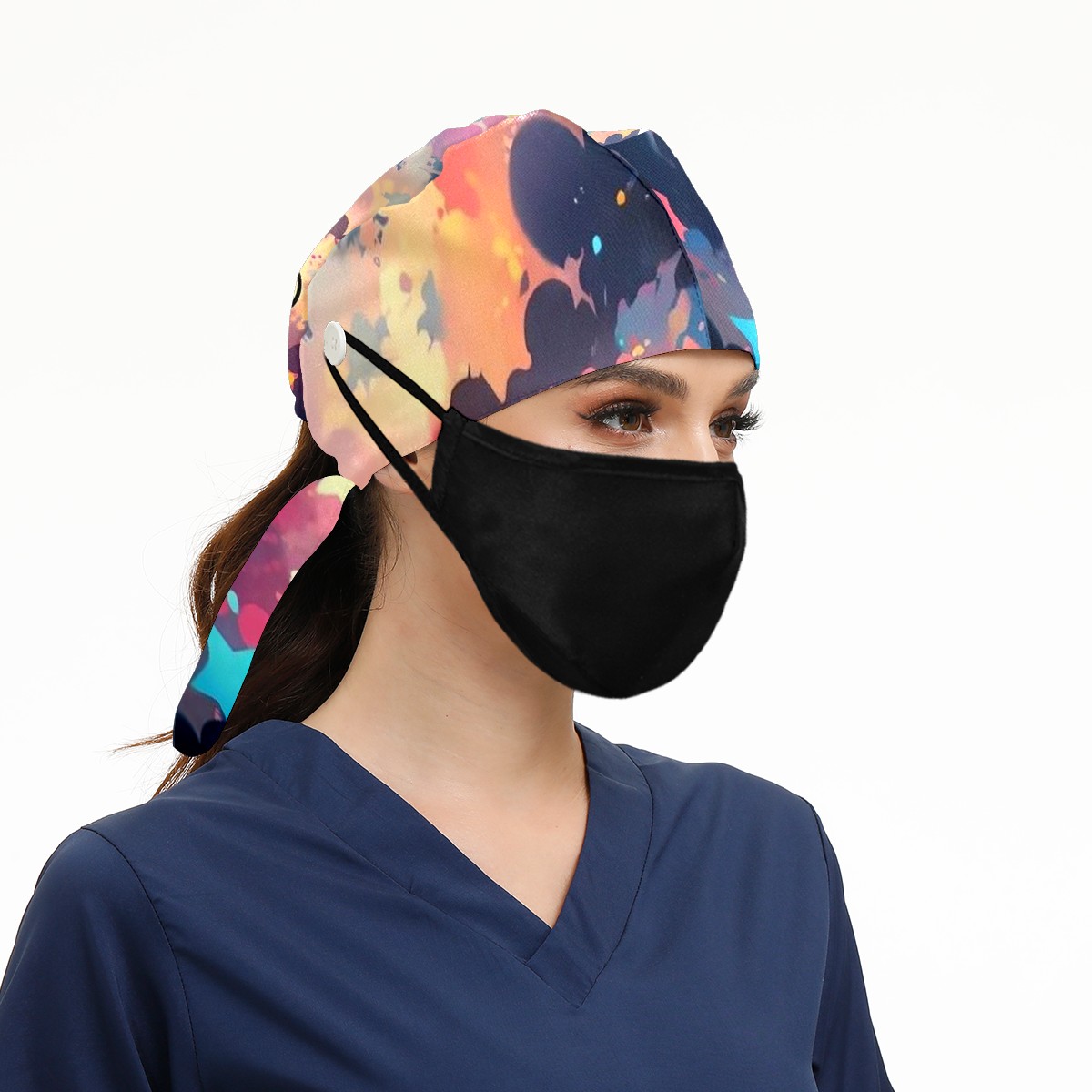 Working Caps with Button & Sweatband Satin Lined Cotton Adjustable Nurse Hats Elastic Band Scrub Cap Surgeon Hat Cat Starry Sky