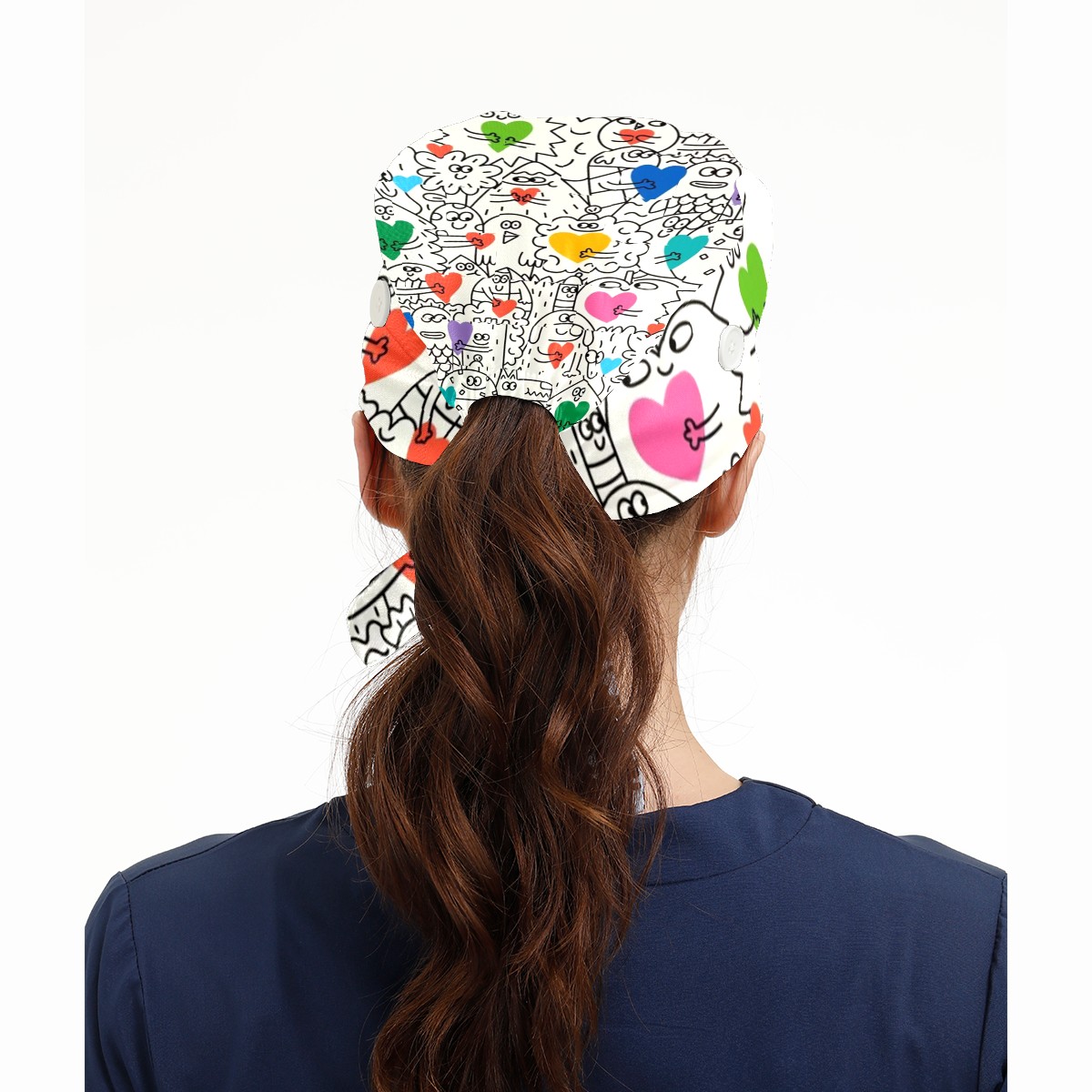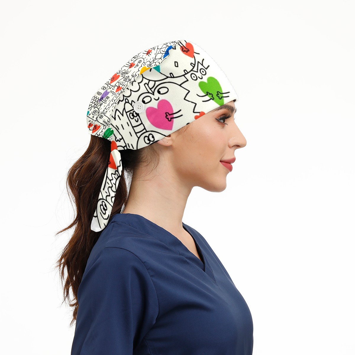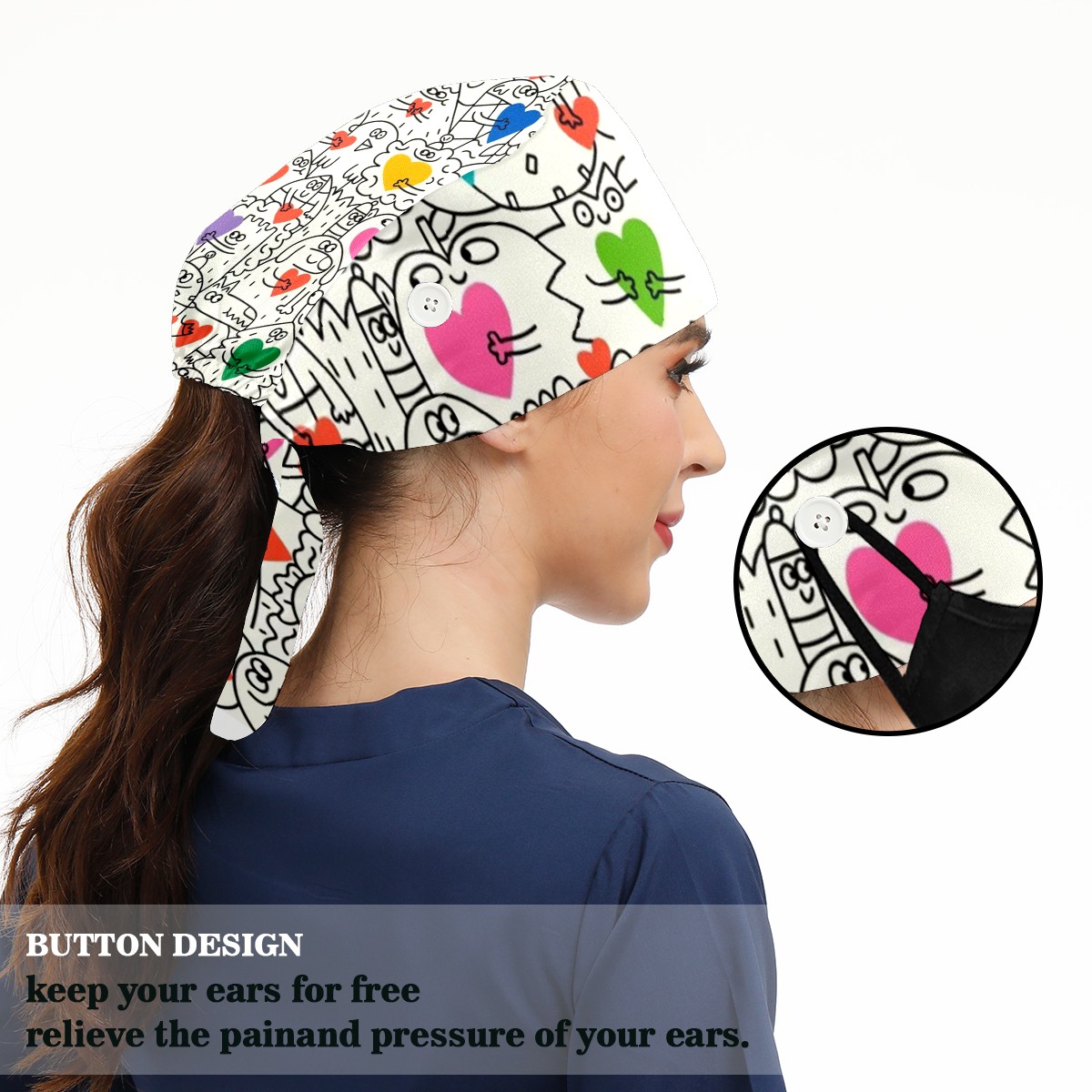 Working Caps with Button & Sweatband Satin Lined Cotton Adjustable Nurse Hats Elastic Band Scrub Cap Surgeon Hat Seamless Love
