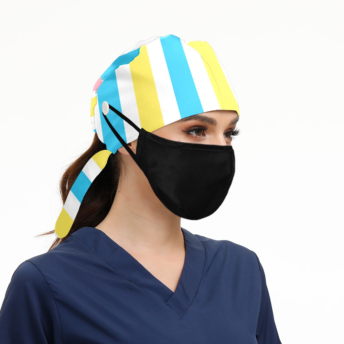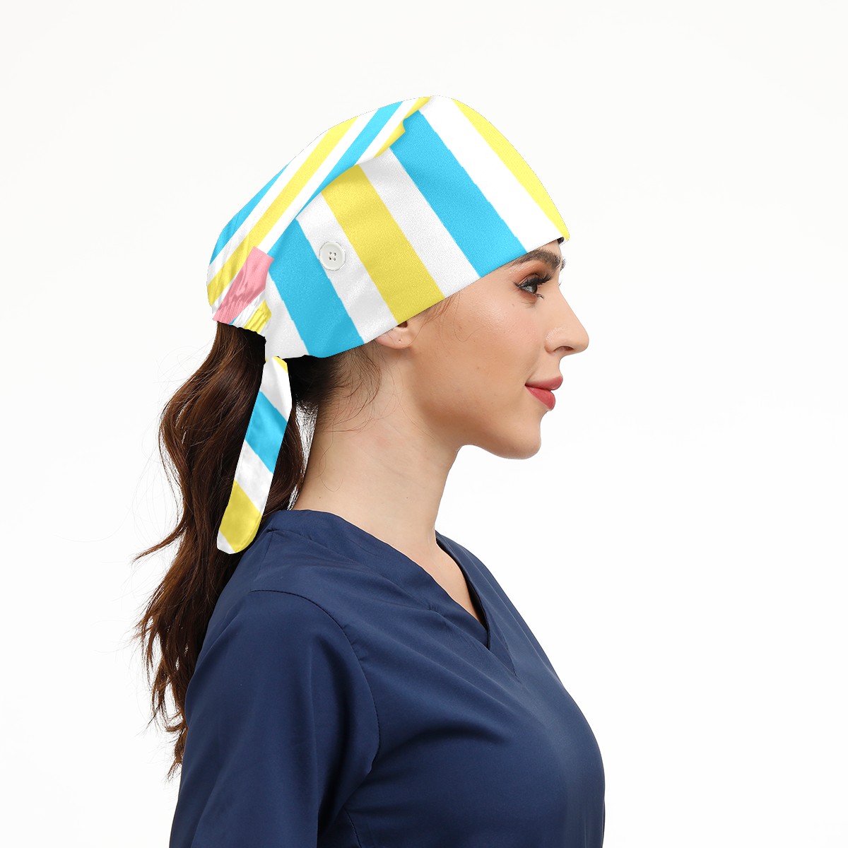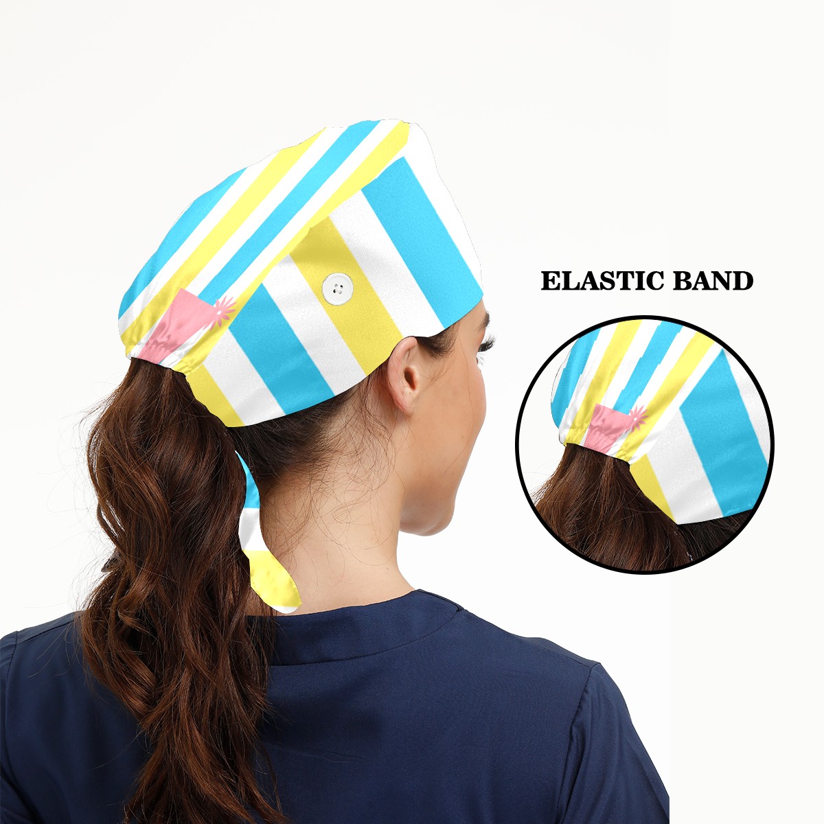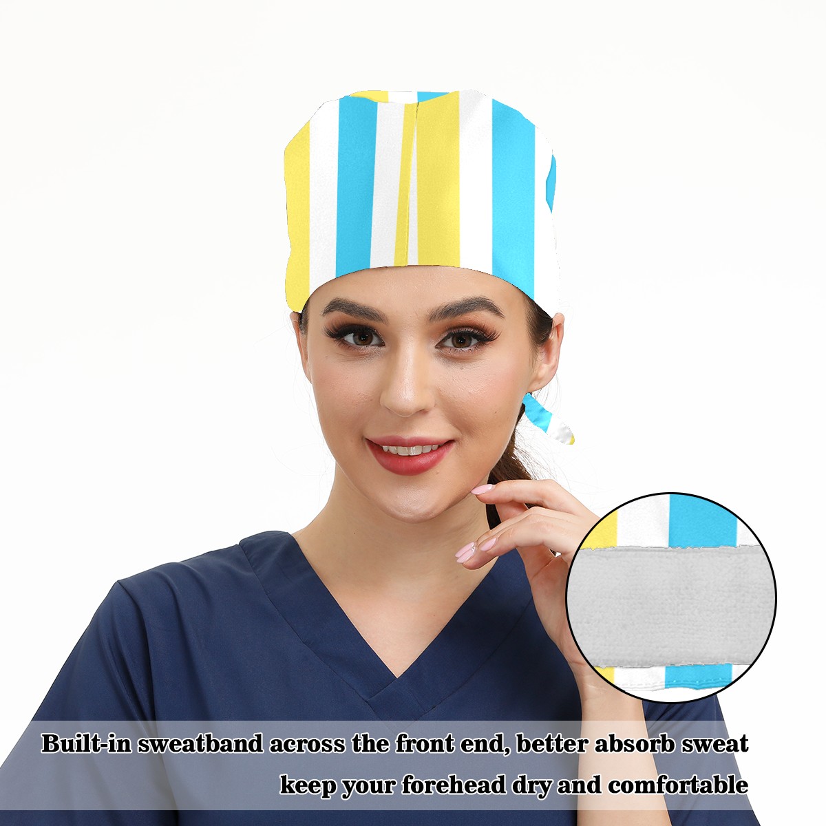 Working Caps with Button & Sweatband Satin Lined Cotton Adjustable Nurse Hats Elastic Band Scrub Cap Surgeon Hat Stripe