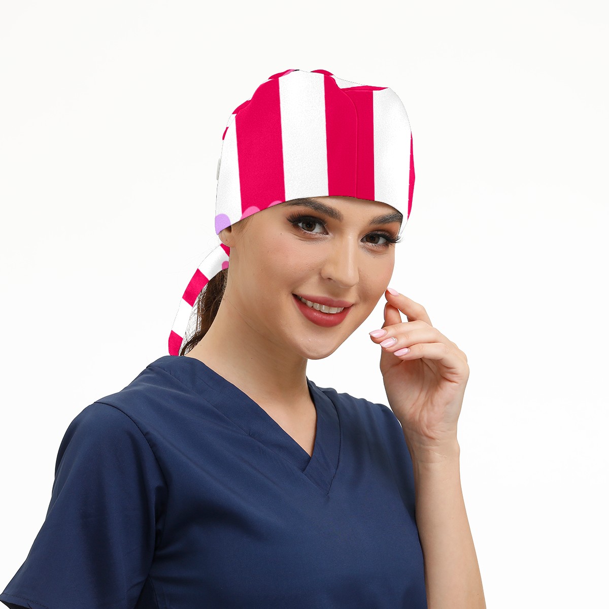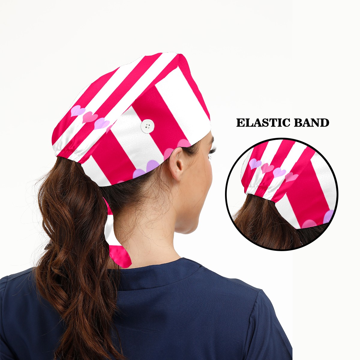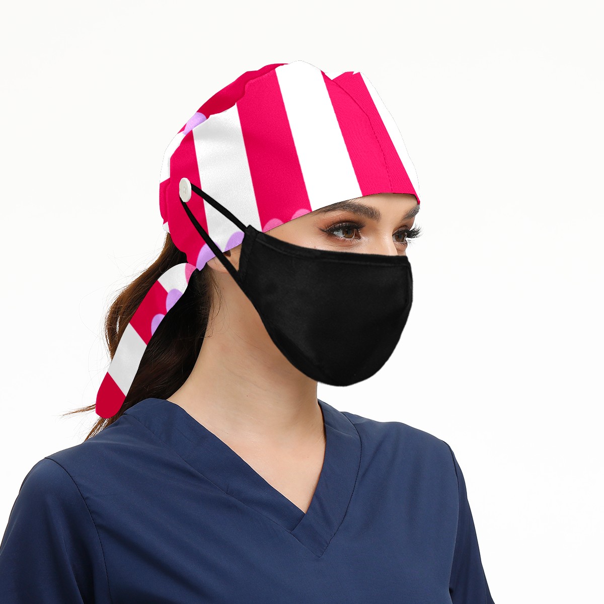 Working Caps with Button & Sweatband Satin Lined Cotton Adjustable Nurse Hats Elastic Band Scrub Cap Surgeon Hat Stripes
