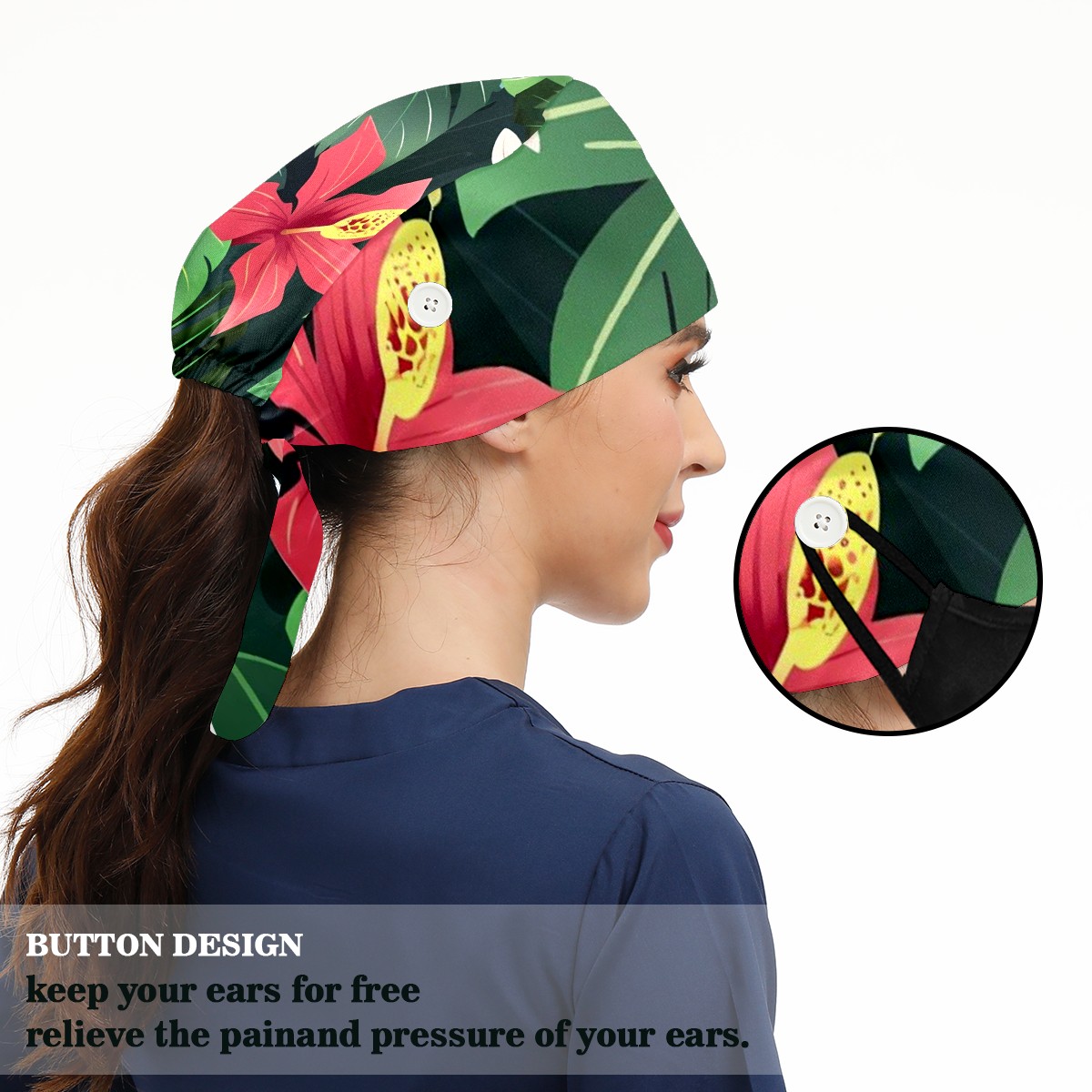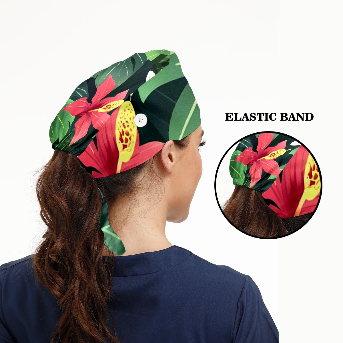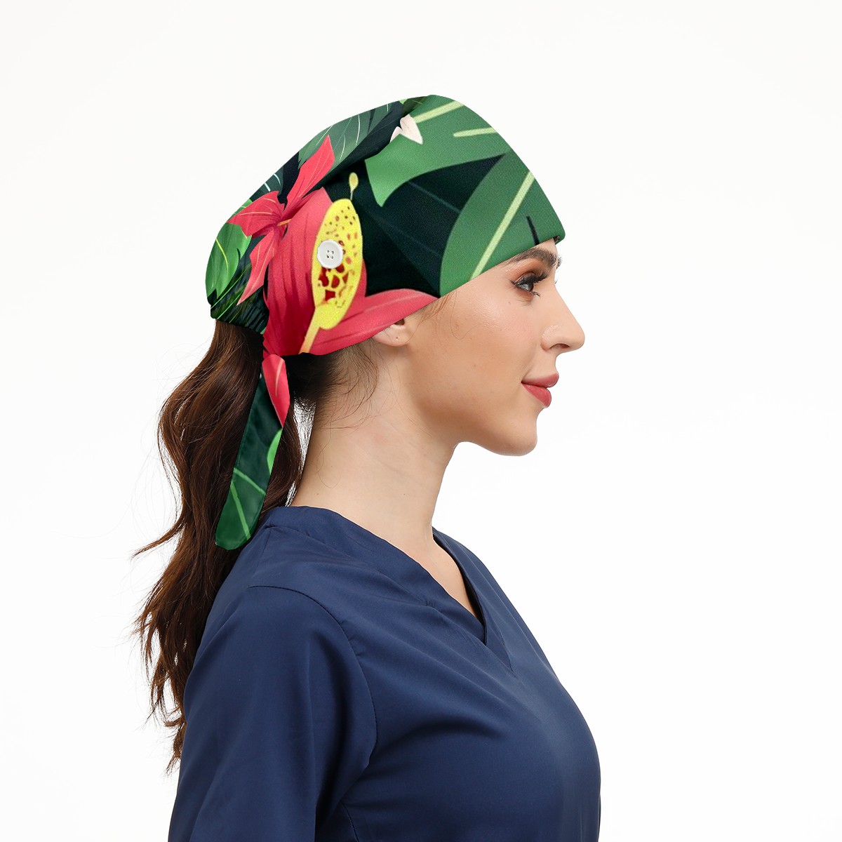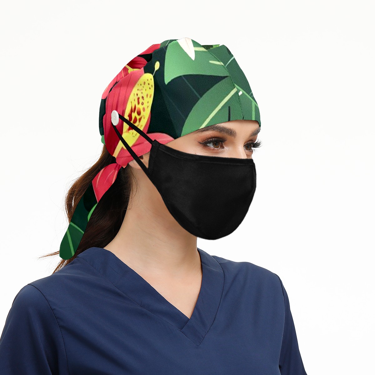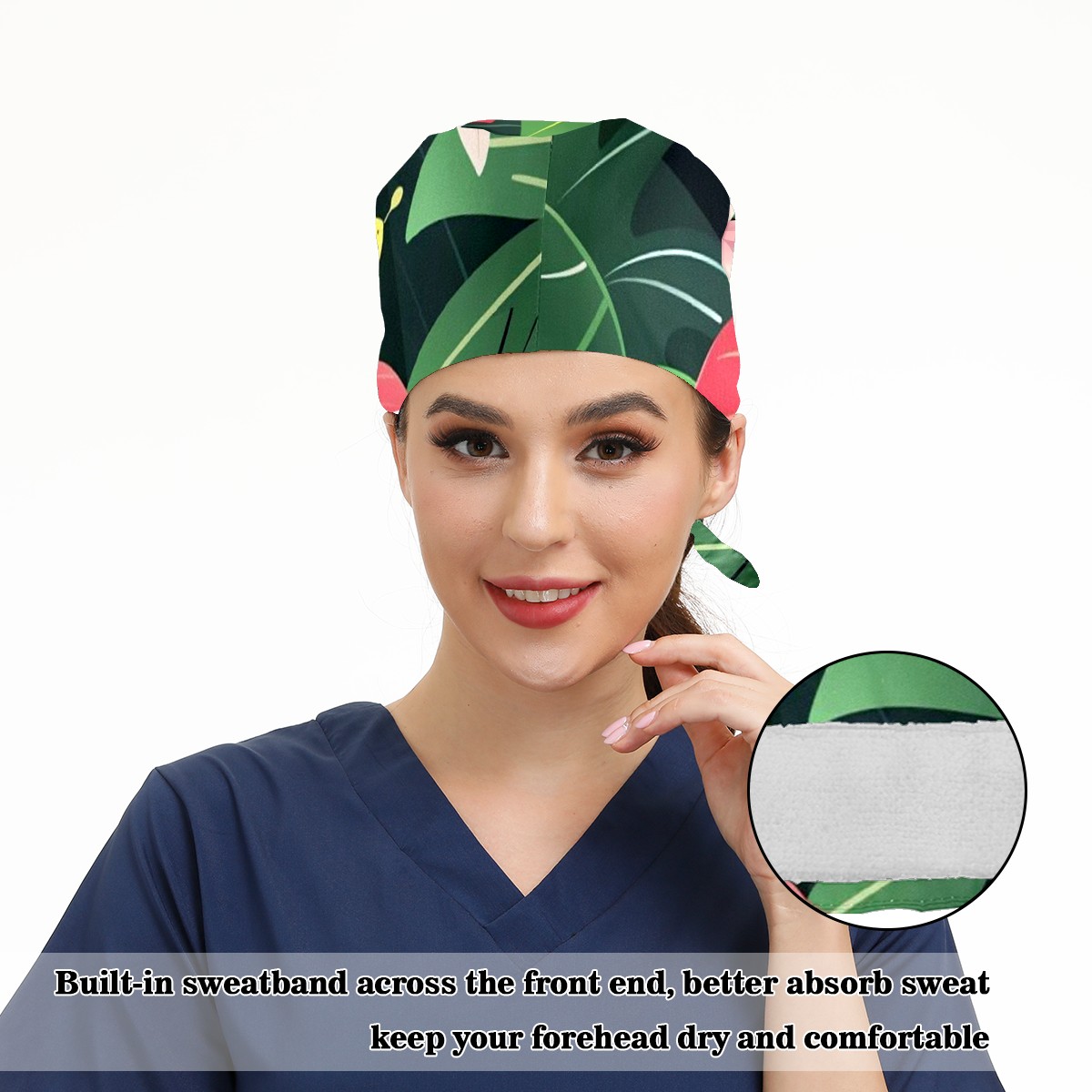 Working Caps with Button & Sweatband Satin Lined Cotton Adjustable Nurse Hats Elastic Band Scrub Cap Surgeon Hat Flower Leaves