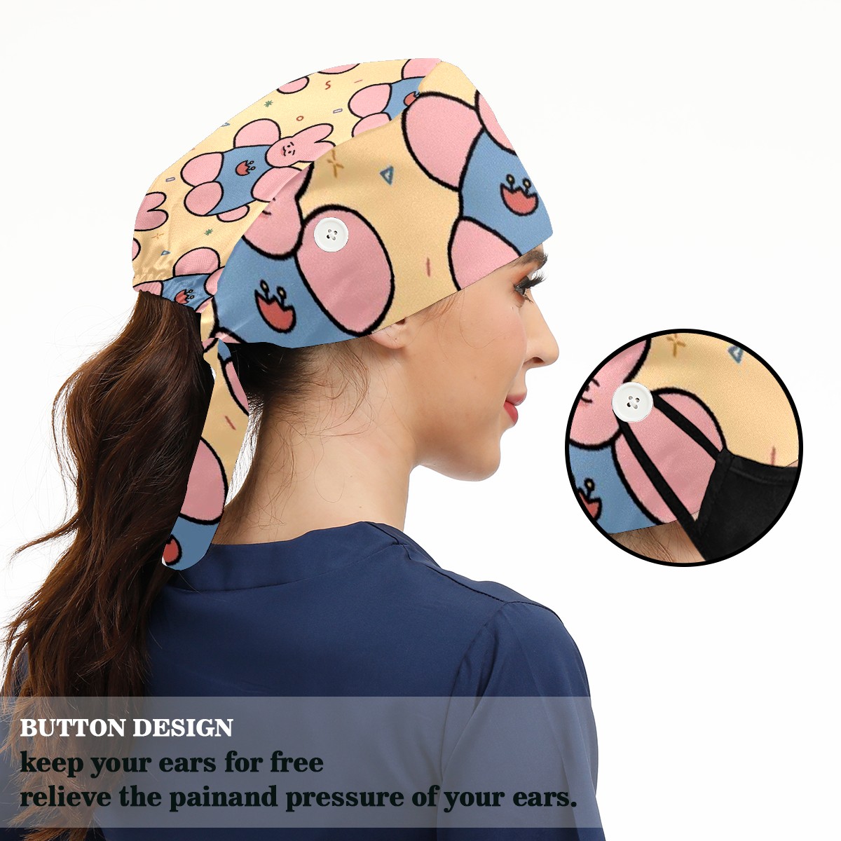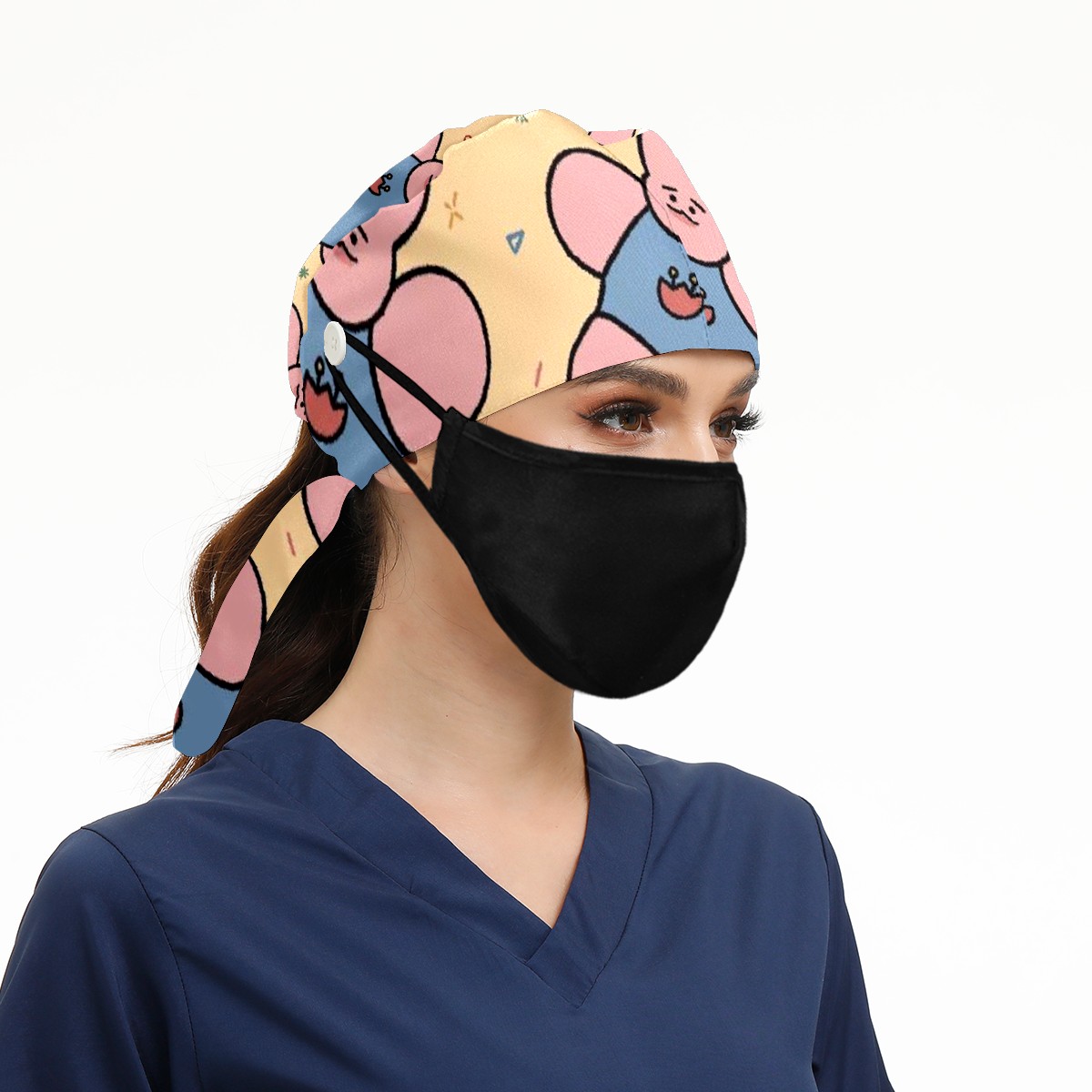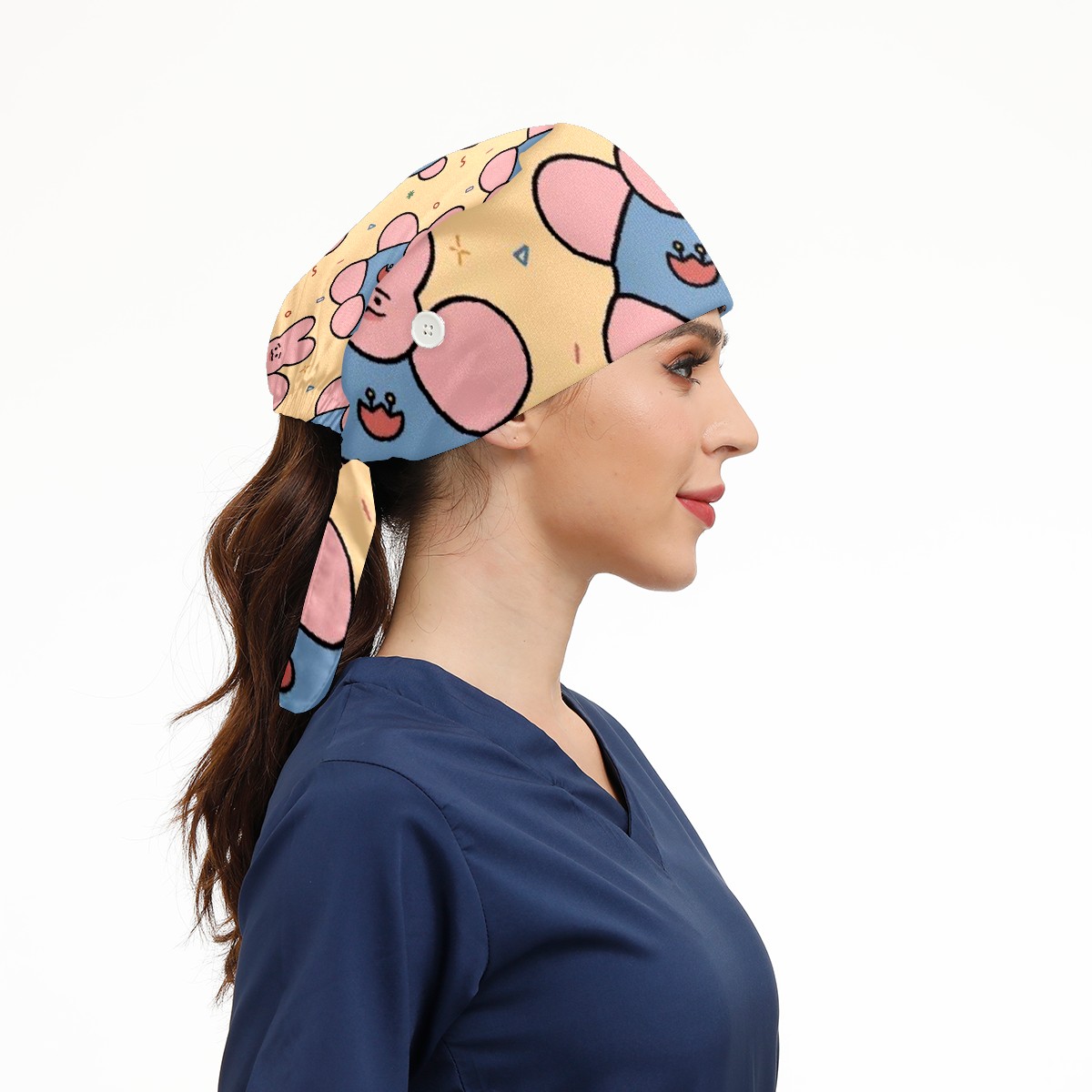 Working Caps with Button & Sweatband Satin Lined Cotton Adjustable Nurse Hats Elastic Band Scrub Cap Surgeon Hat Cloth Doll