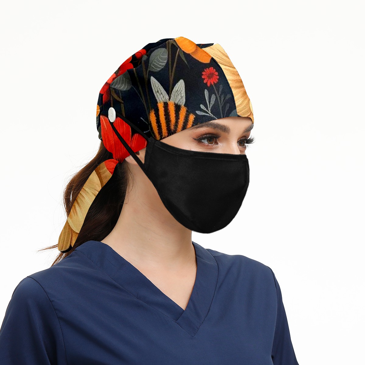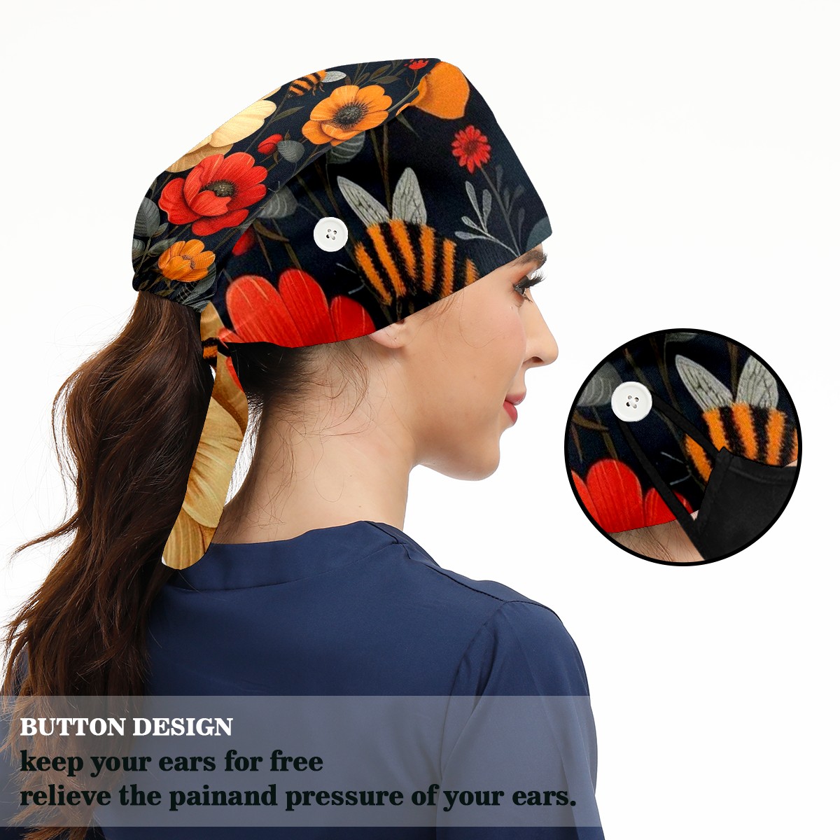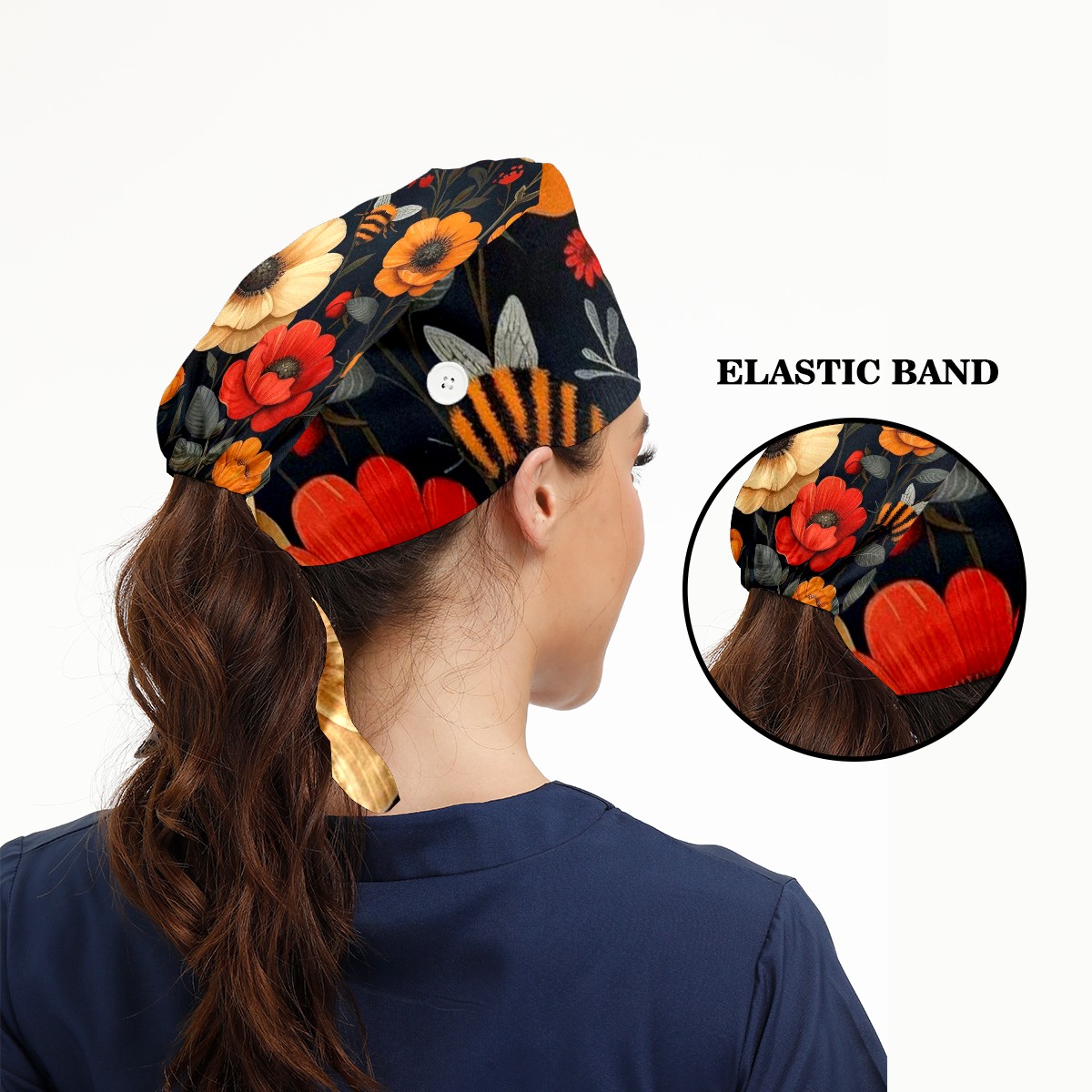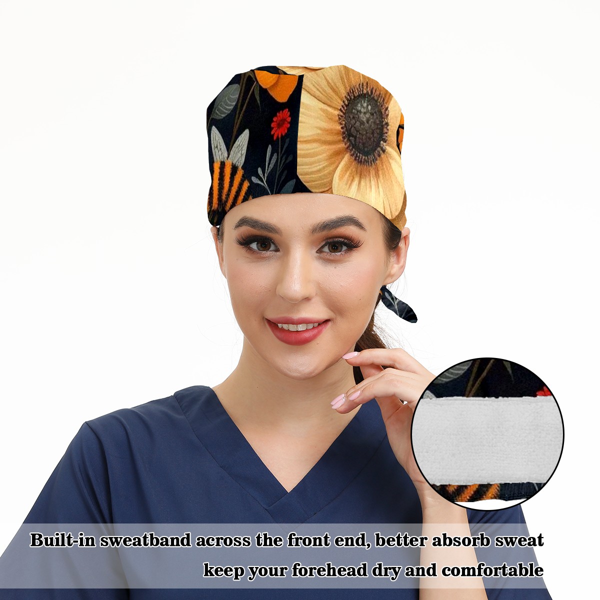 Working Caps with Button & Sweatband Satin Lined Cotton Adjustable Nurse Hats Elastic Band Scrub Cap Surgeon Hat Bee Flower
