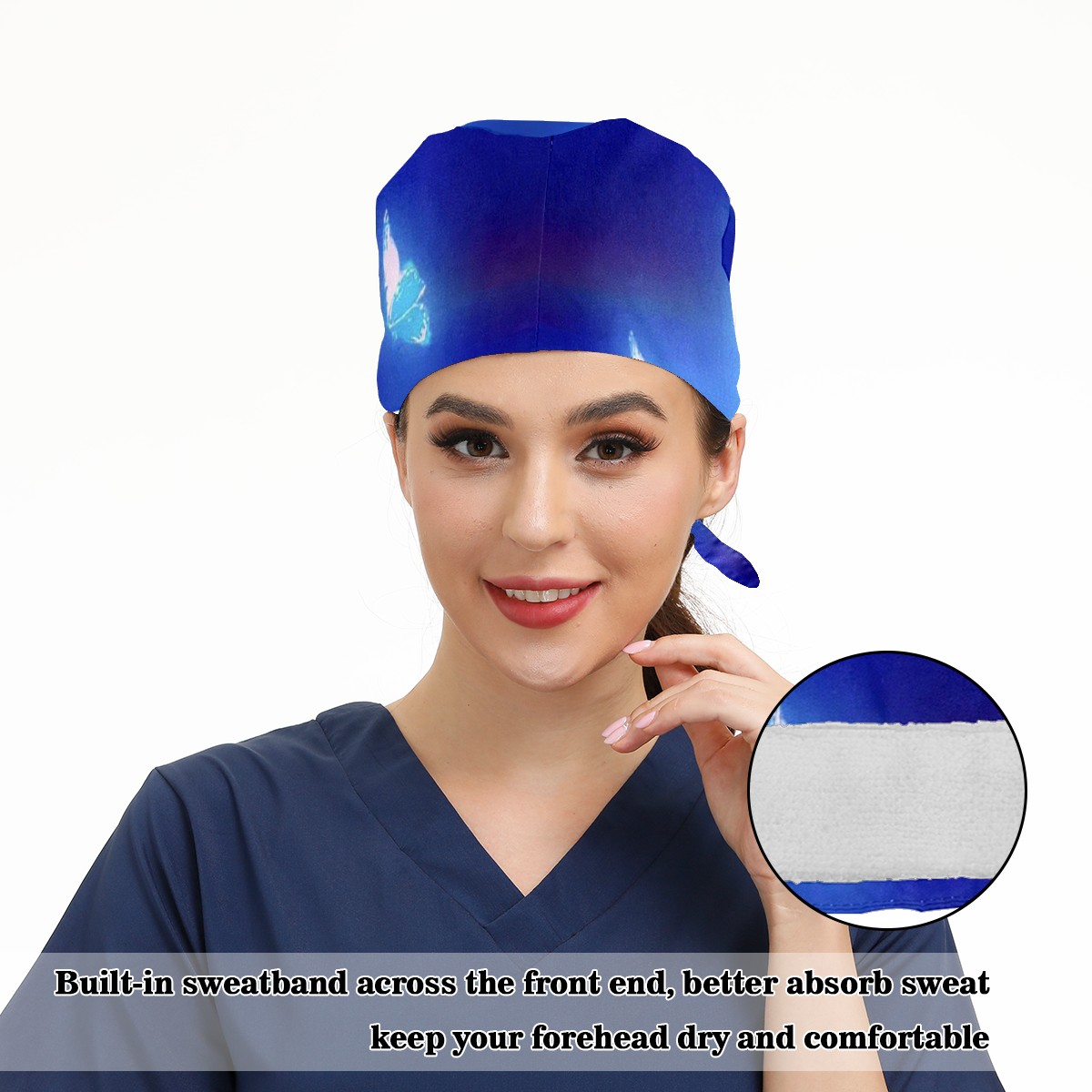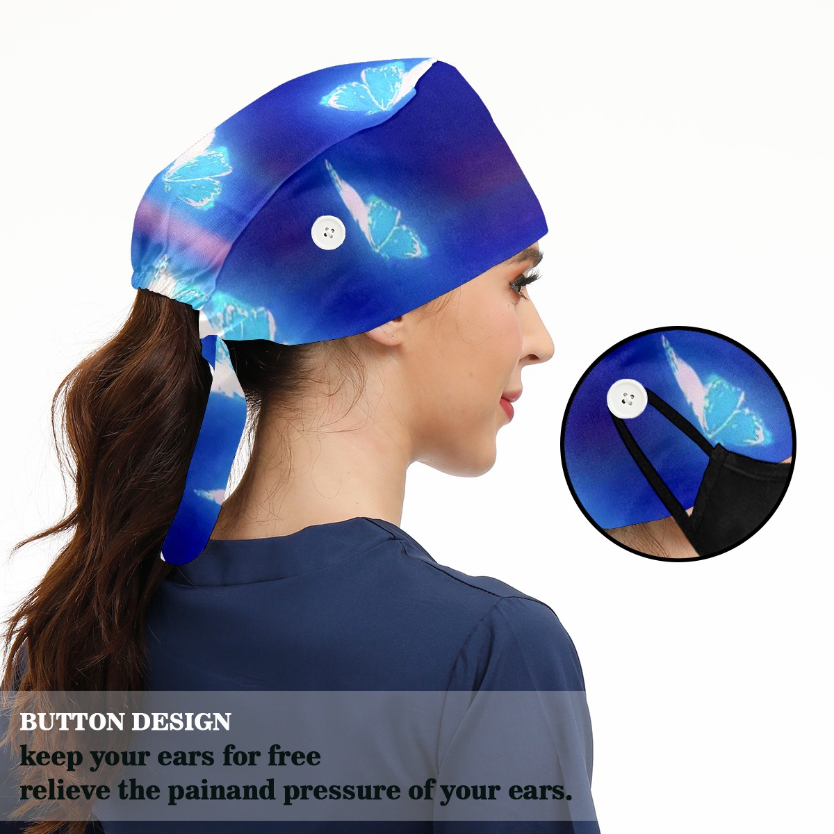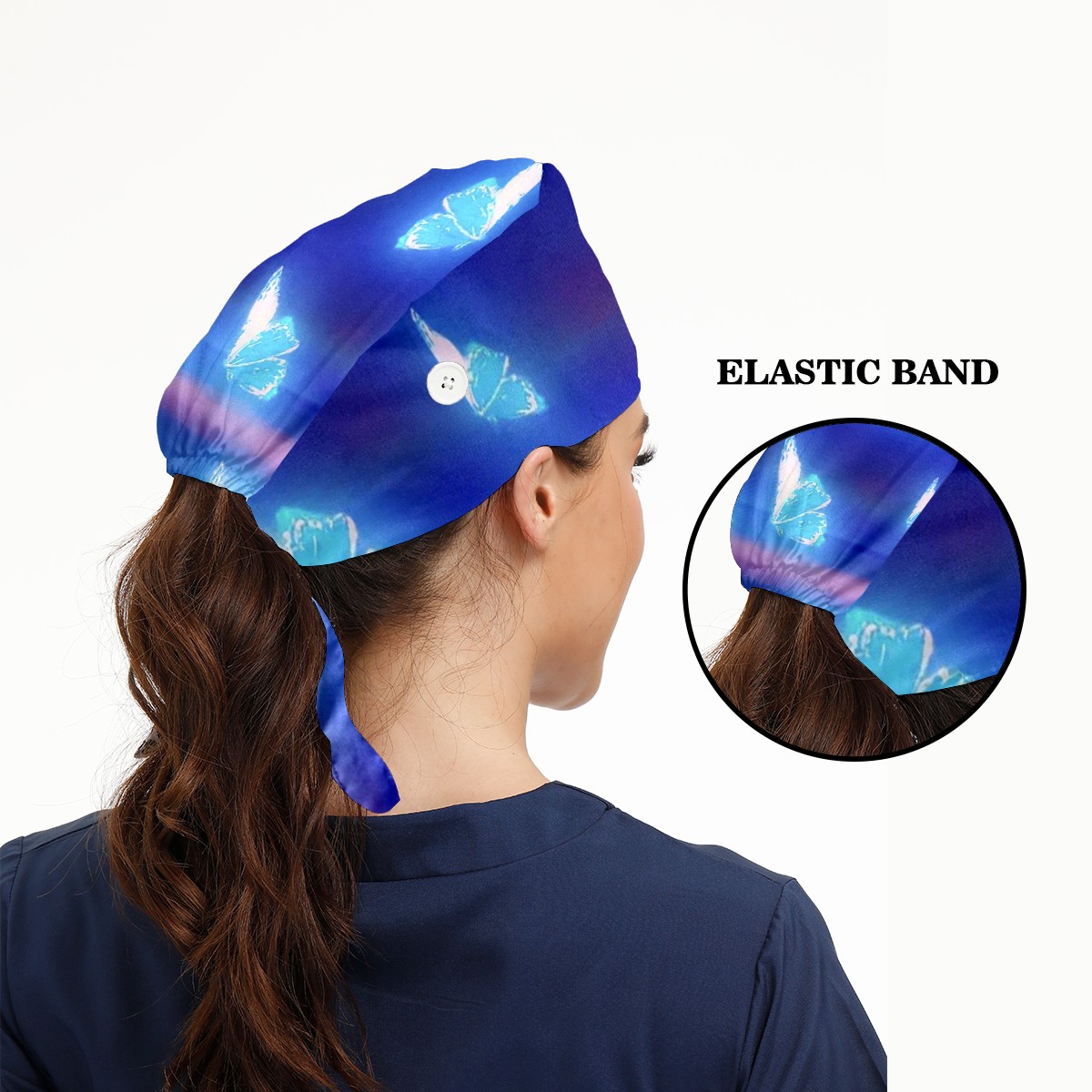 Working Caps with Button & Sweatband Satin Lined Cotton Adjustable Nurse Hats Elastic Band Scrub Cap Surgeon Hat Butterfly