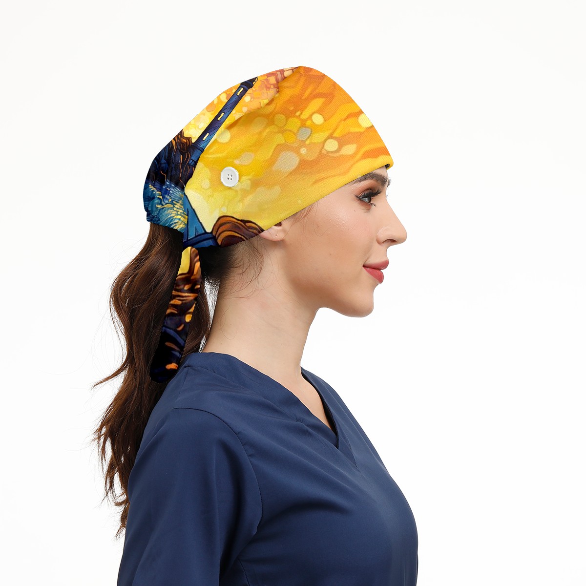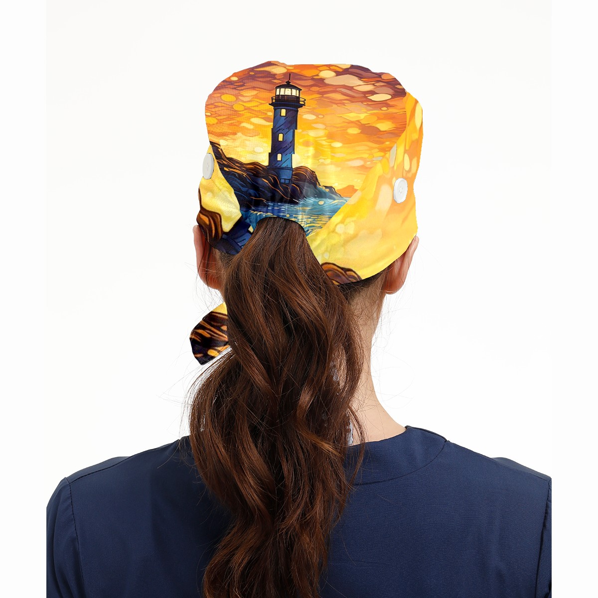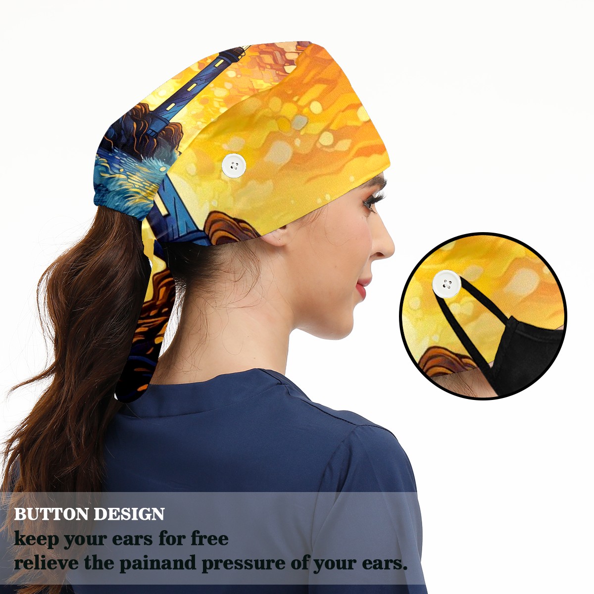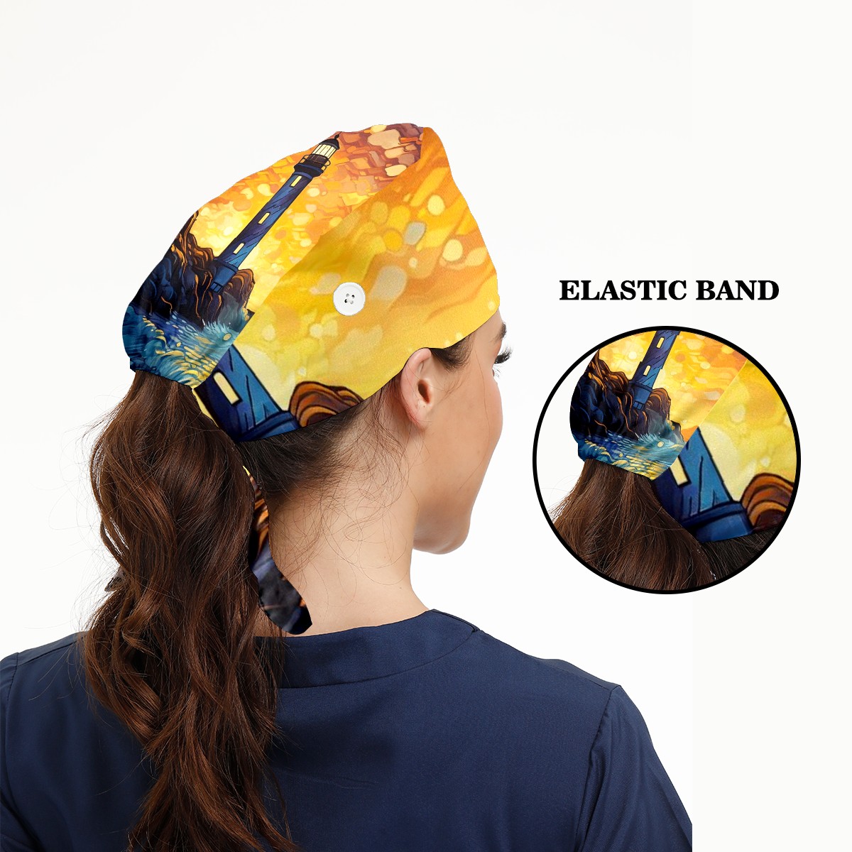 Working Caps with Button & Sweatband Satin Lined Cotton Adjustable Nurse Hats Elastic Band Scrub Cap Surgeon Hat Lighthouse Waves
