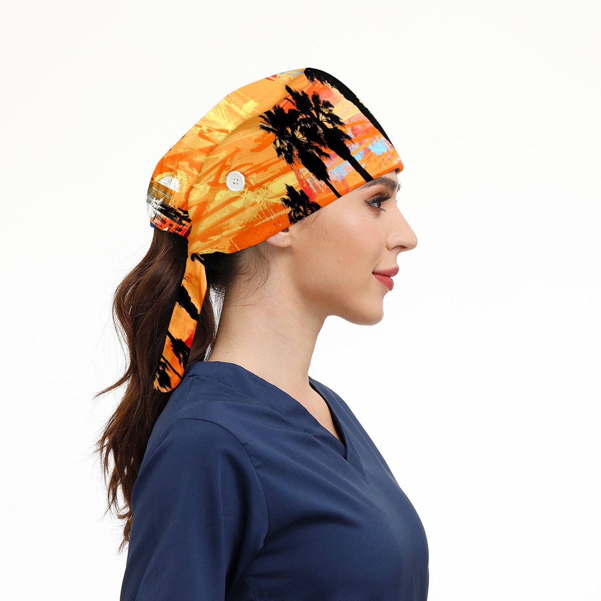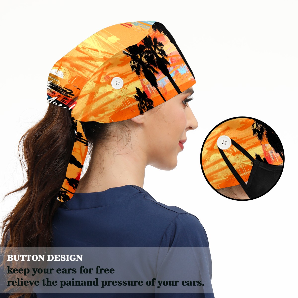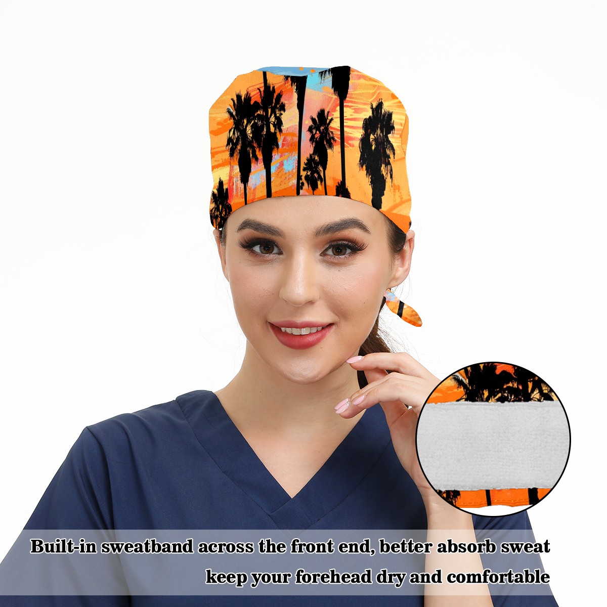 Working Caps with Button & Sweatband Satin Lined Cotton Adjustable Nurse Hats Elastic Band Scrub Cap Surgeon Hat Coconut Trees