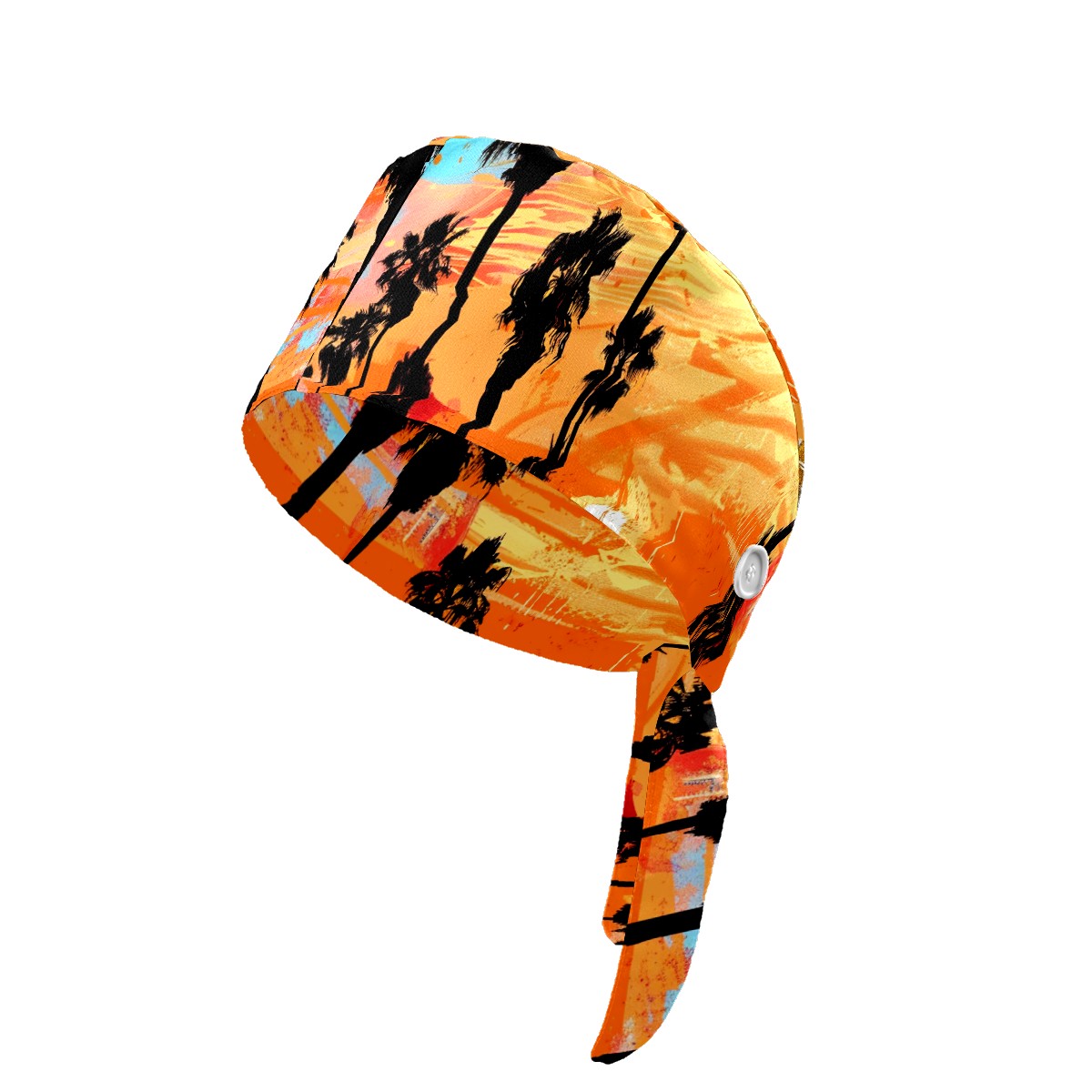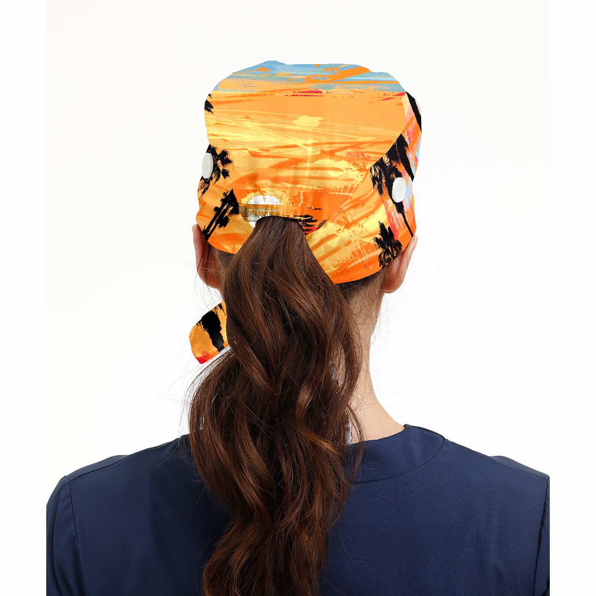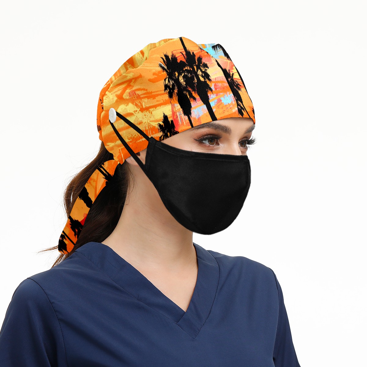 Working Caps with Button & Sweatband Satin Lined Cotton Adjustable Nurse Hats Elastic Band Scrub Cap Surgeon Hat Coconut Trees
