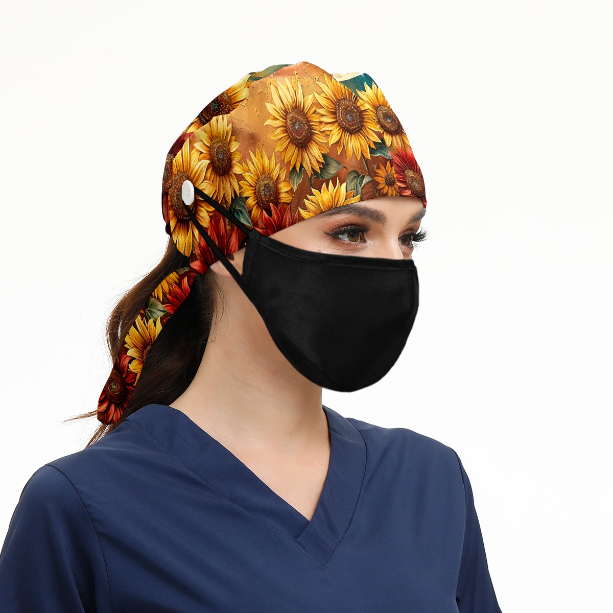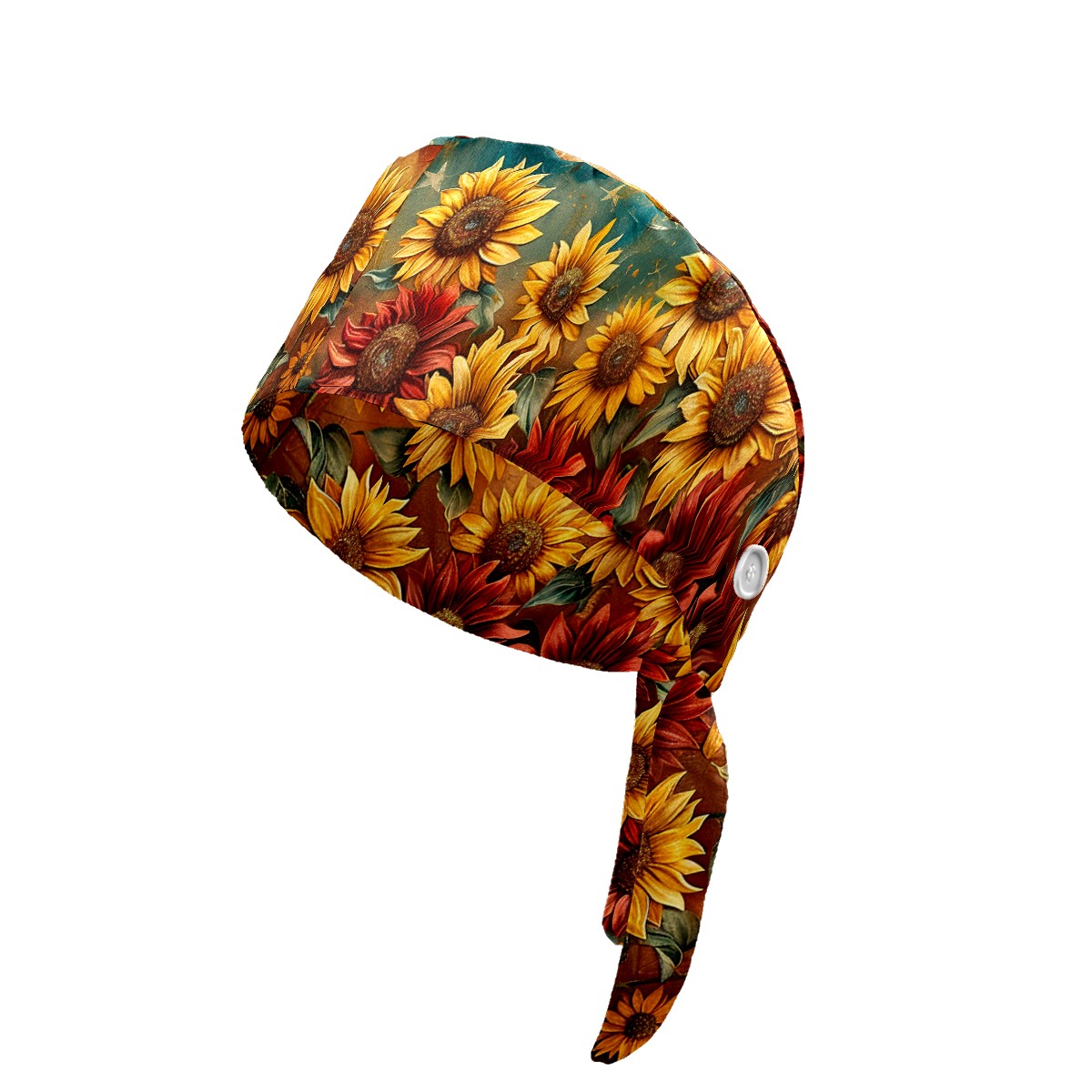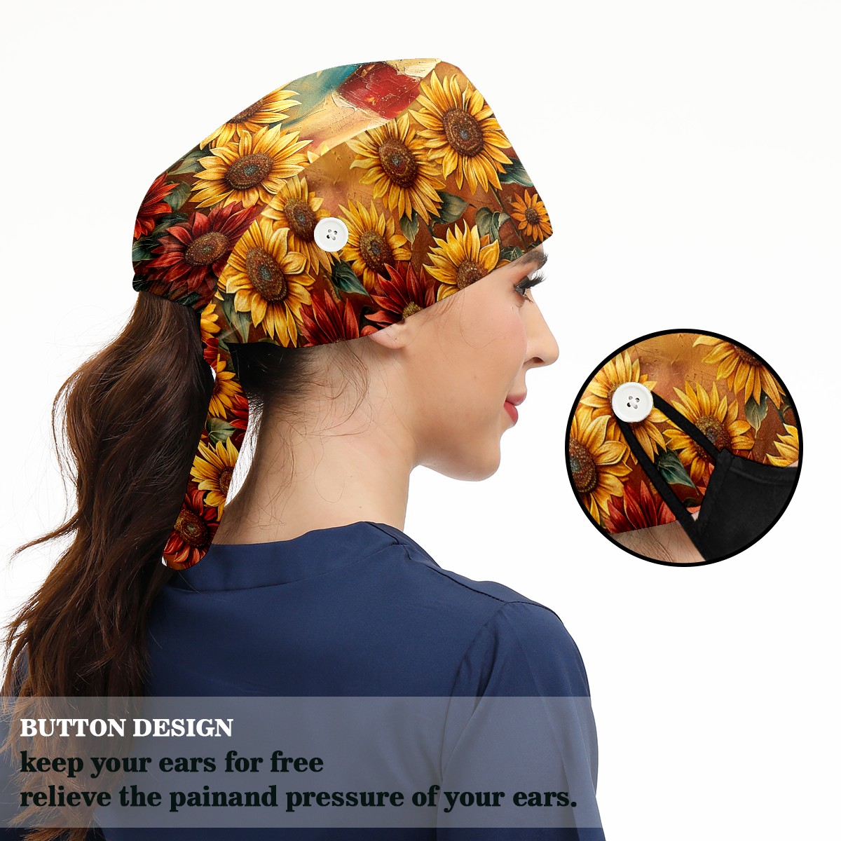 Working Caps with Button & Sweatband Satin Lined Cotton Adjustable Nurse Hats Elastic Band Scrub Cap Surgeon Hat Sunflower
