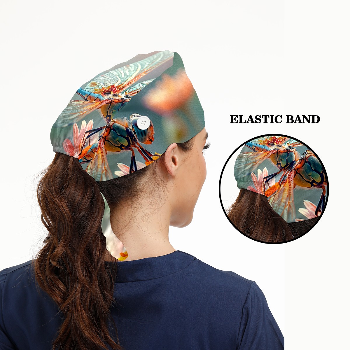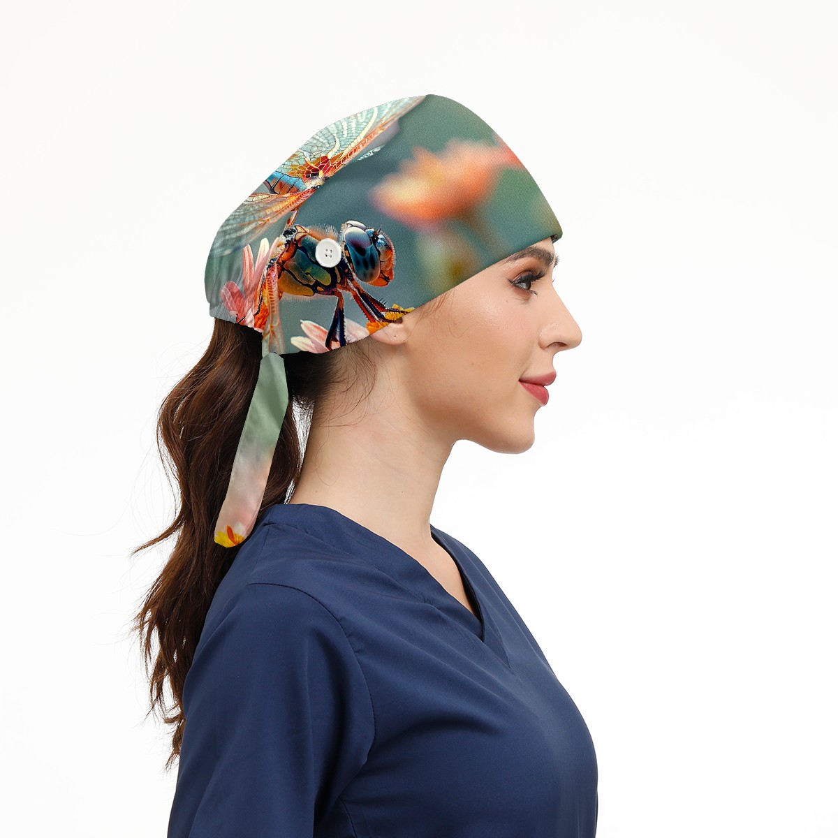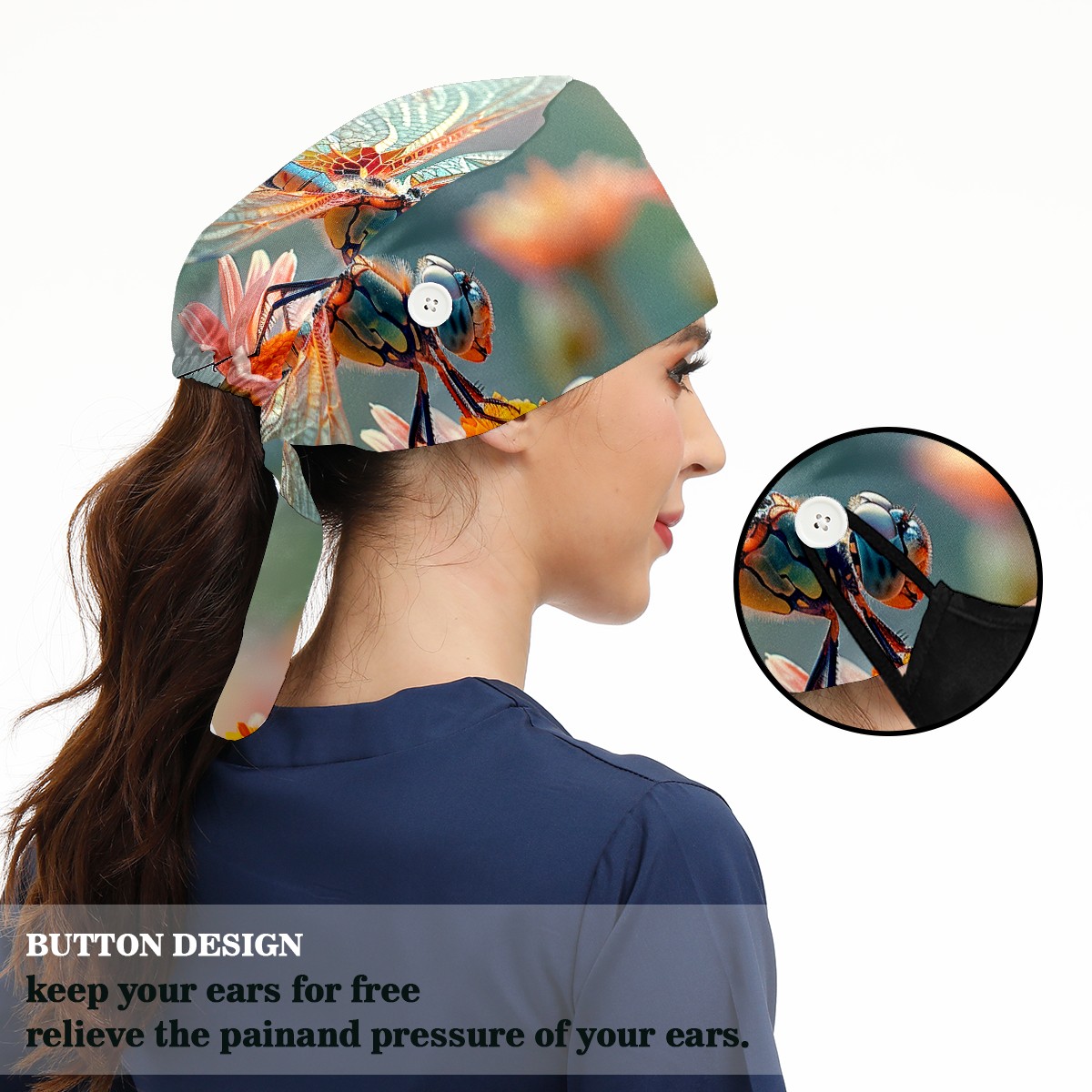Working Caps with Button & Sweatband Satin Lined Cotton Adjustable Nurse Hats Elastic Band Scrub Cap Surgeon Hat Dragonfly