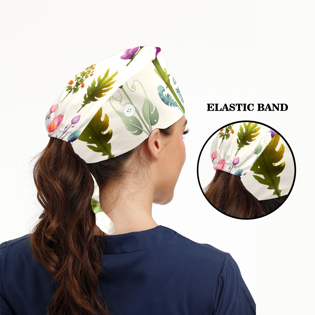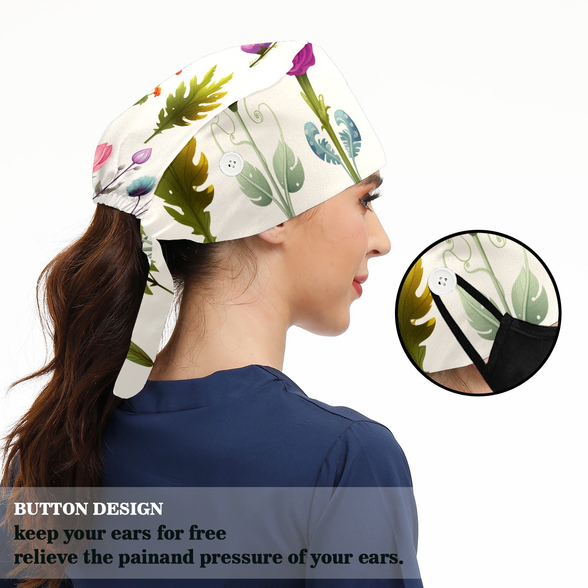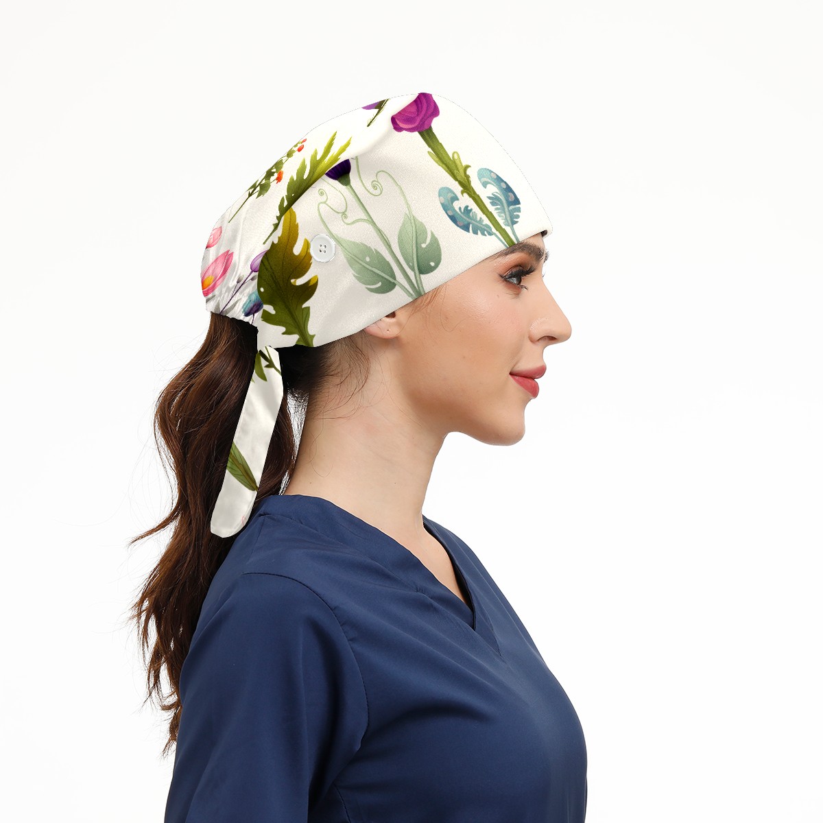 Working Caps with Button & Sweatband Satin Lined Cotton Adjustable Nurse Hats Elastic Band Scrub Cap Surgeon Hat Plants