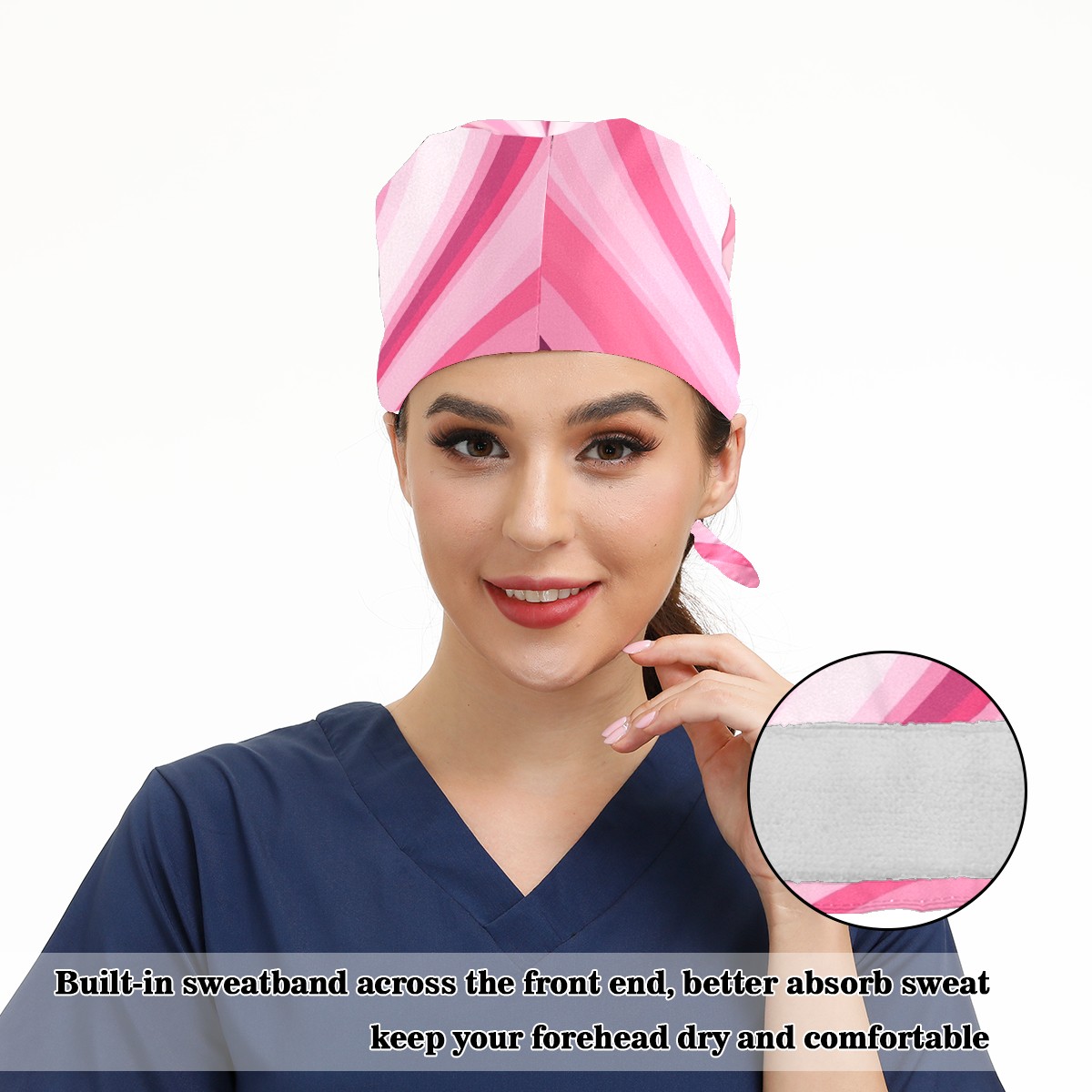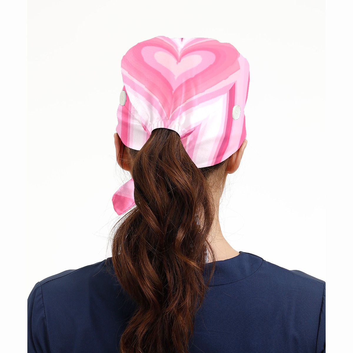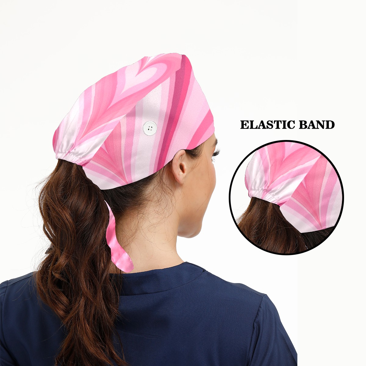 Working Caps with Button & Sweatband Satin Lined Cotton Adjustable Nurse Hats Elastic Band Scrub Cap Surgeon Hat Pink Hearts (2)