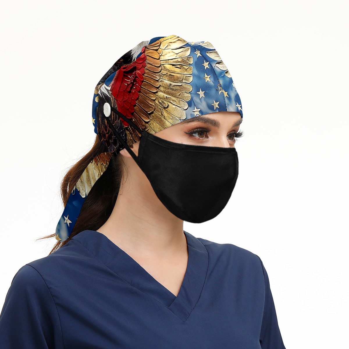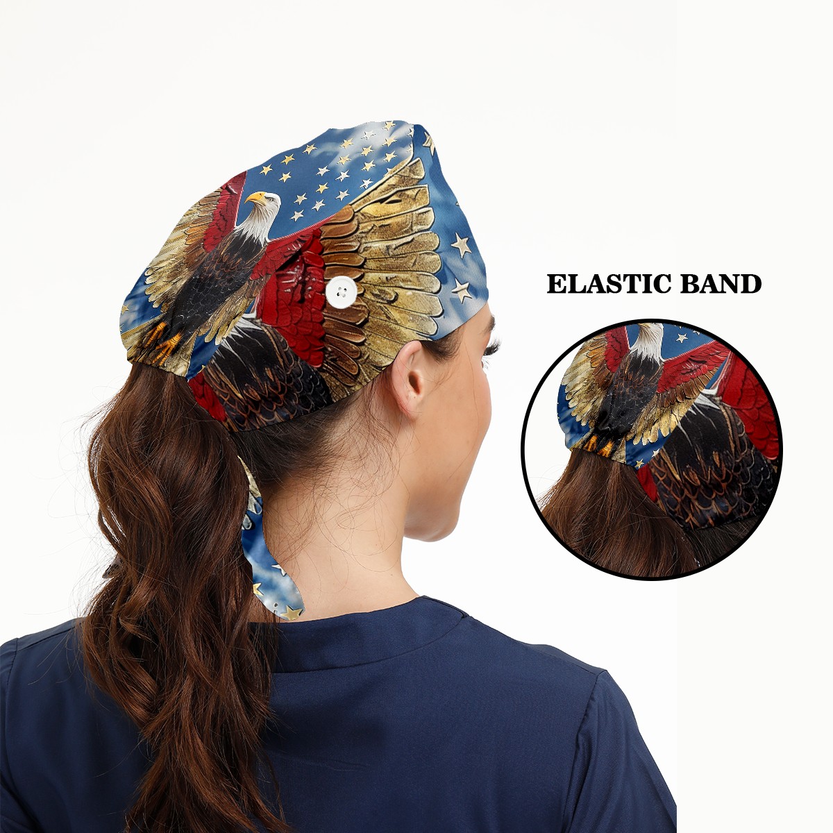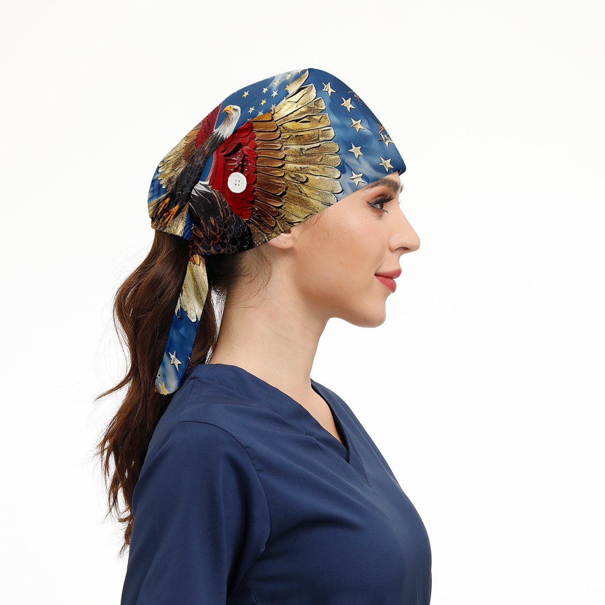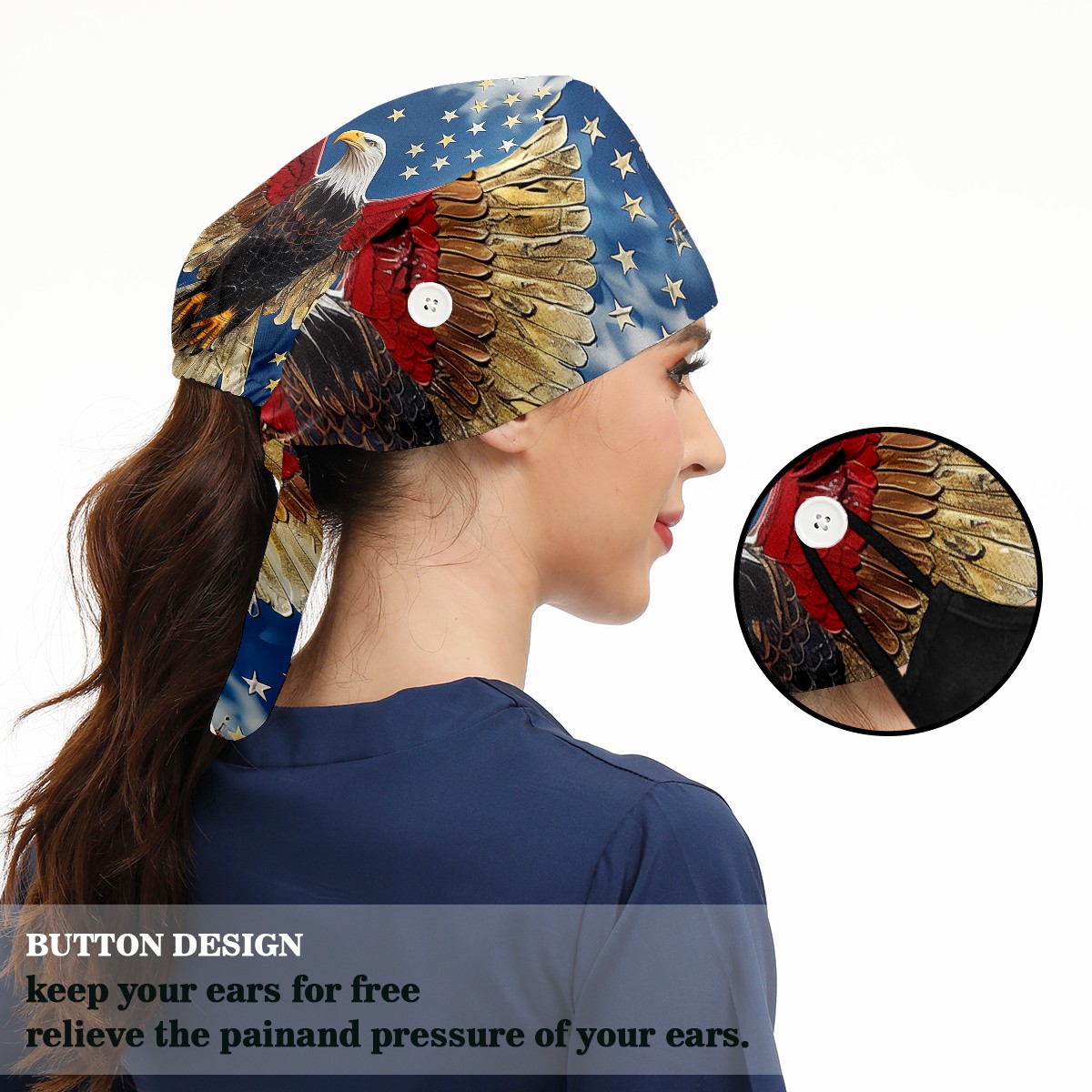 Working Caps with Button & Sweatband Satin Lined Cotton Adjustable Nurse Hats Elastic Band Scrub Cap Surgeon Hat American Flag Eagle