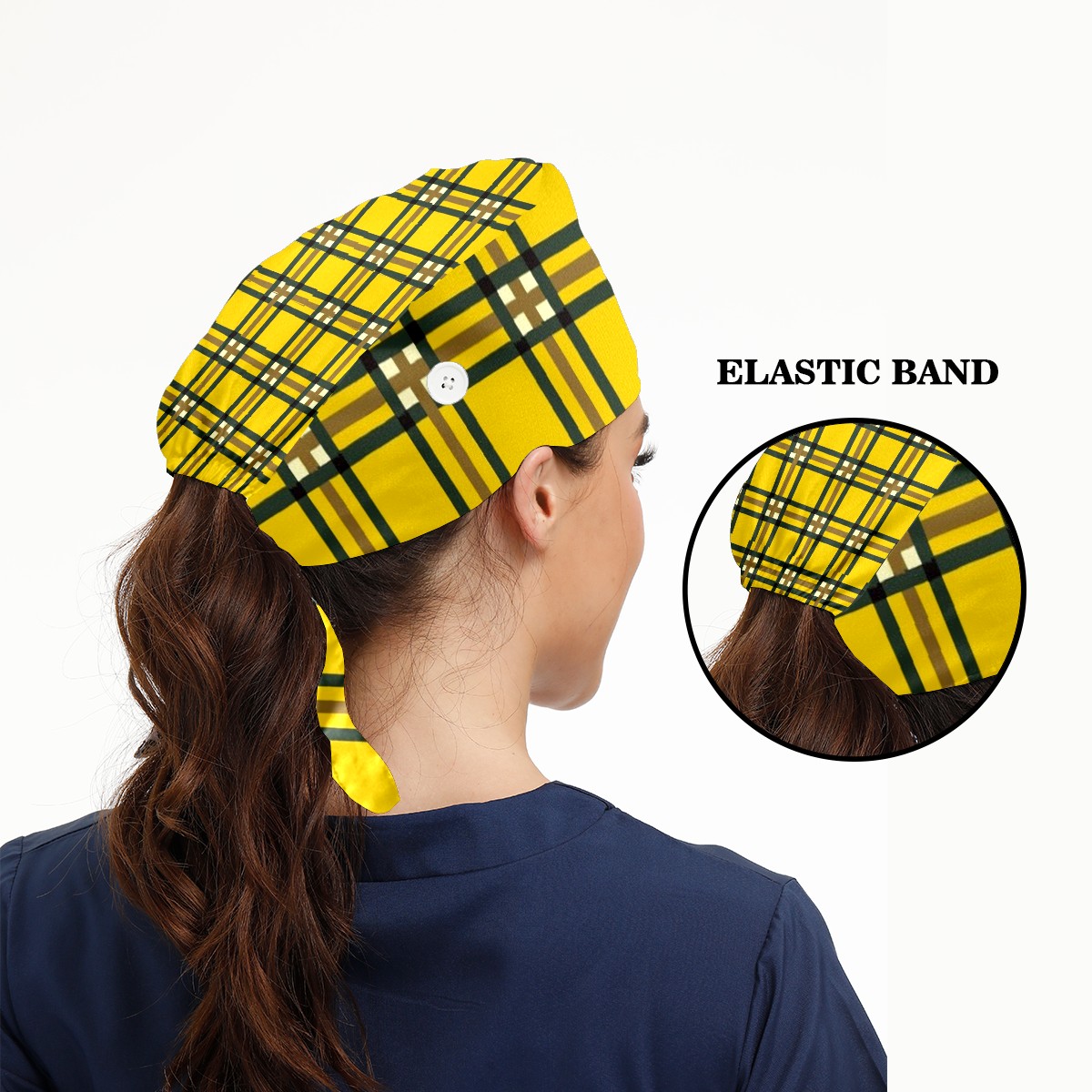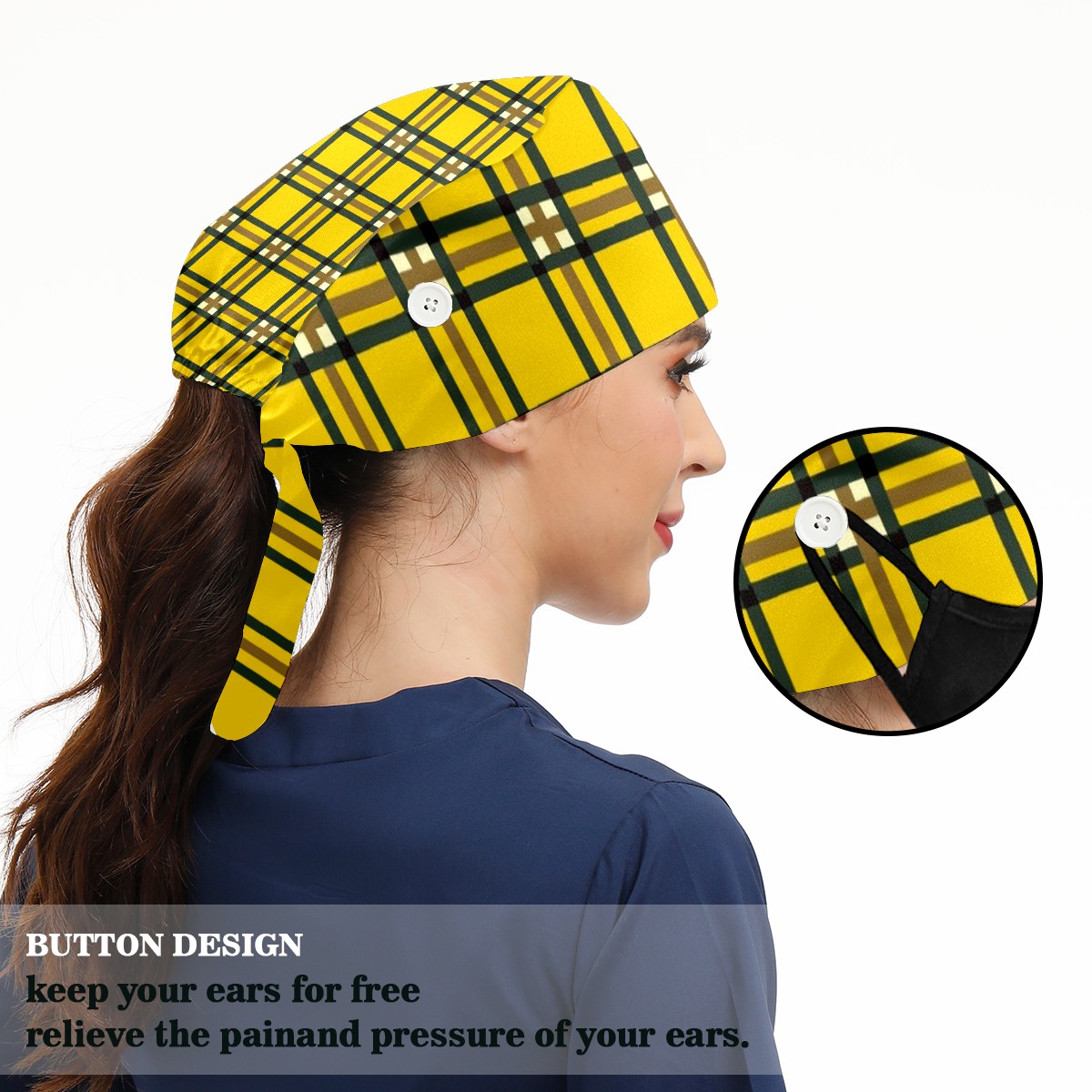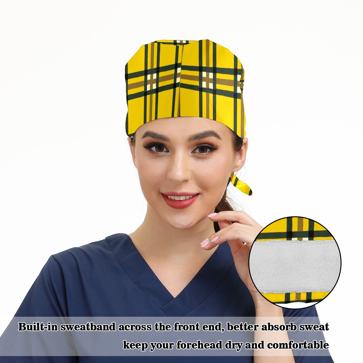 Working Caps with Button & Sweatband Satin Lined Cotton Adjustable Nurse Hats Elastic Band Scrub Cap Surgeon Hat Yellow Lattice