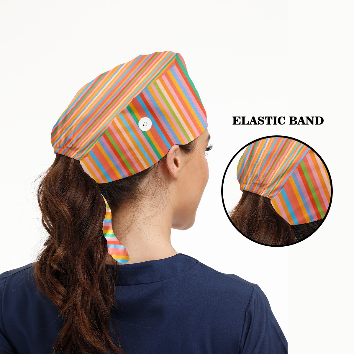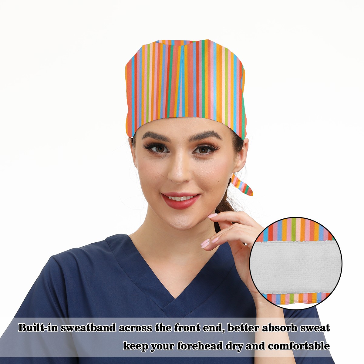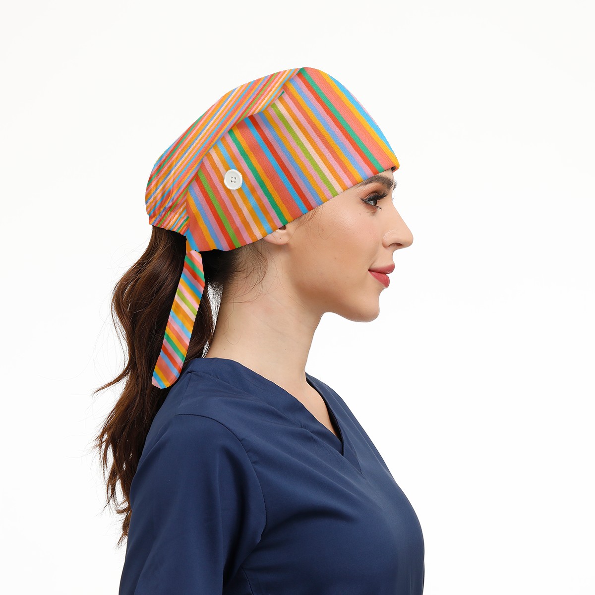 Working Caps with Button & Sweatband Satin Lined Cotton Adjustable Nurse Hats Elastic Band Scrub Cap Surgeon Hat Colored Lines
