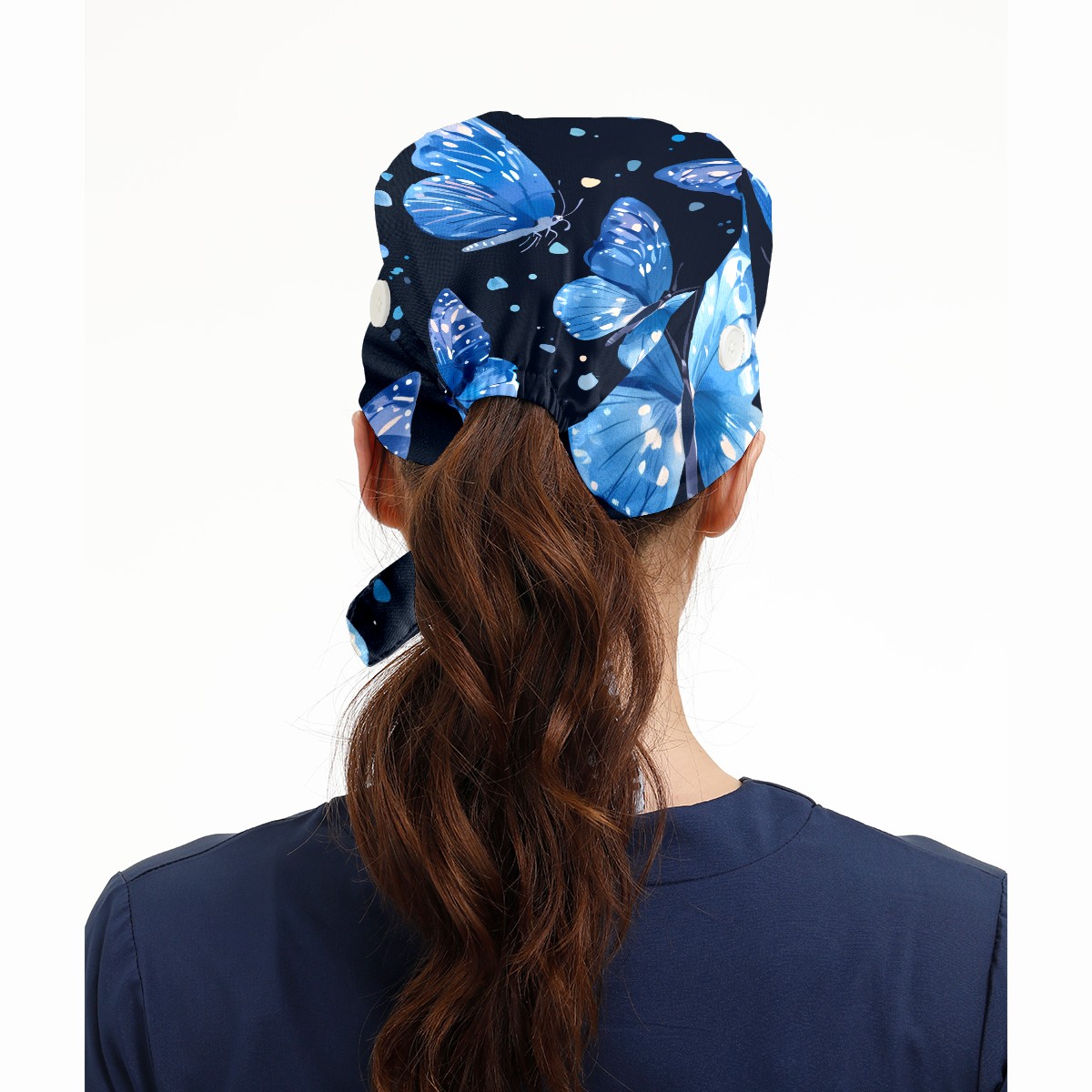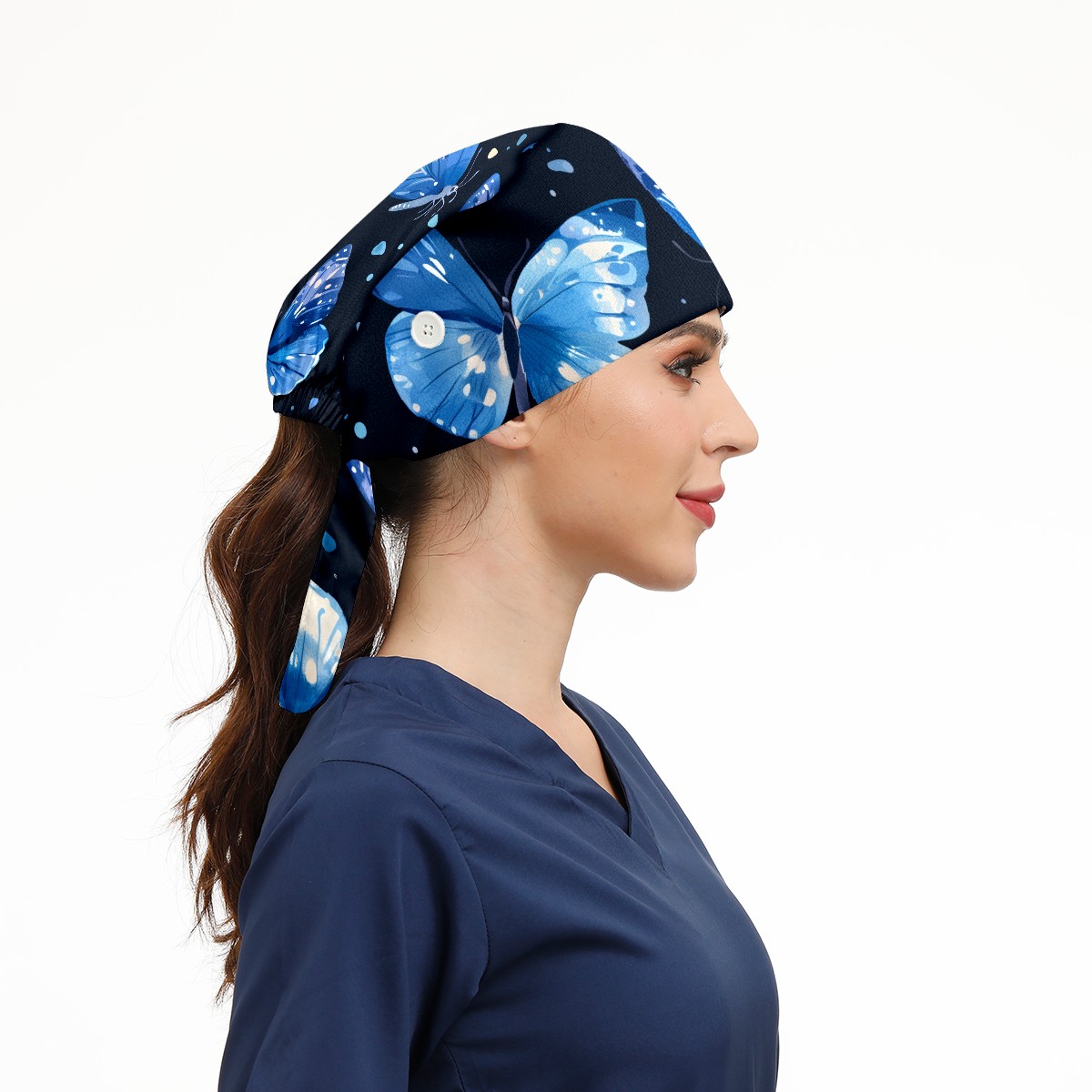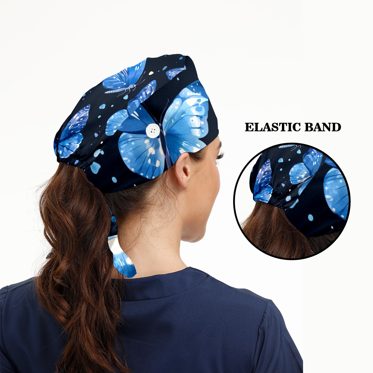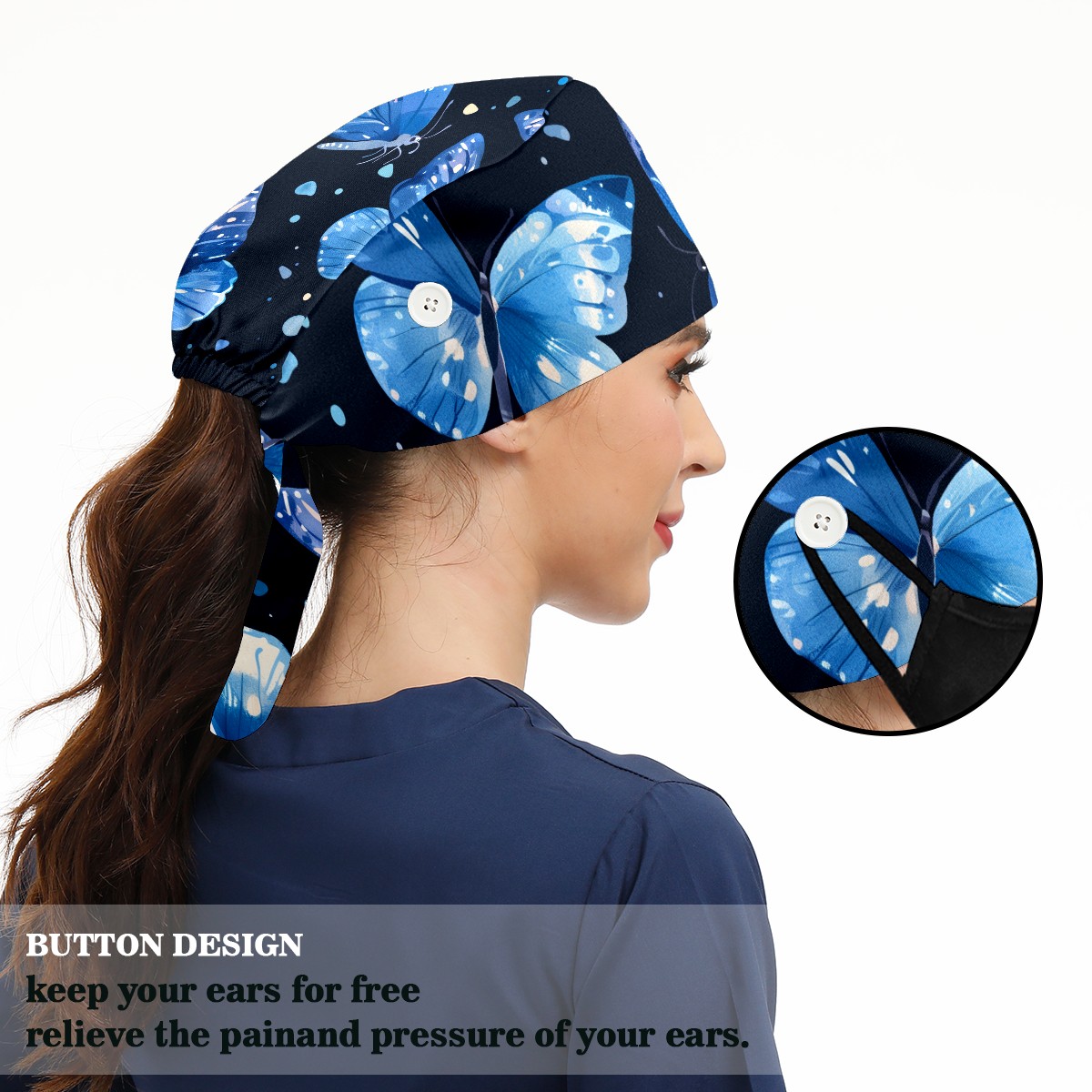Working Caps with Button & Sweatband Satin Lined Cotton Adjustable Nurse Hats Elastic Band Scrub Cap Surgeon Hat Blue Butterfly