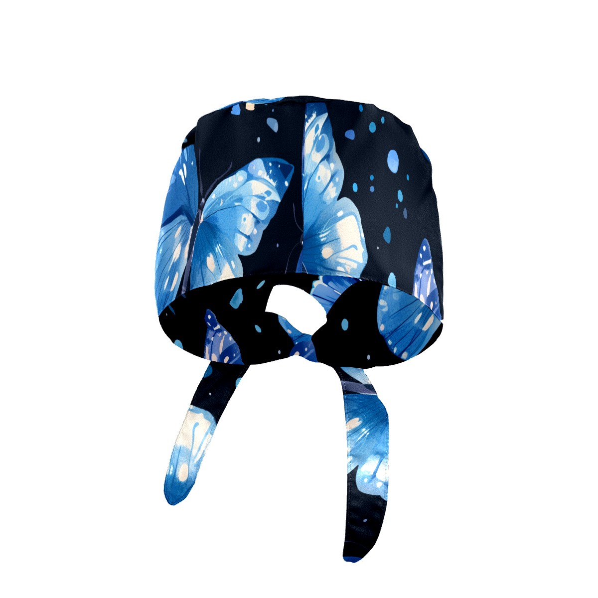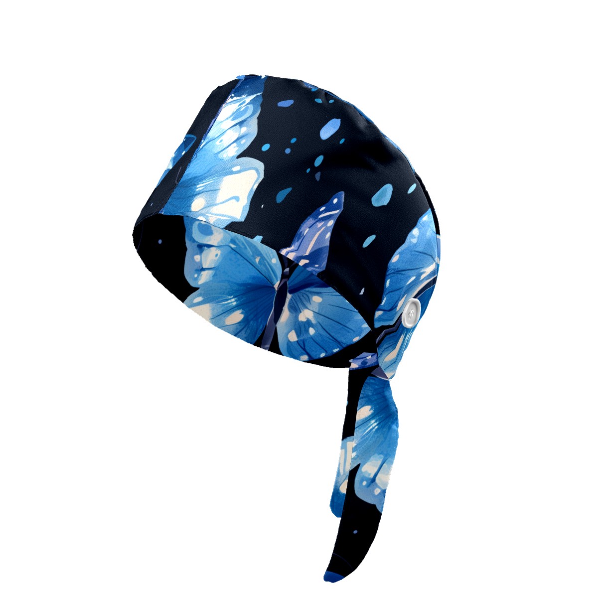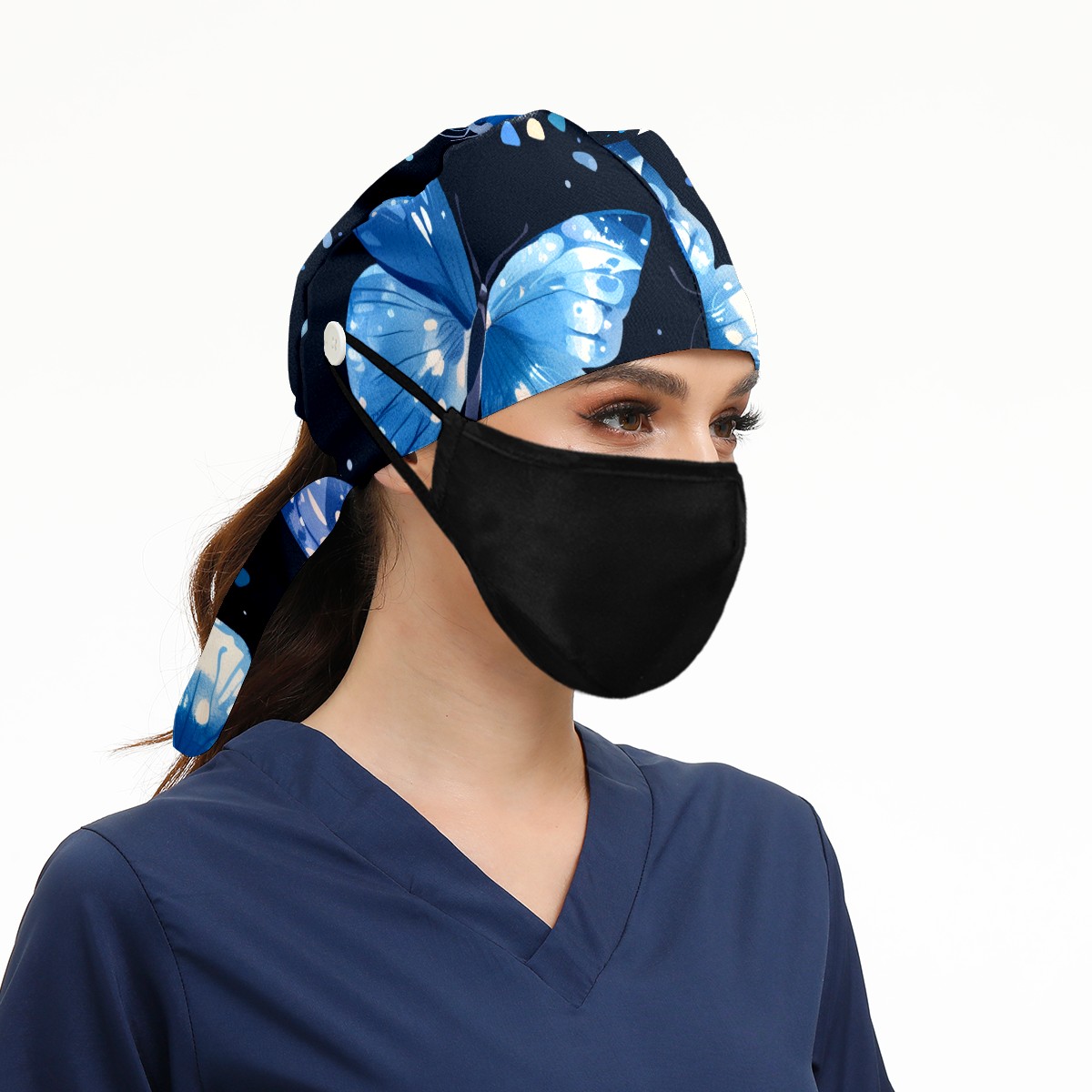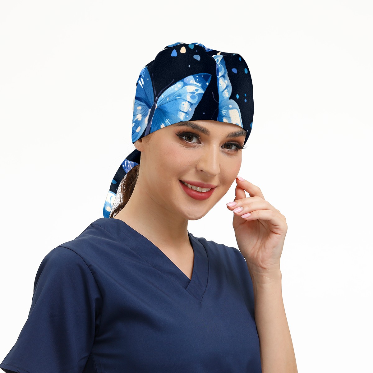 Working Caps with Button & Sweatband Satin Lined Cotton Adjustable Nurse Hats Elastic Band Scrub Cap Surgeon Hat Blue Butterfly