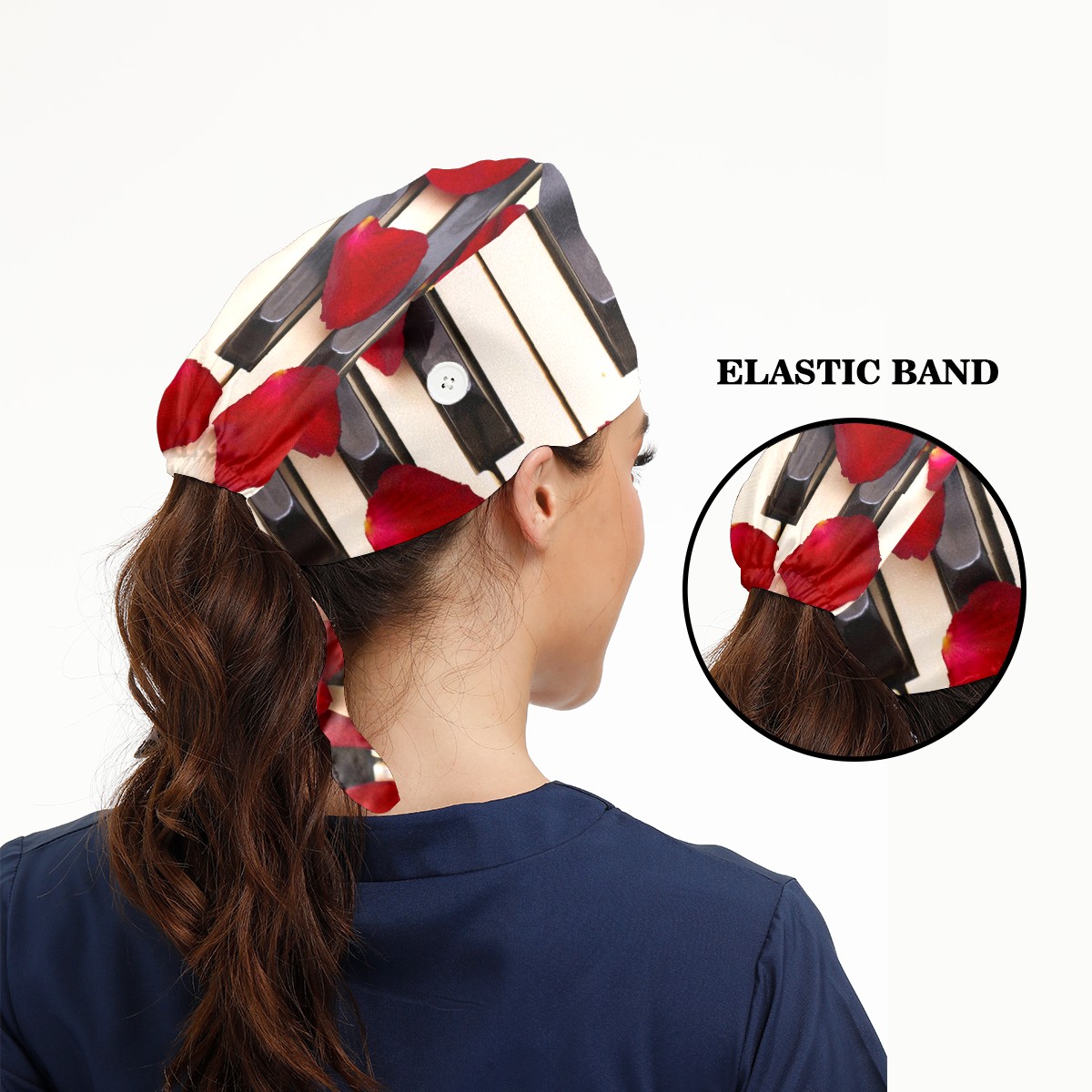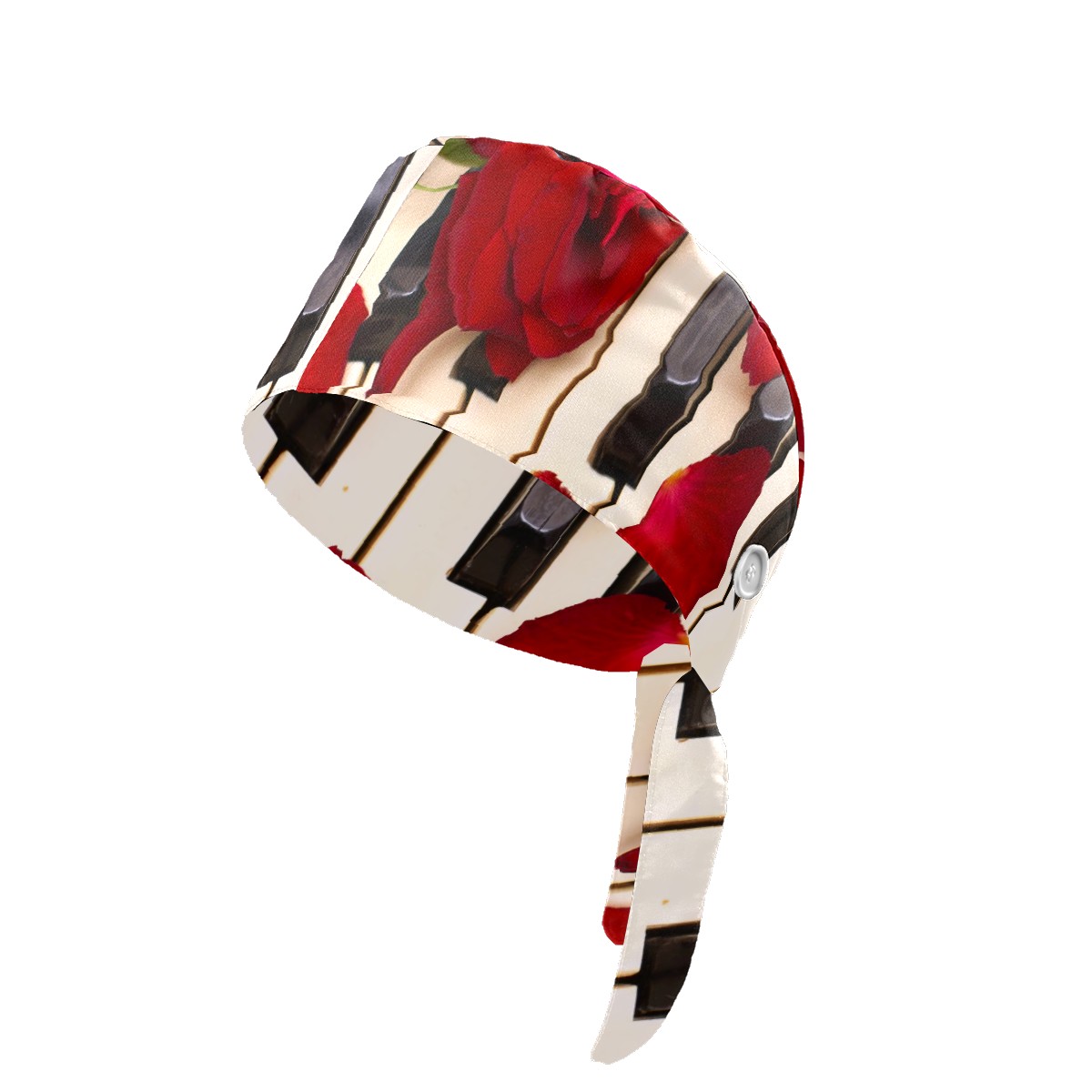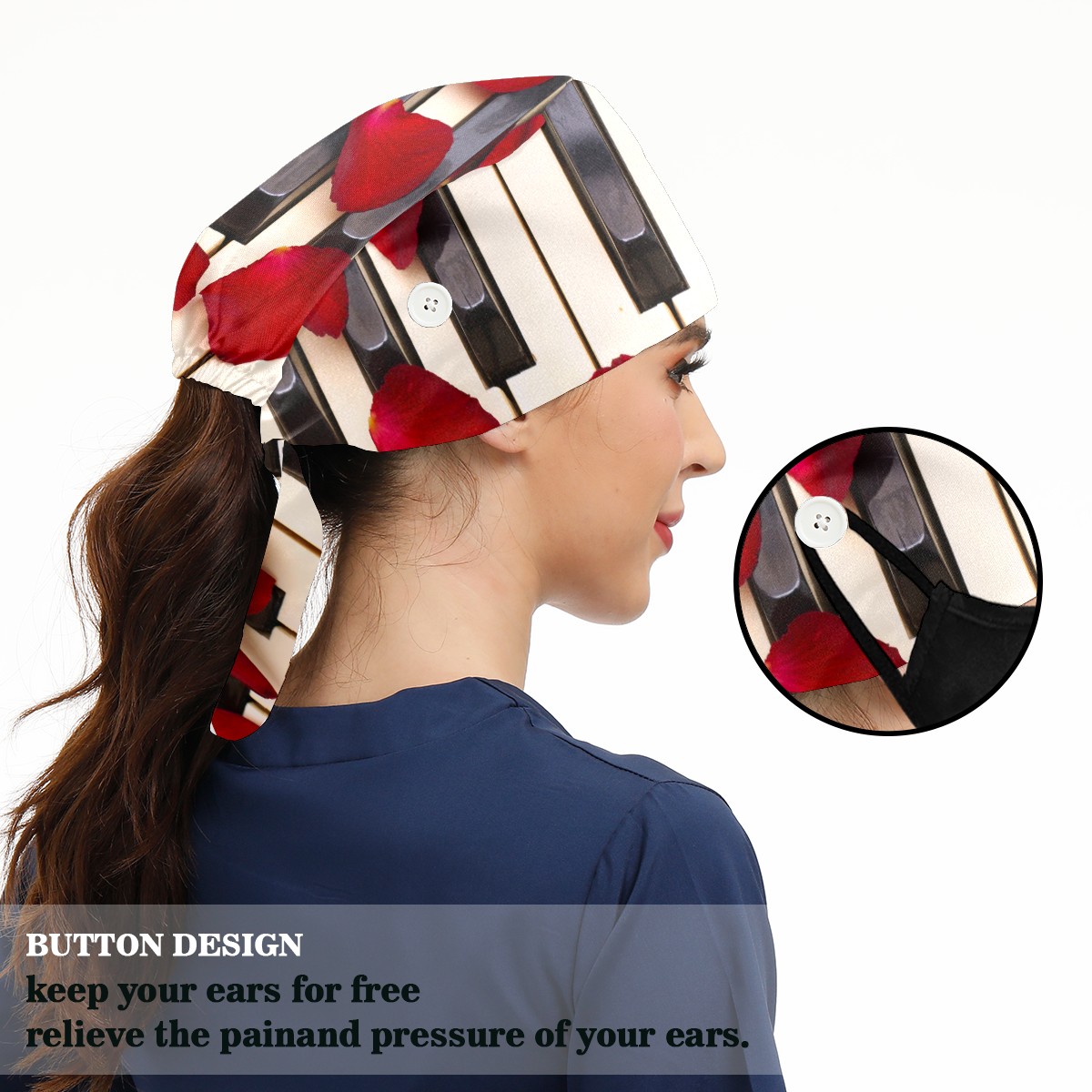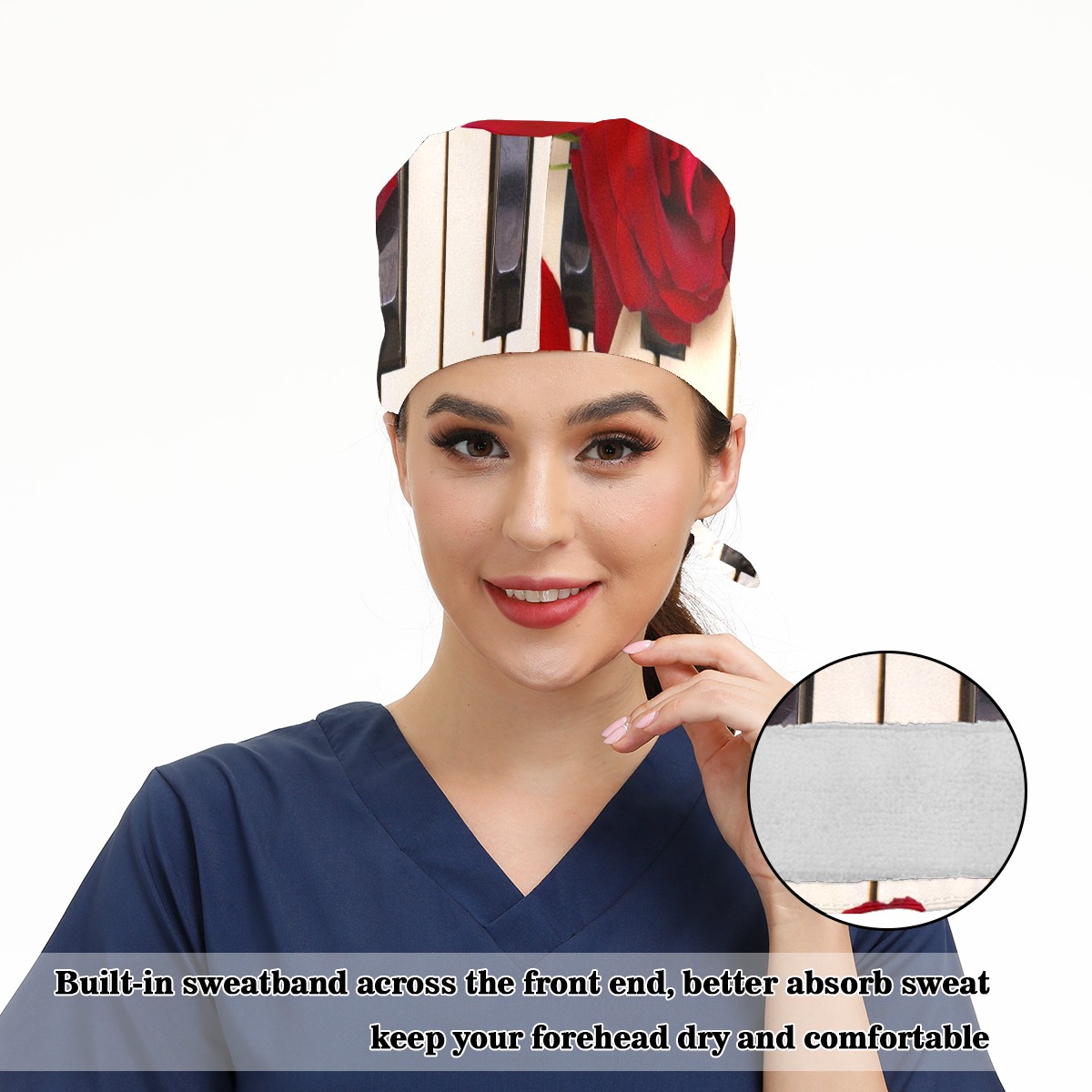 Working Caps with Button & Sweatband Satin Lined Cotton Adjustable Nurse Hats Elastic Band Scrub Cap Surgeon Hat Piano Keys Red Rose