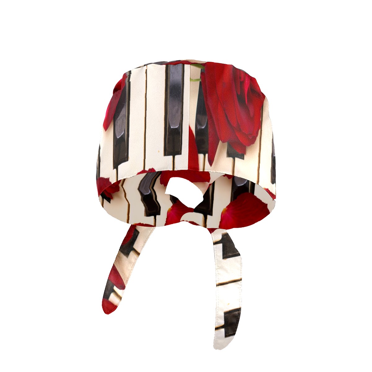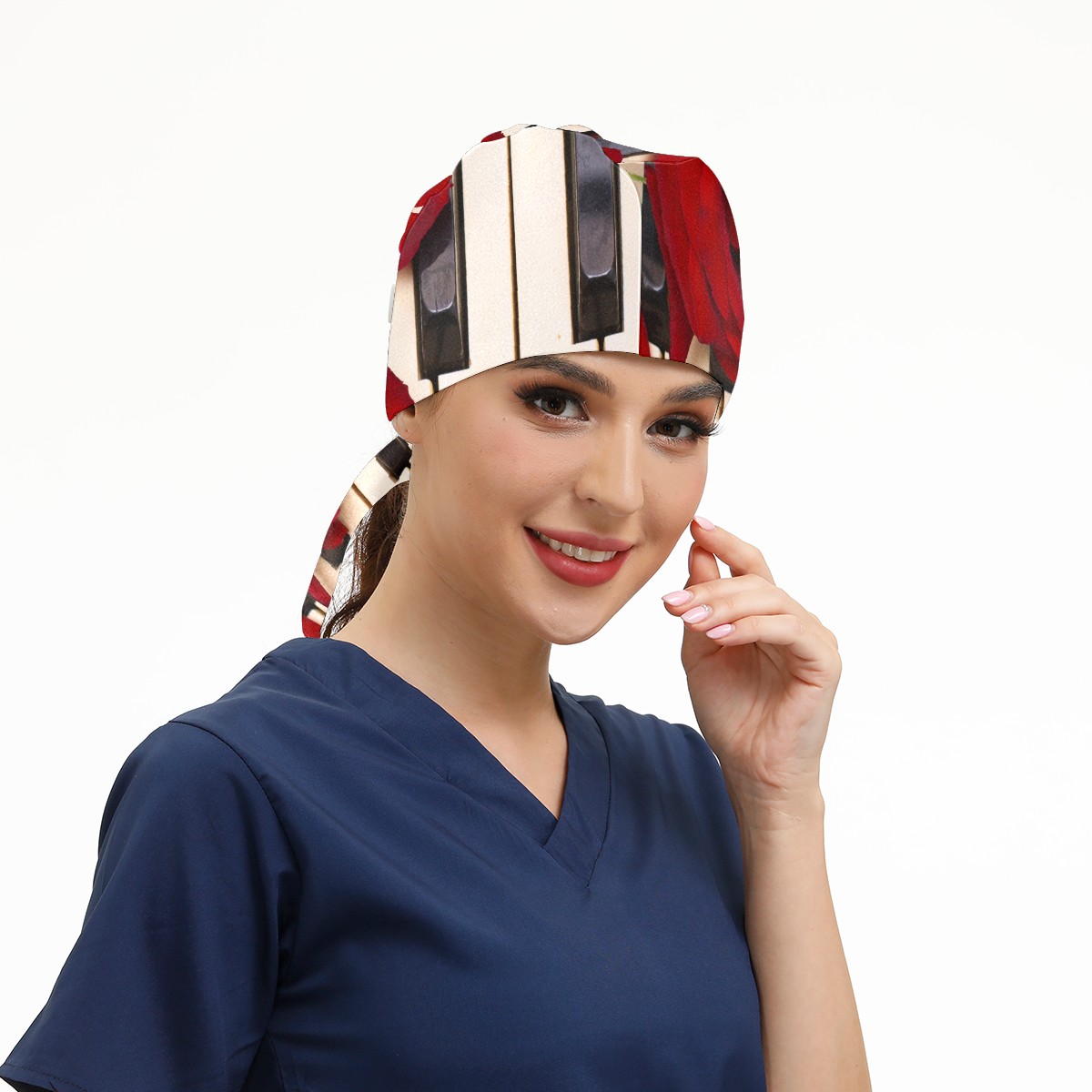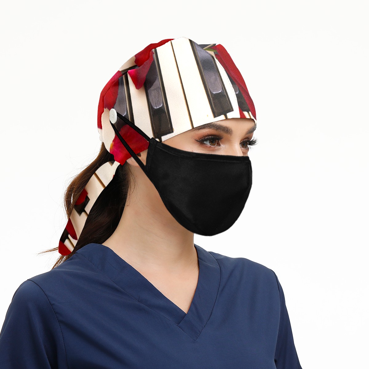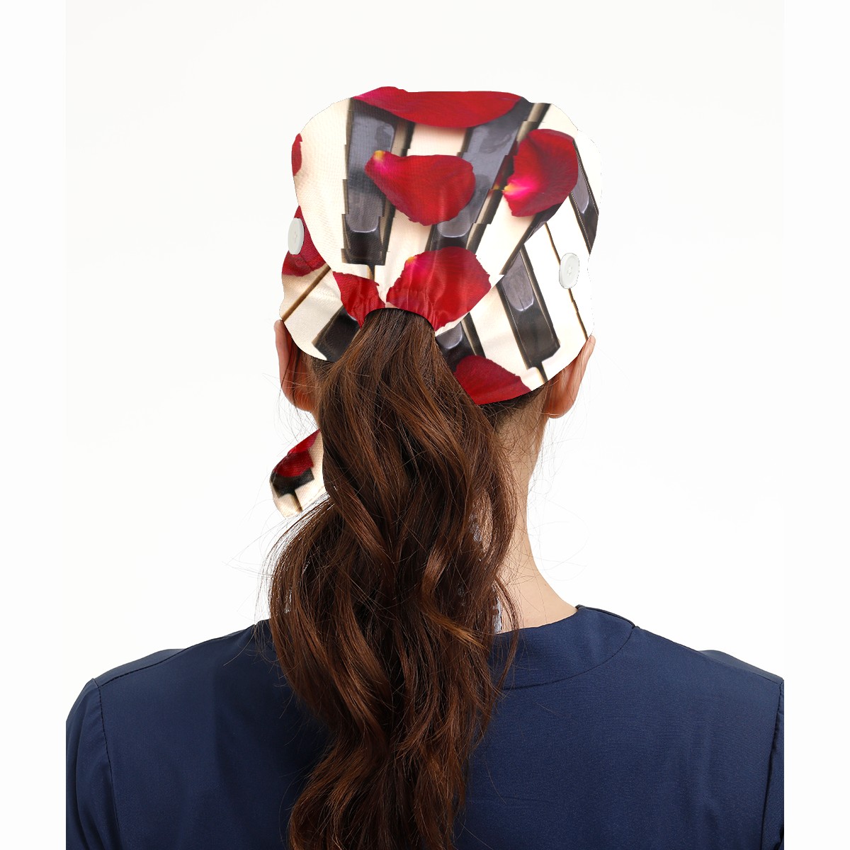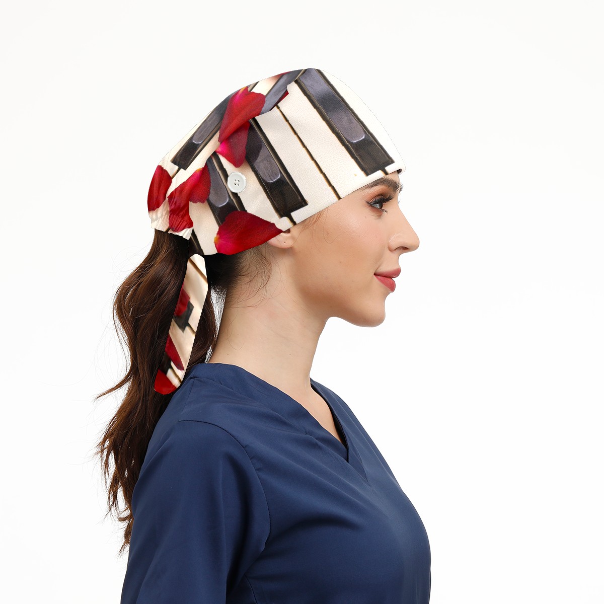 Working Caps with Button & Sweatband Satin Lined Cotton Adjustable Nurse Hats Elastic Band Scrub Cap Surgeon Hat Piano Keys Red Rose
