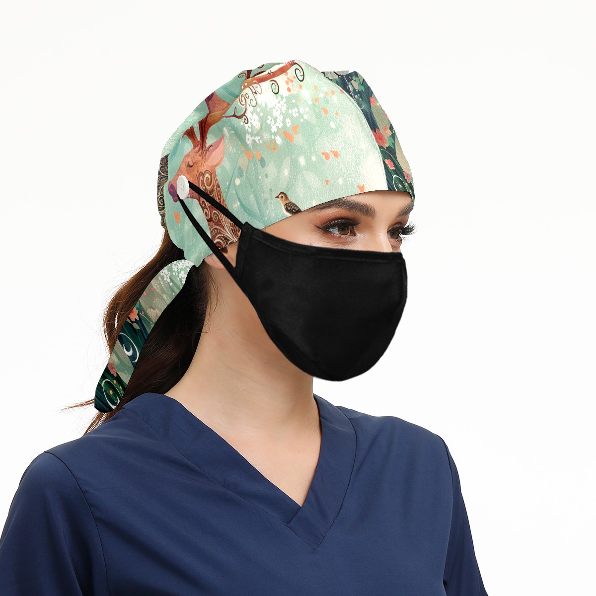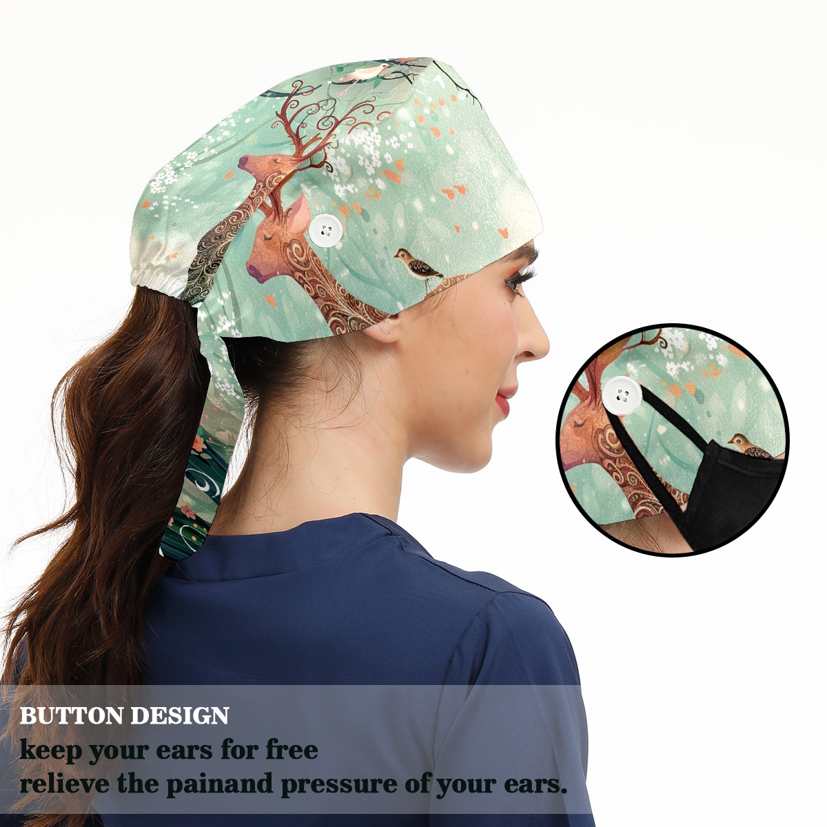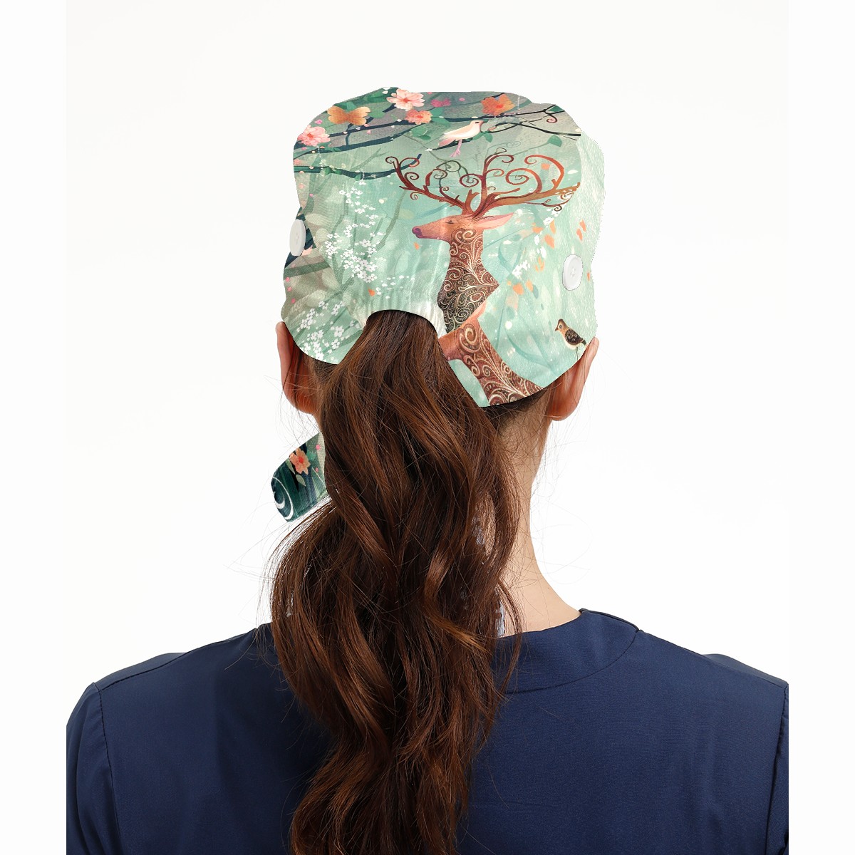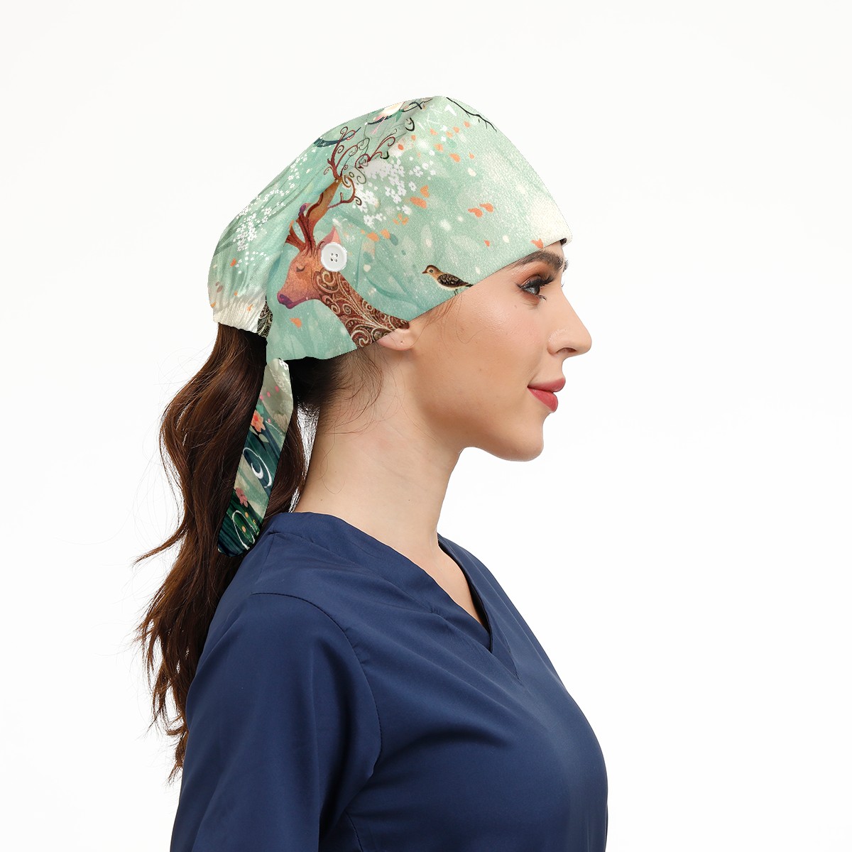 Working Caps with Button & Sweatband Satin Lined Cotton Adjustable Nurse Hats Elastic Band Scrub Cap Surgeon Hat Sika Deer