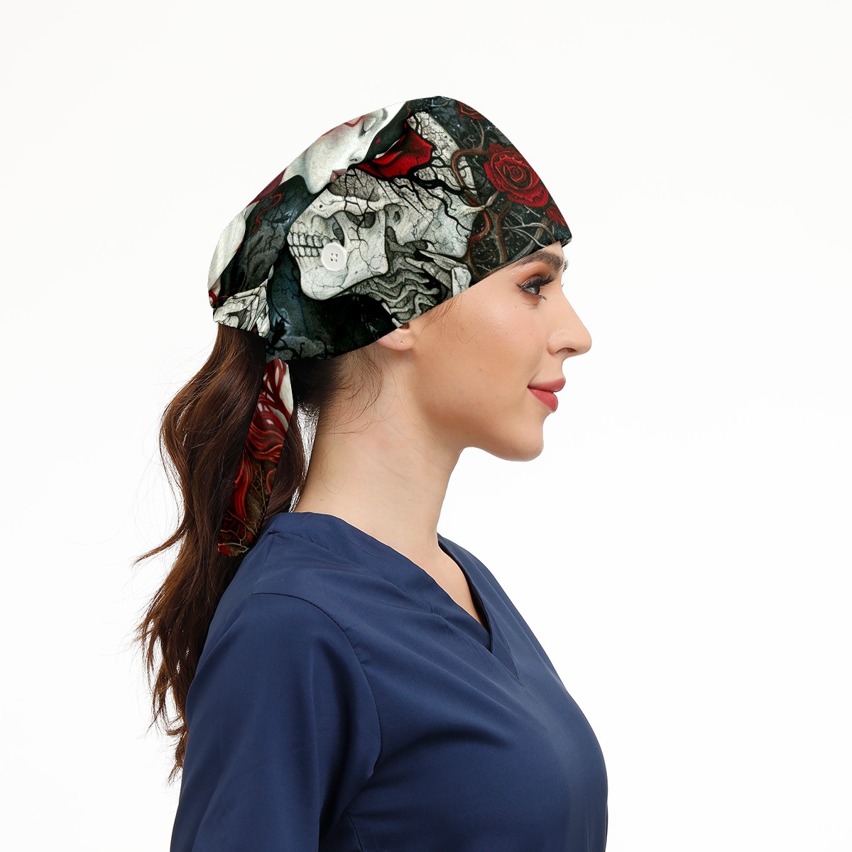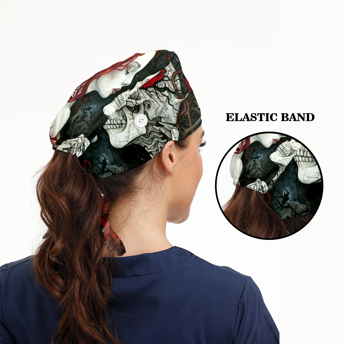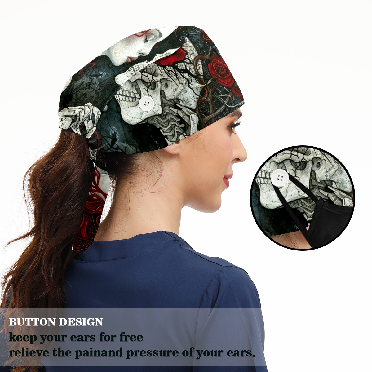Working Caps with Button & Sweatband Satin Lined Cotton Adjustable Nurse Hats Elastic Band Scrub Cap Surgeon Hat Skull Head