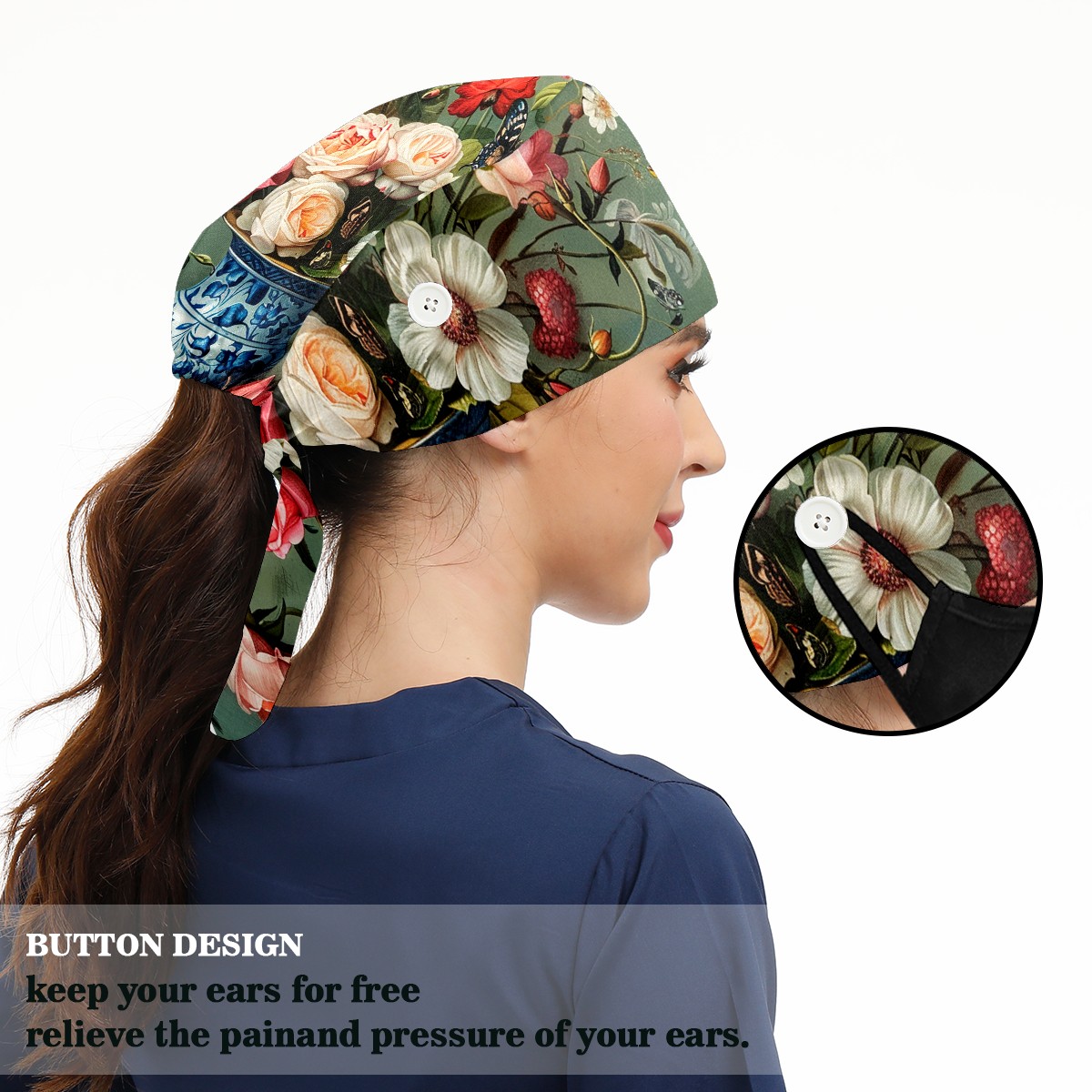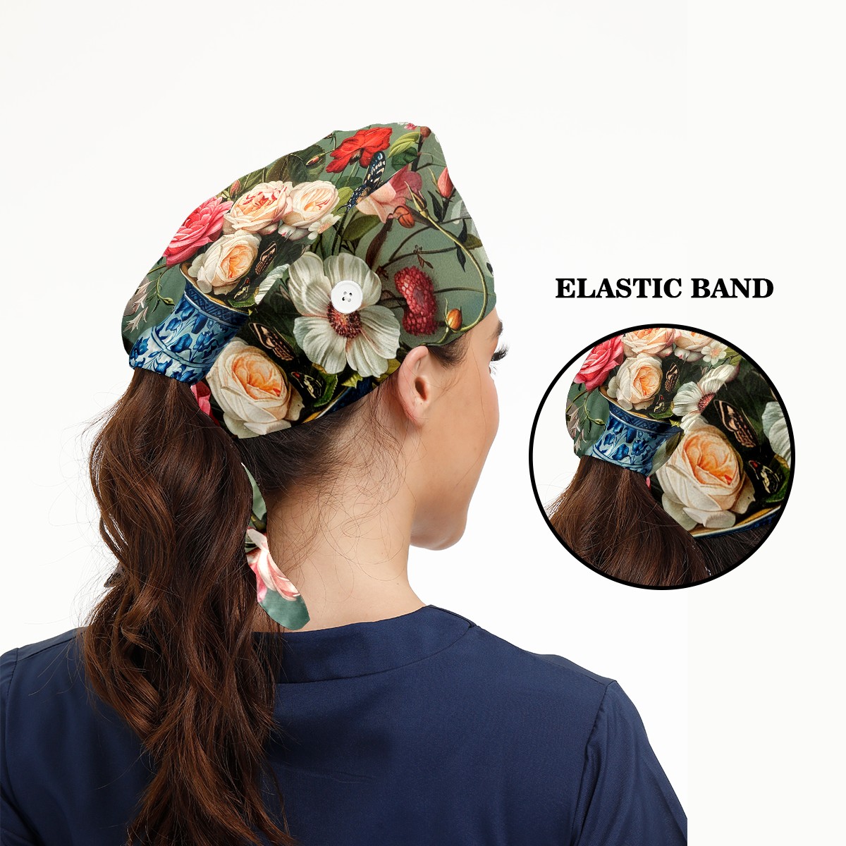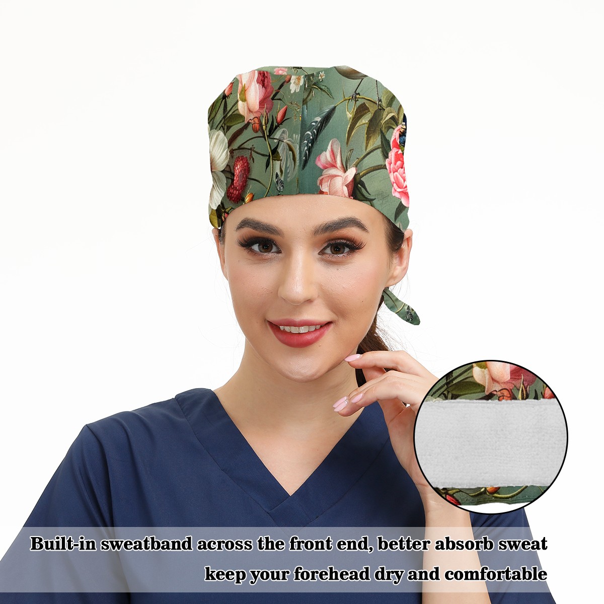 Working Caps with Button & Sweatband Satin Lined Cotton Adjustable Nurse Hats Elastic Band Scrub Cap Surgeon Hat Rose