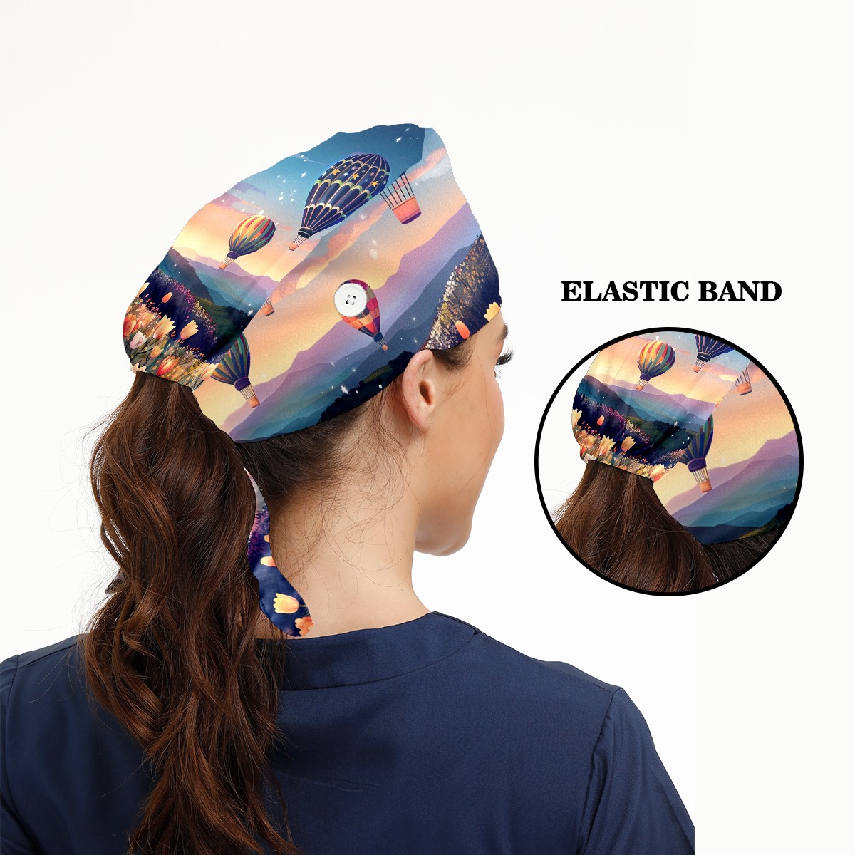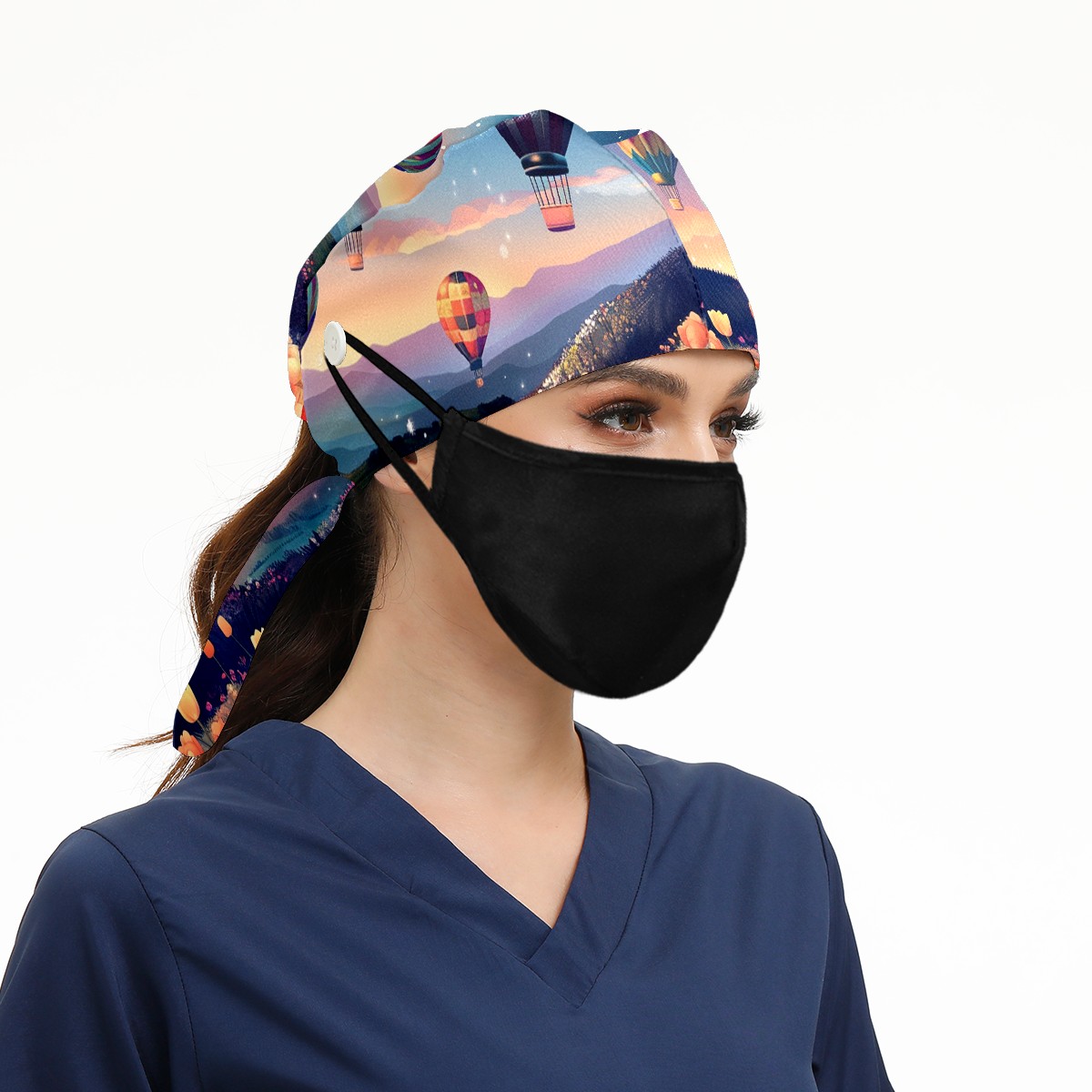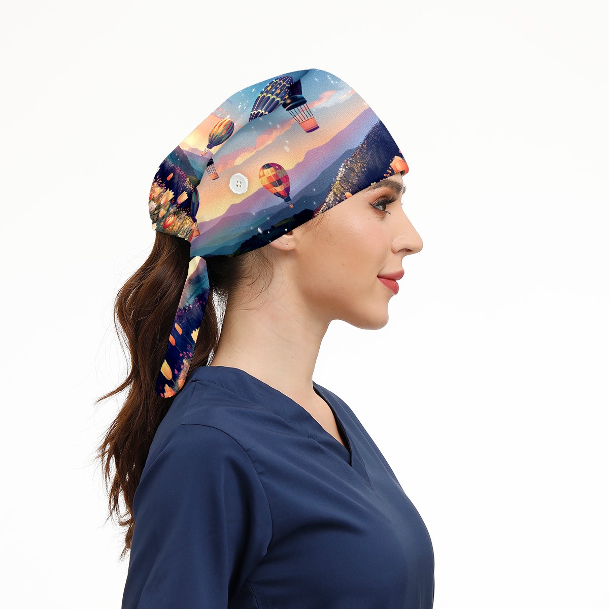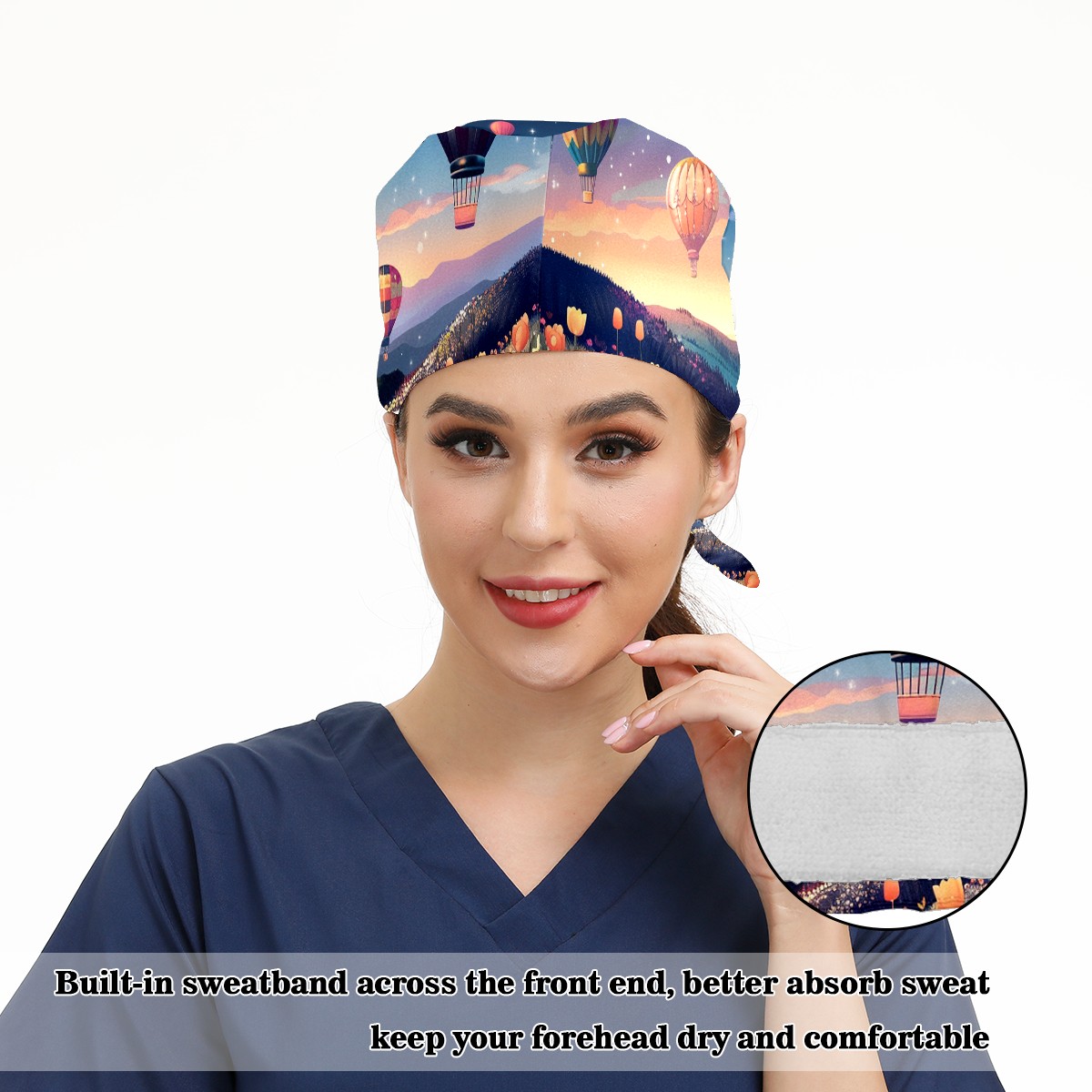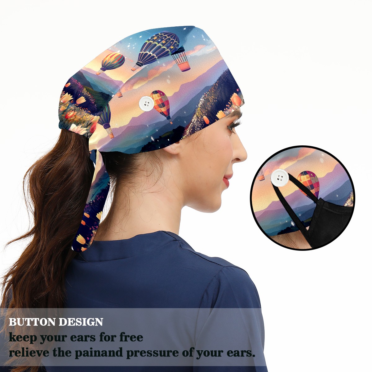 Working Caps with Button & Sweatband Satin Lined Cotton Adjustable Nurse Hats Elastic Band Scrub Cap Surgeon Hat Hydrogen Balloon