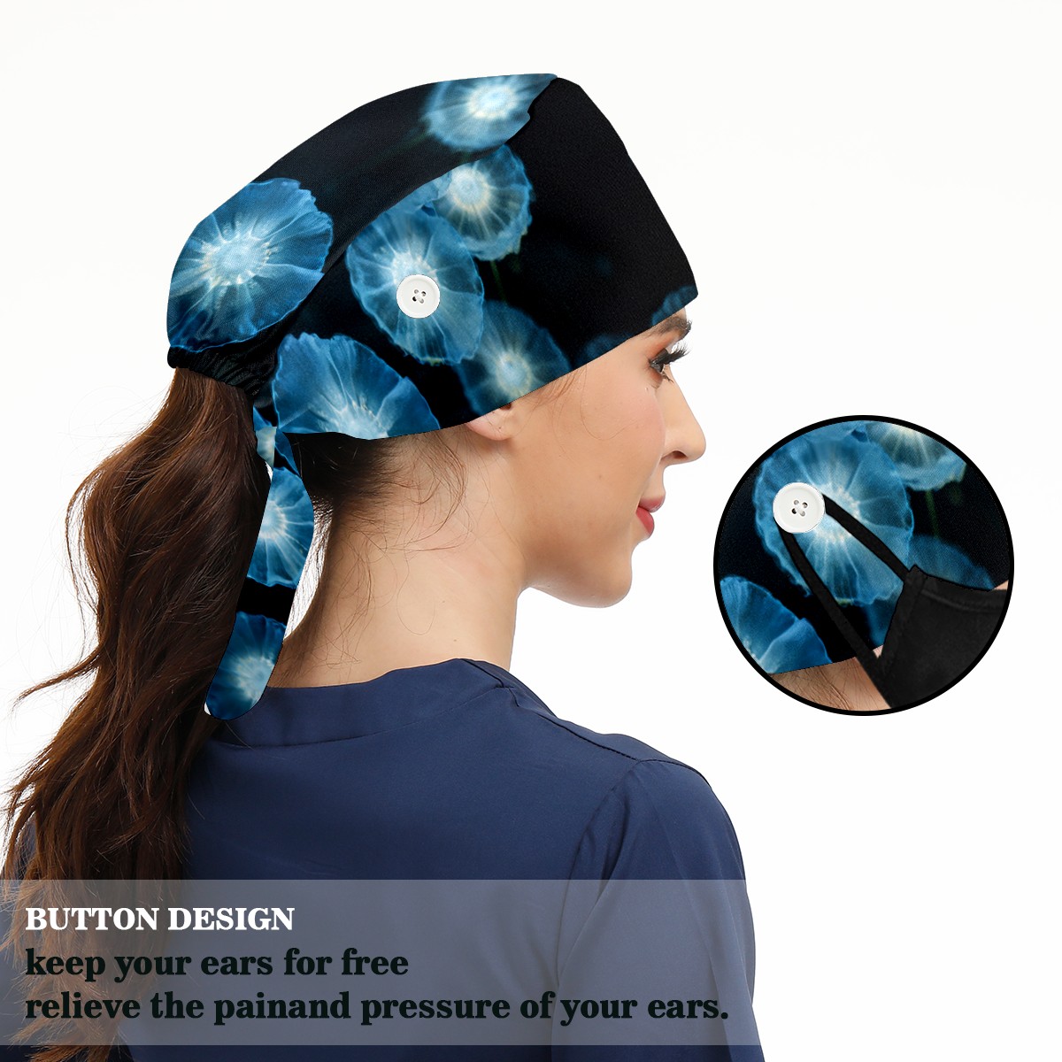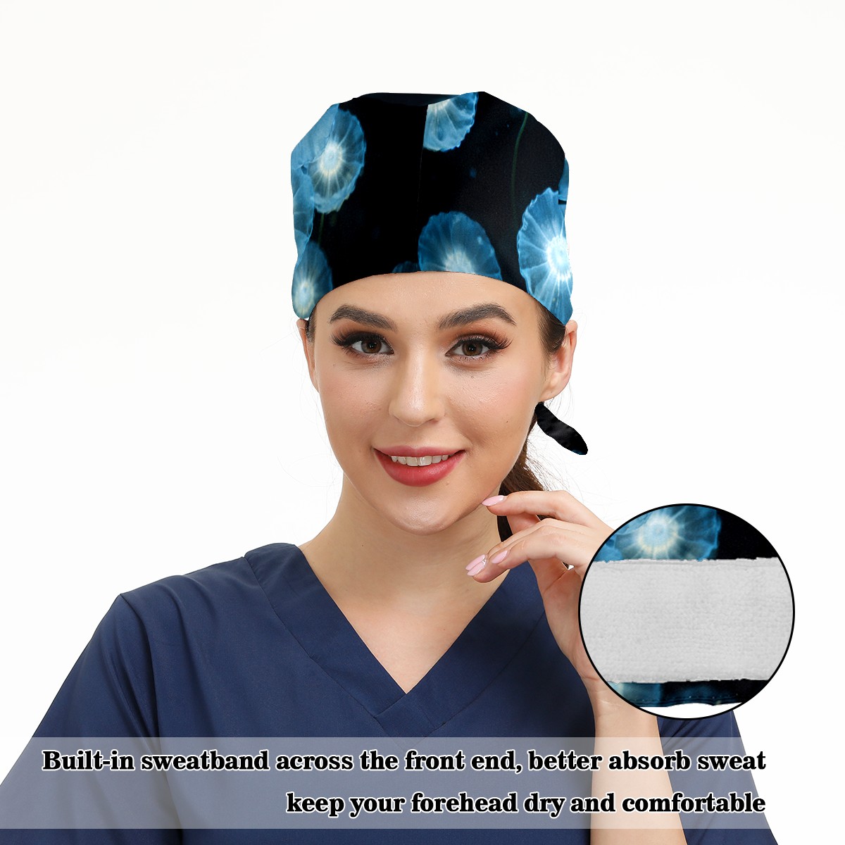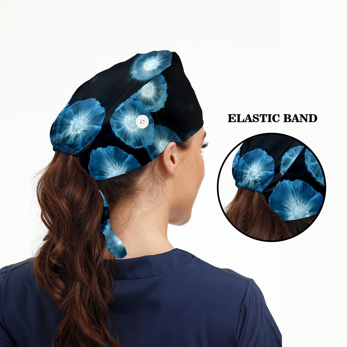 Working Caps with Button & Sweatband Satin Lined Cotton Adjustable Nurse Hats Elastic Band Scrub Cap Surgeon Hat Jellyfish (4)