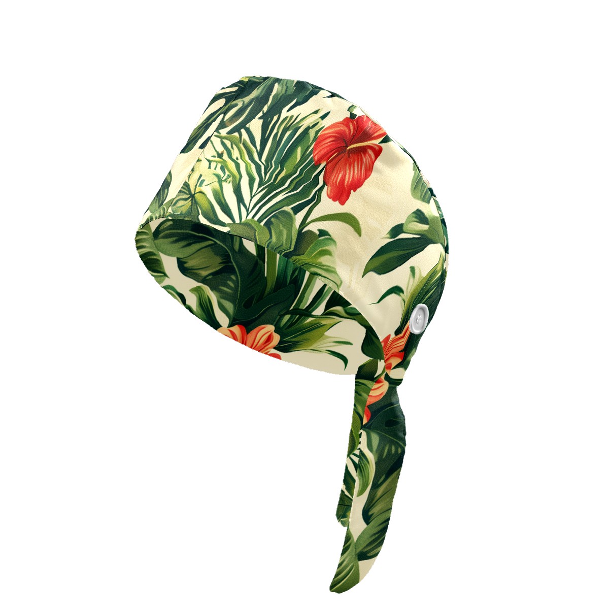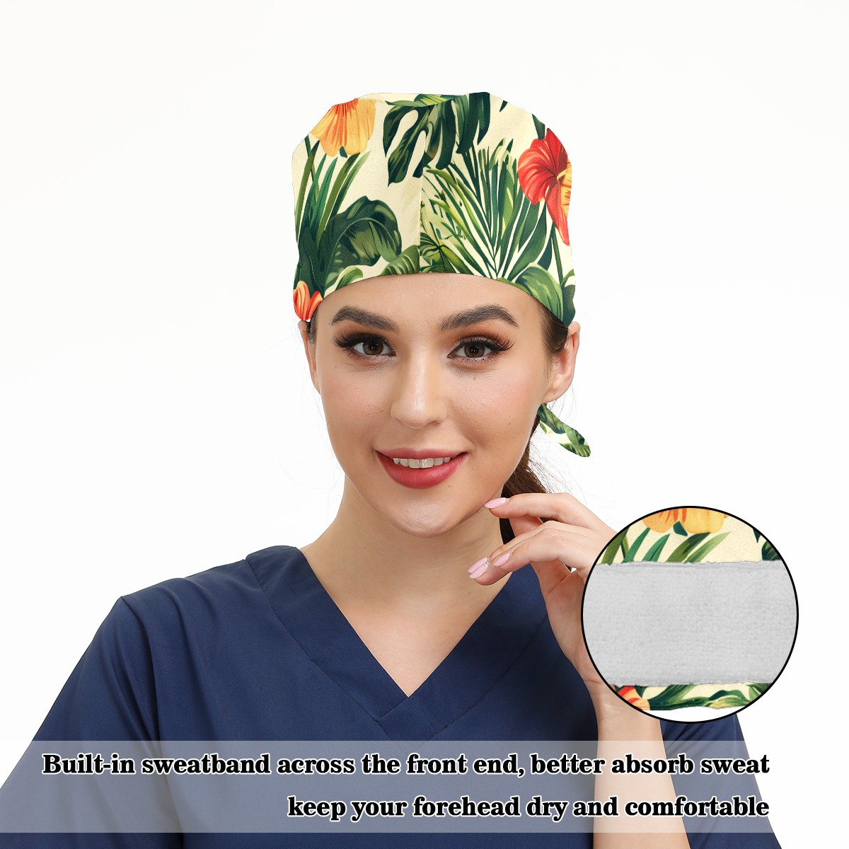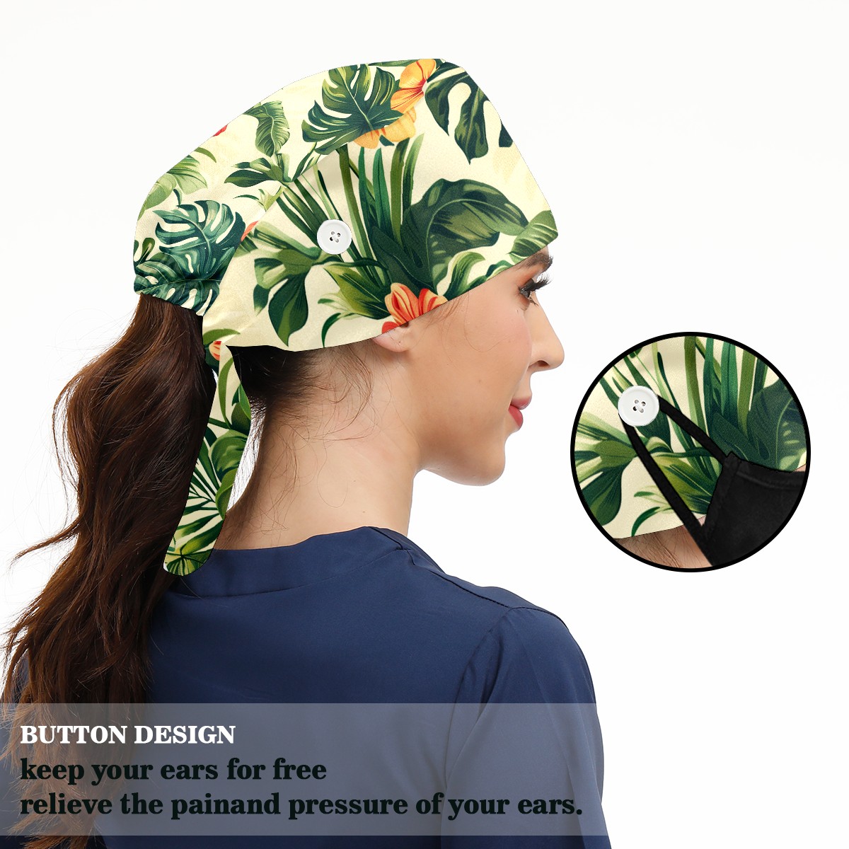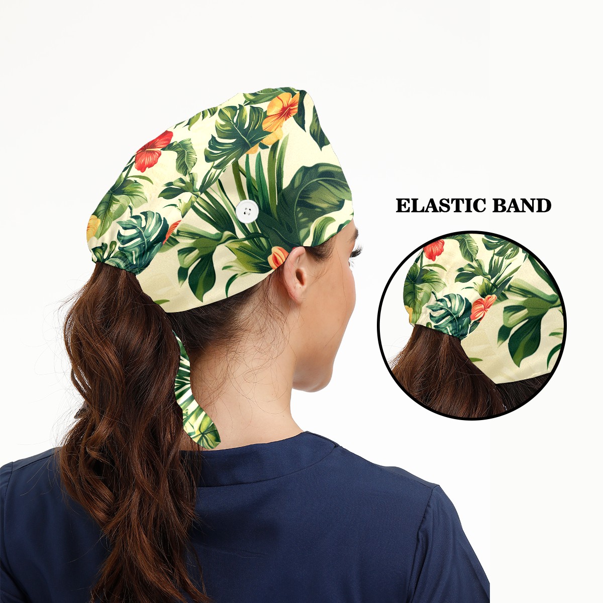 Working Caps with Button & Sweatband Satin Lined Cotton Adjustable Nurse Hats Elastic Band Scrub Cap Surgeon Hat Tropical Plant