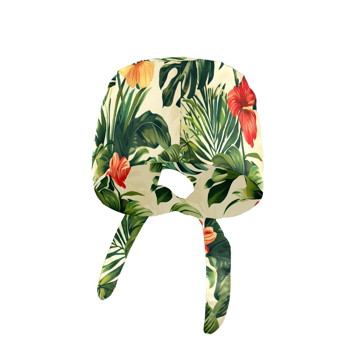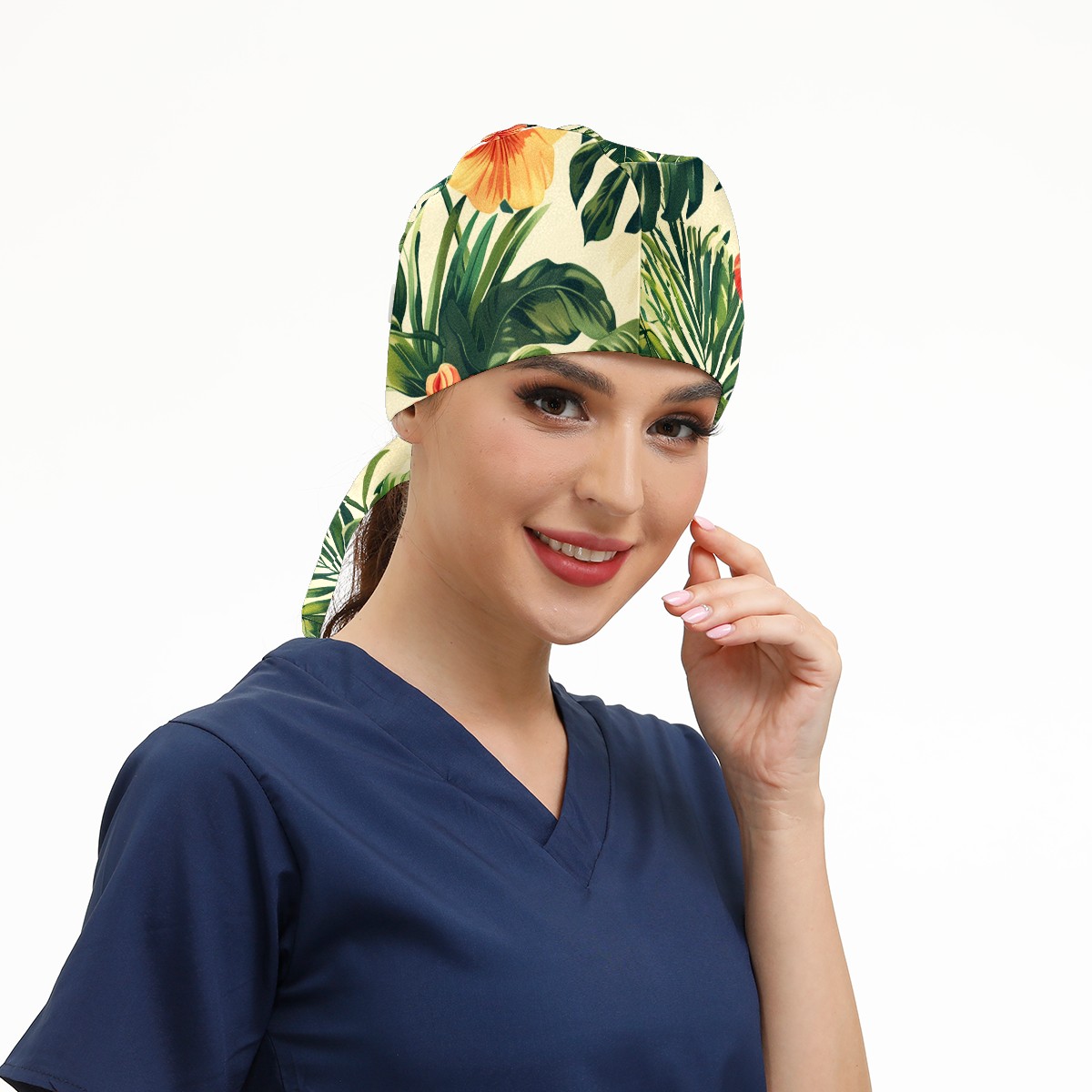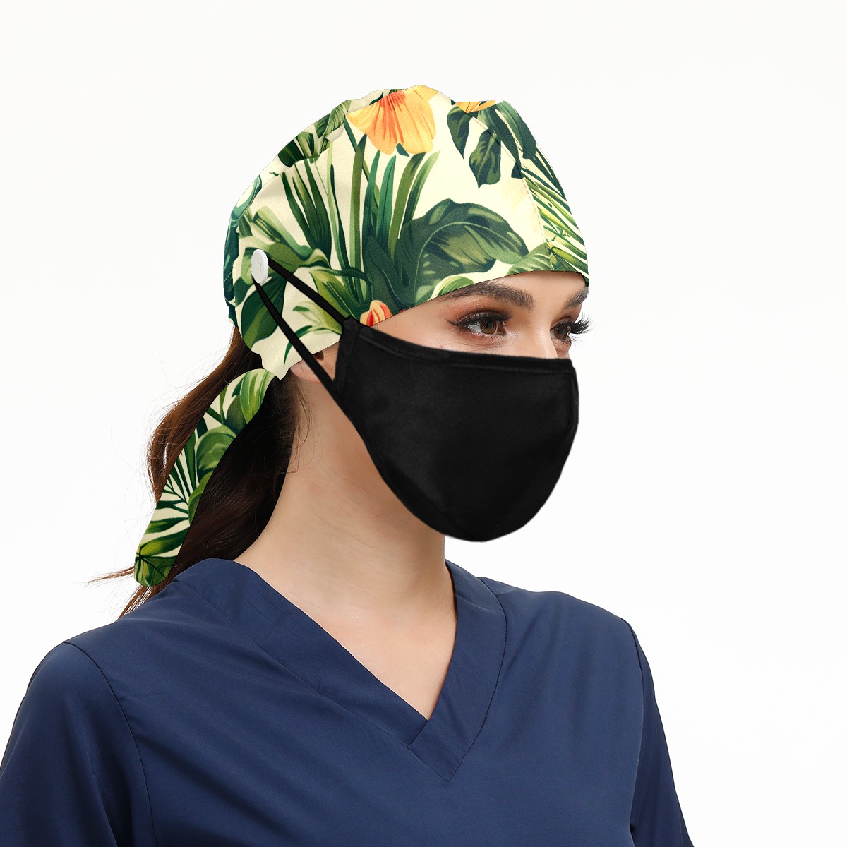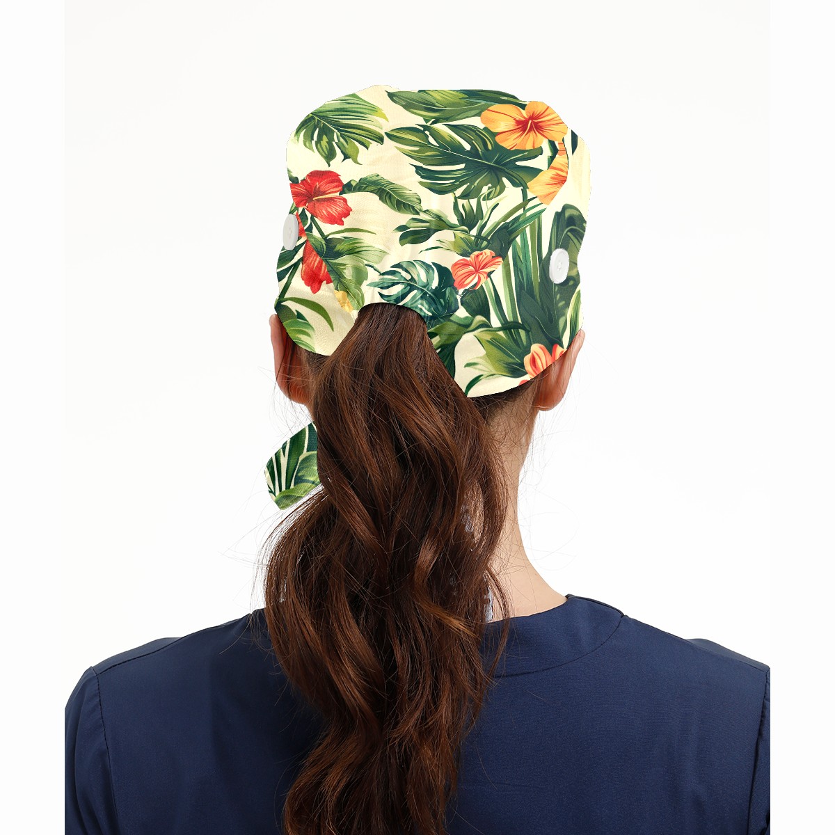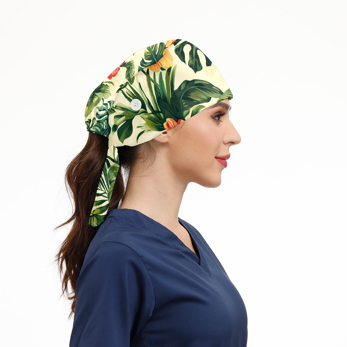 Working Caps with Button & Sweatband Satin Lined Cotton Adjustable Nurse Hats Elastic Band Scrub Cap Surgeon Hat Tropical Plant