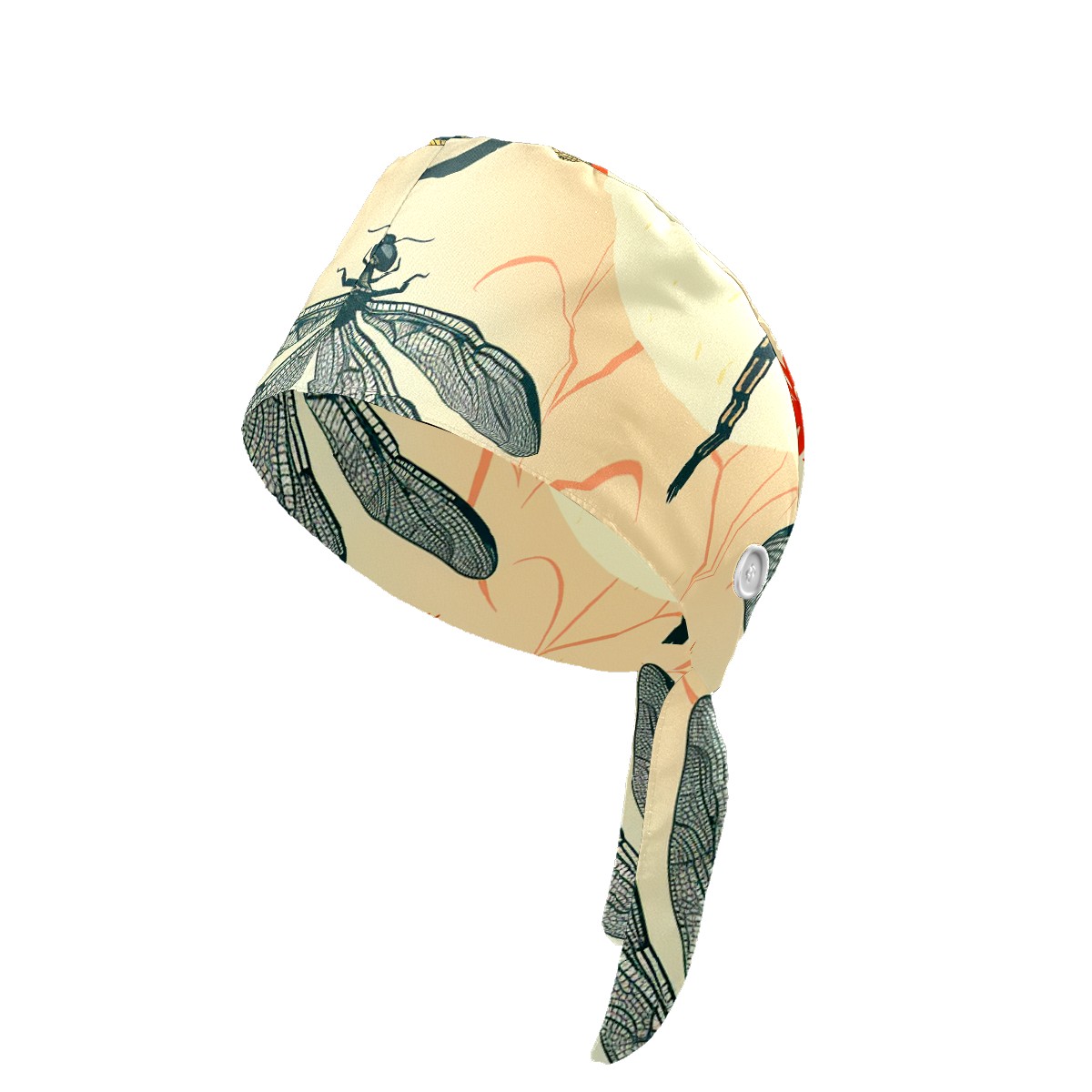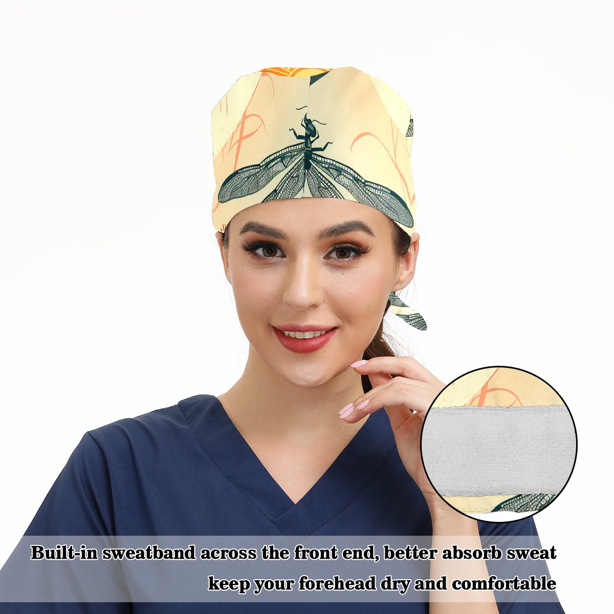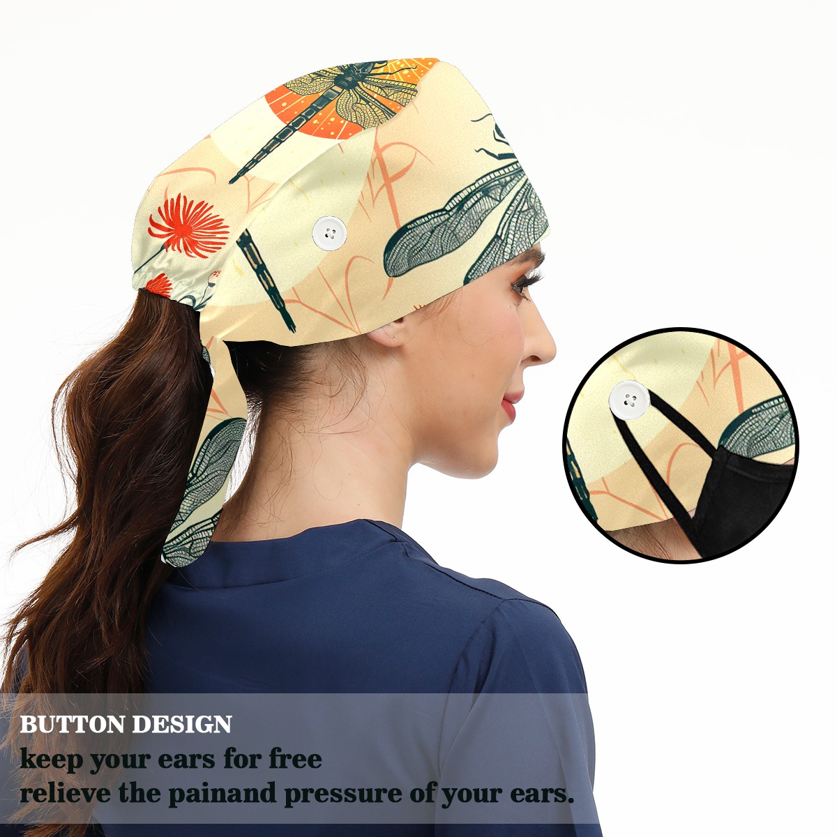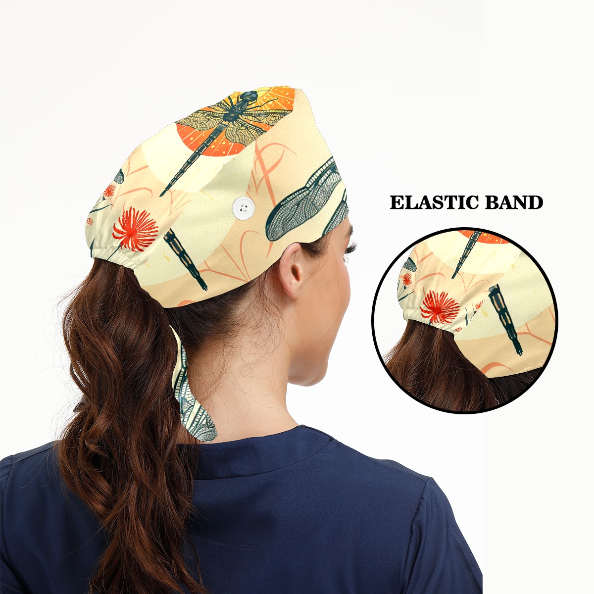 Working Caps with Button & Sweatband Satin Lined Cotton Adjustable Nurse Hats Elastic Band Scrub Cap Surgeon Hat Dragonfly (38)