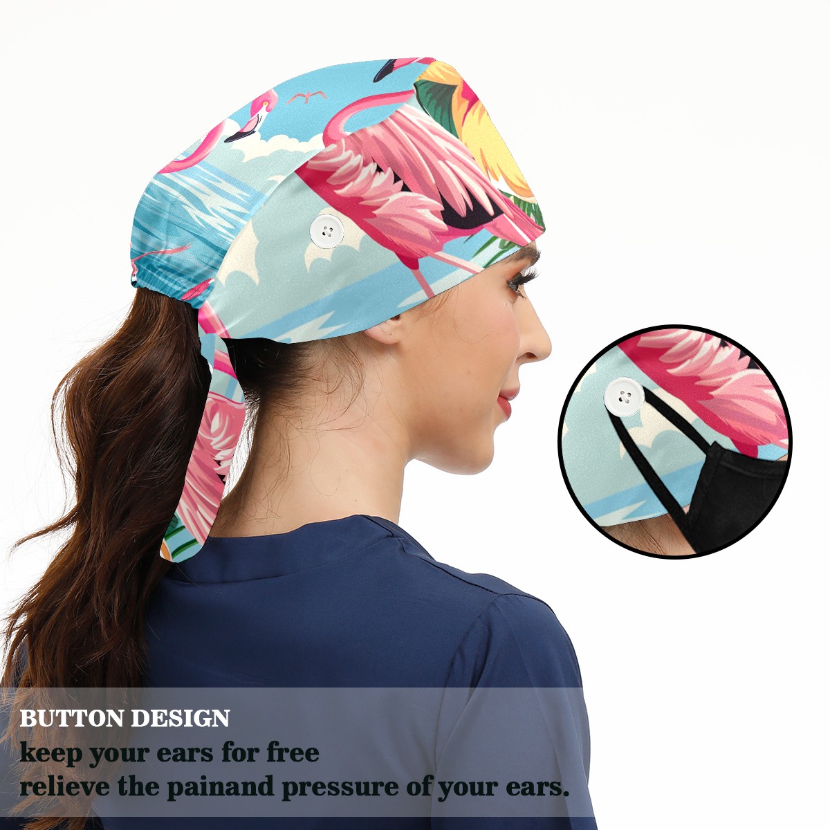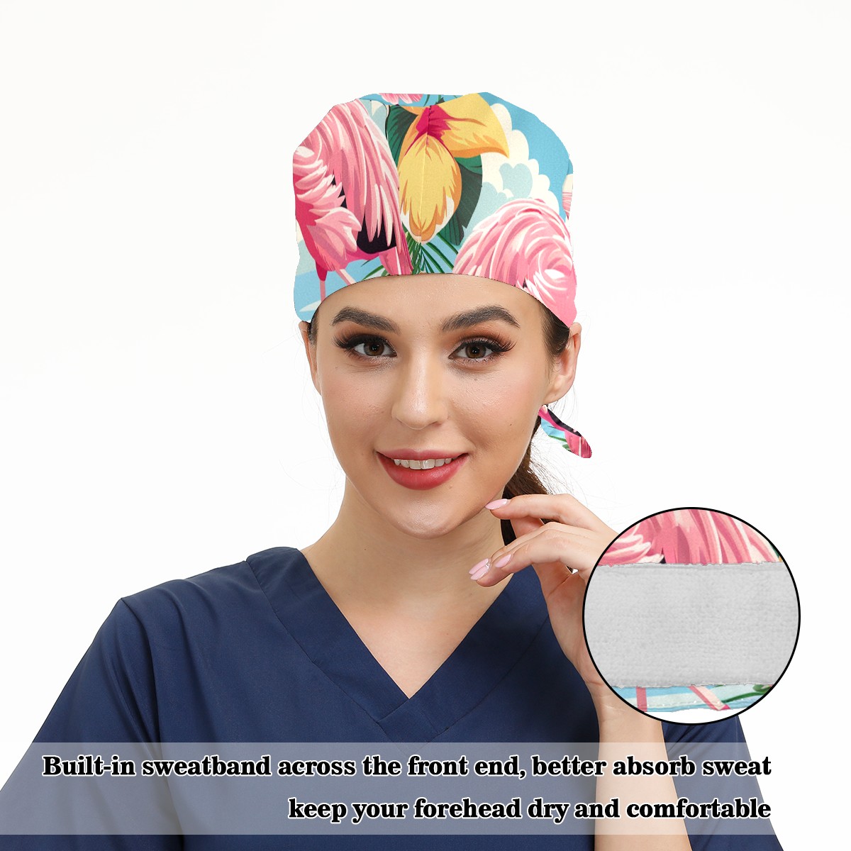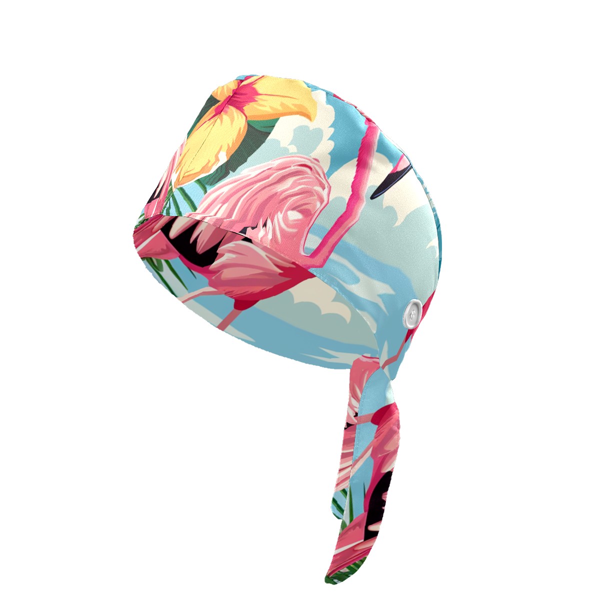 Working Caps with Button & Sweatband Satin Lined Cotton Adjustable Nurse Hats Elastic Band Scrub Cap Surgeon Hat Flamingo (21)