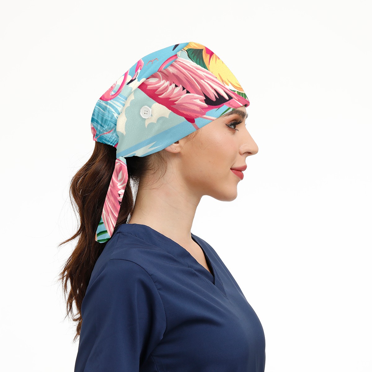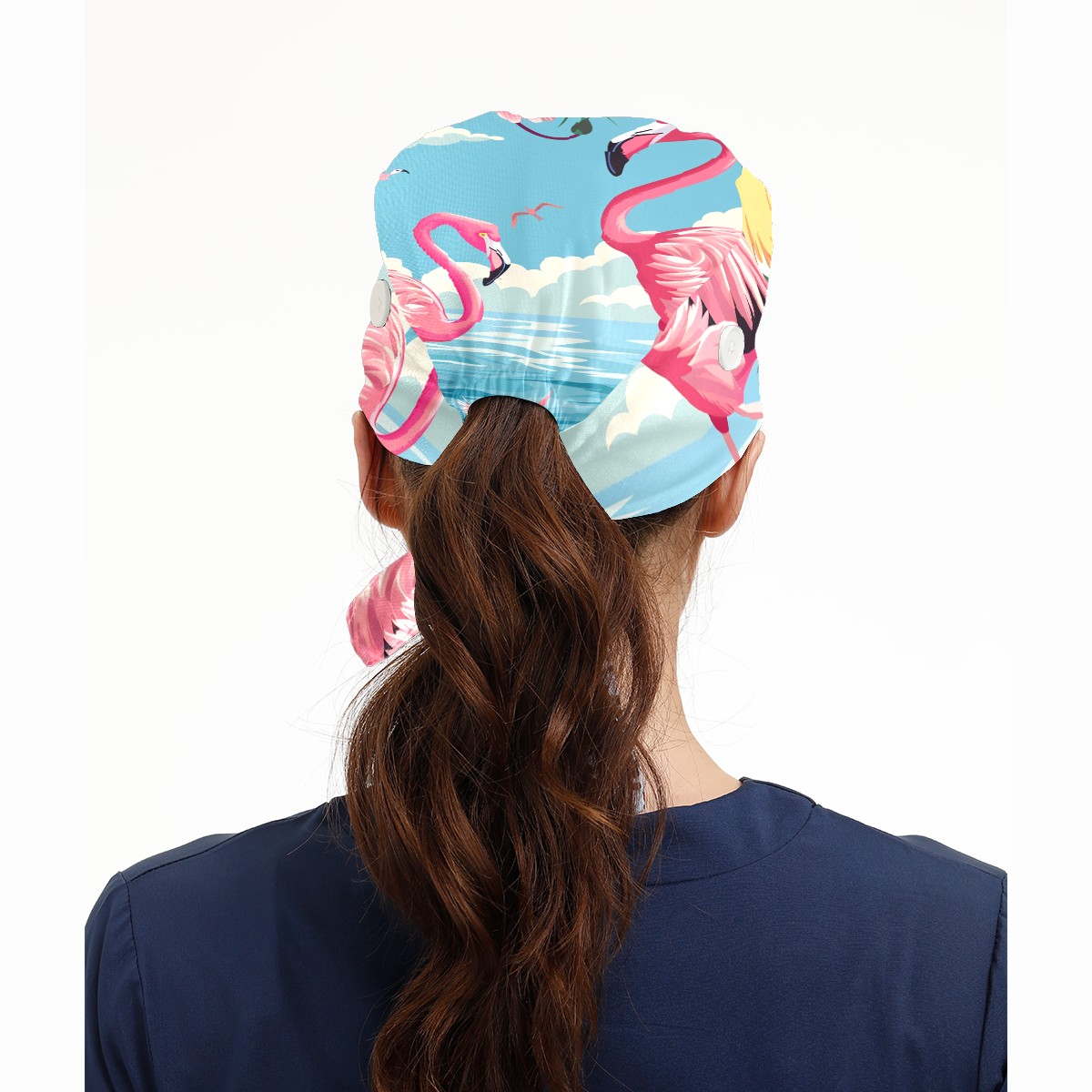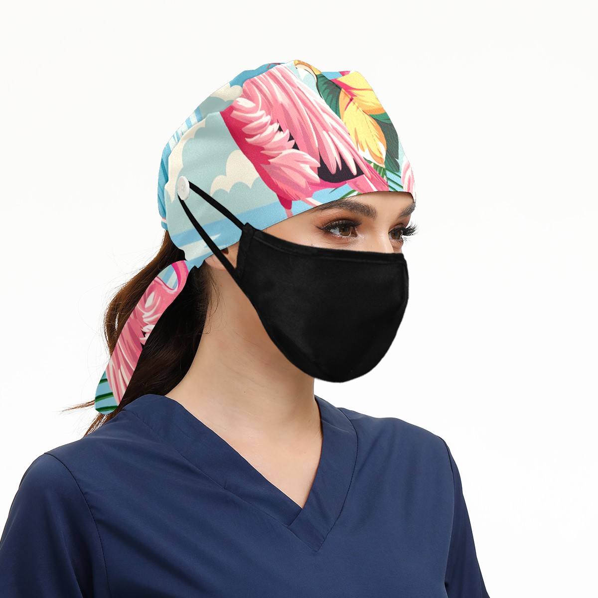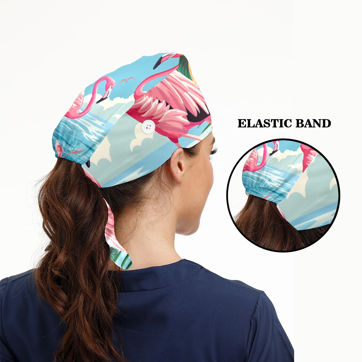 Working Caps with Button & Sweatband Satin Lined Cotton Adjustable Nurse Hats Elastic Band Scrub Cap Surgeon Hat Flamingo (21)