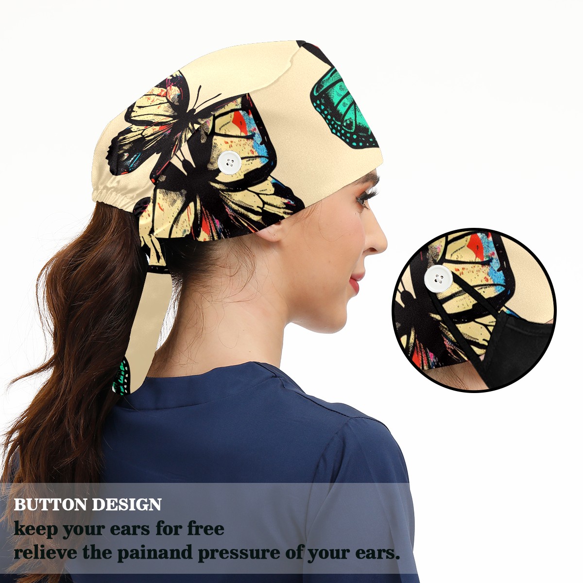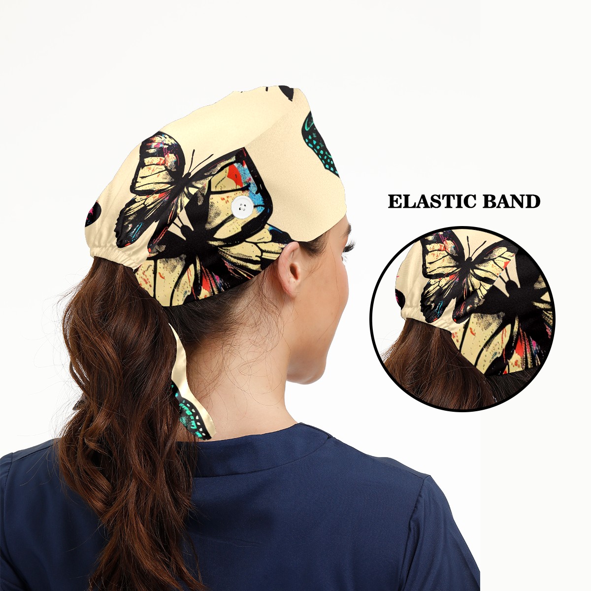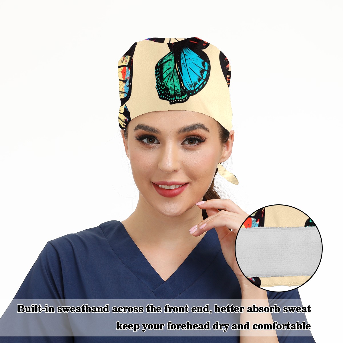 Working Caps with Button & Sweatband Satin Lined Cotton Adjustable Nurse Hats Elastic Band Scrub Cap Surgeon Hat Butterfly (7)