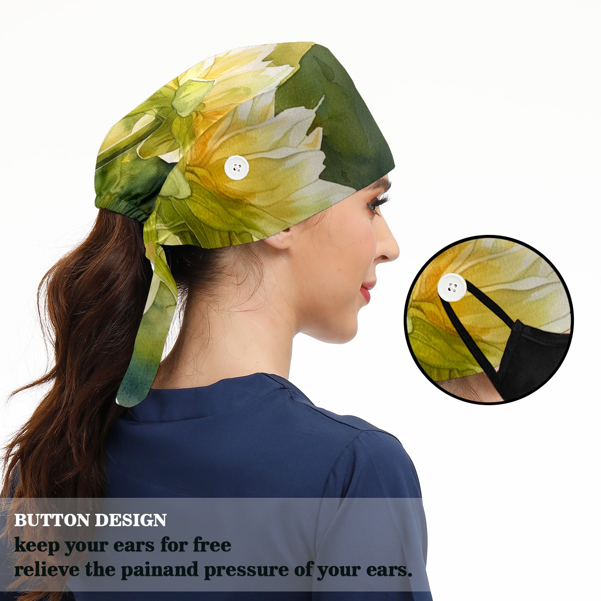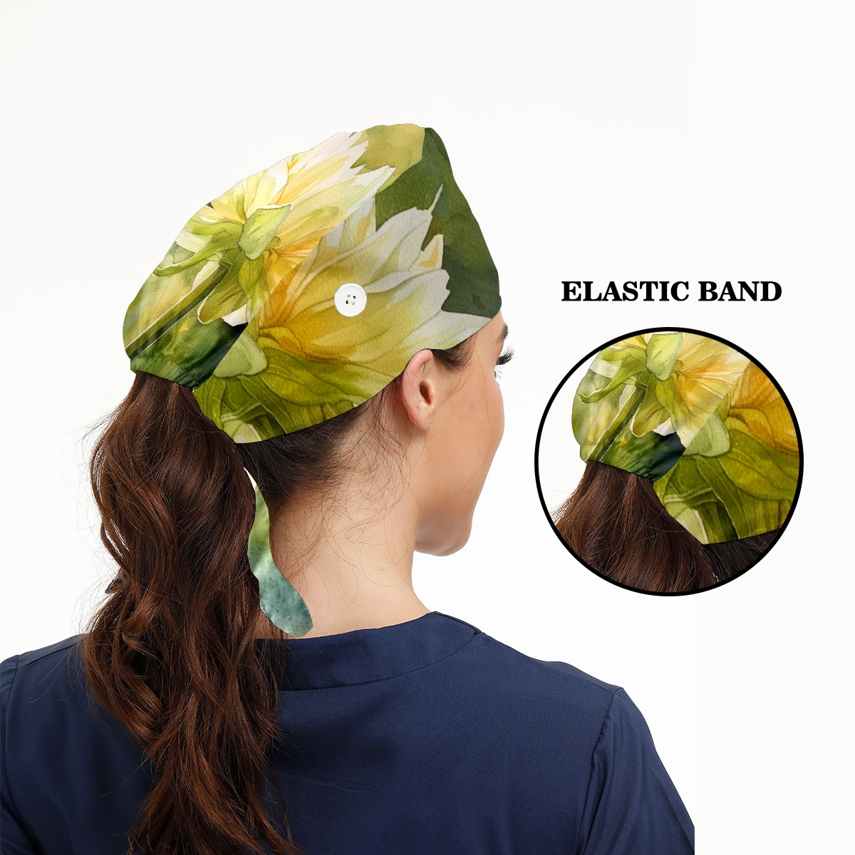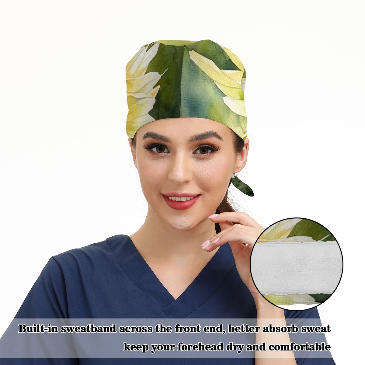 Working Caps with Button & Sweatband Satin Lined Cotton Adjustable Nurse Hats Elastic Band Scrub Cap Surgeon Hat Flower (14)