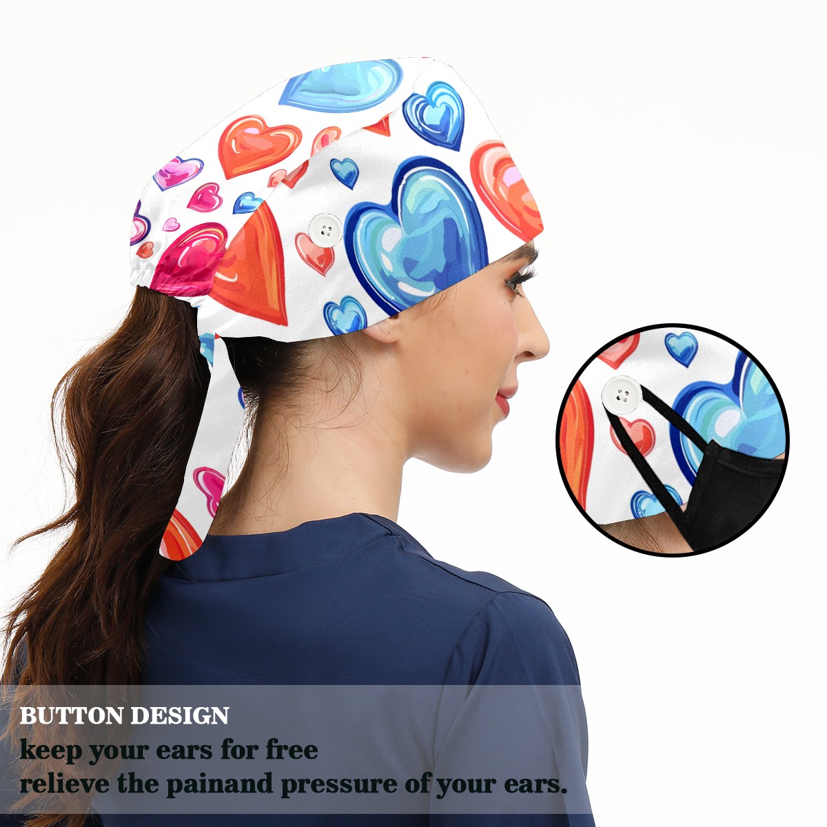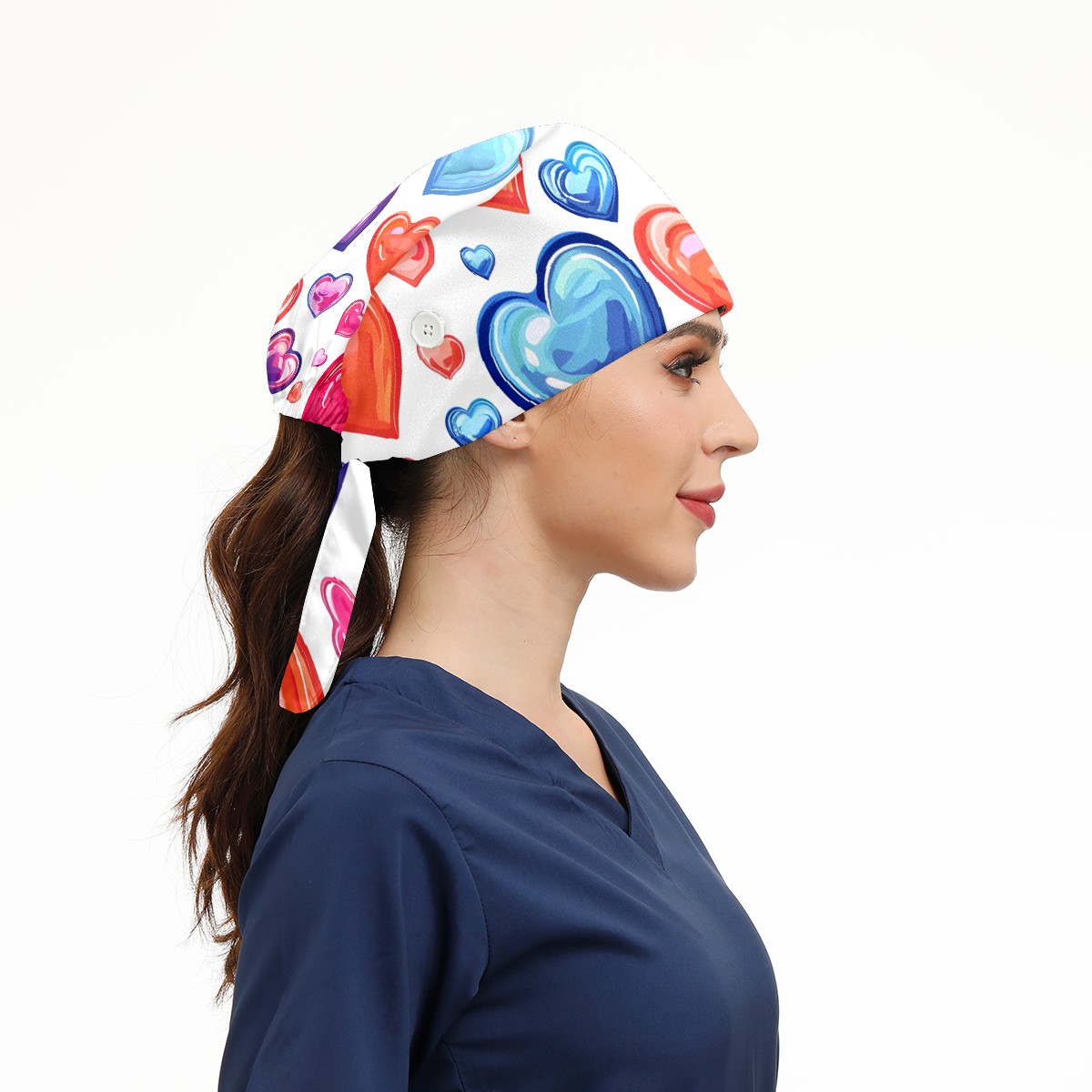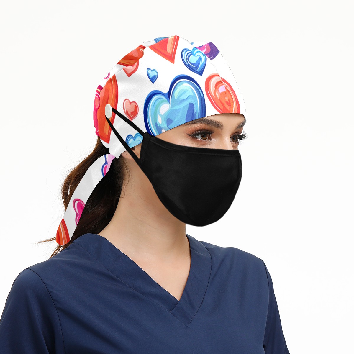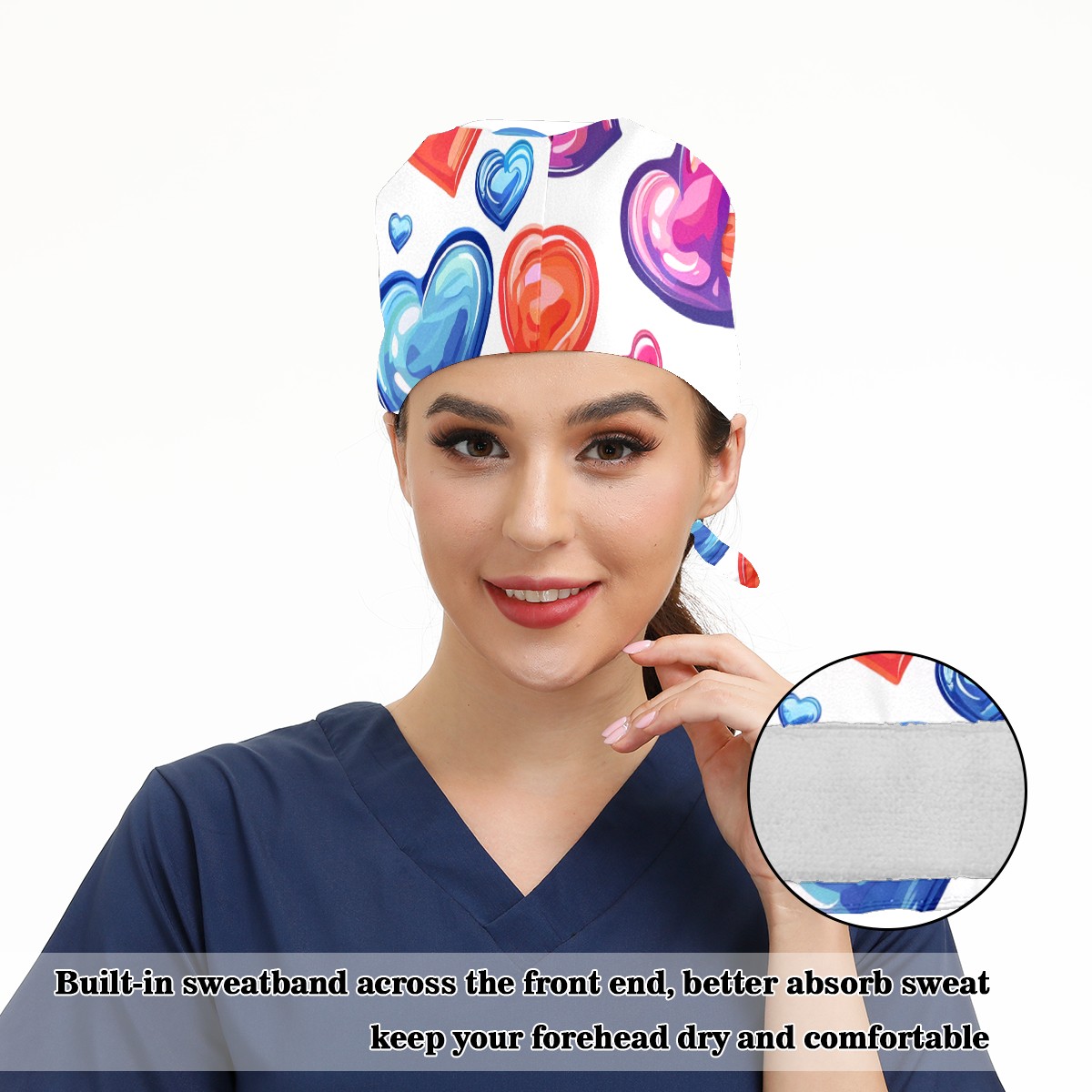 Working Caps with Button & Sweatband Satin Lined Cotton Adjustable Nurse Hats Elastic Band Scrub Cap Surgeon Hat Heart (21)