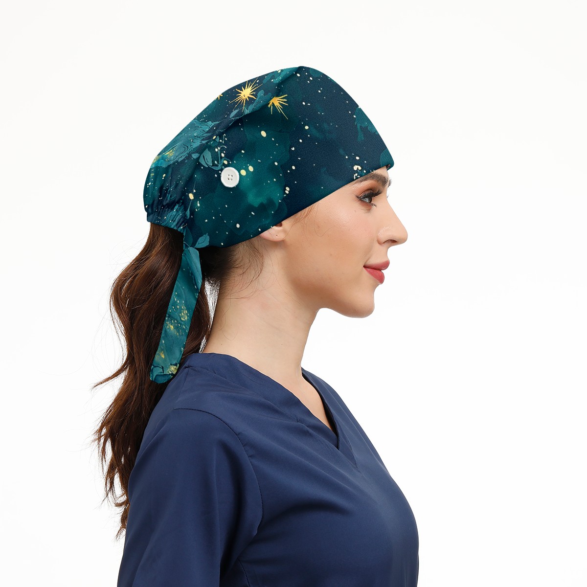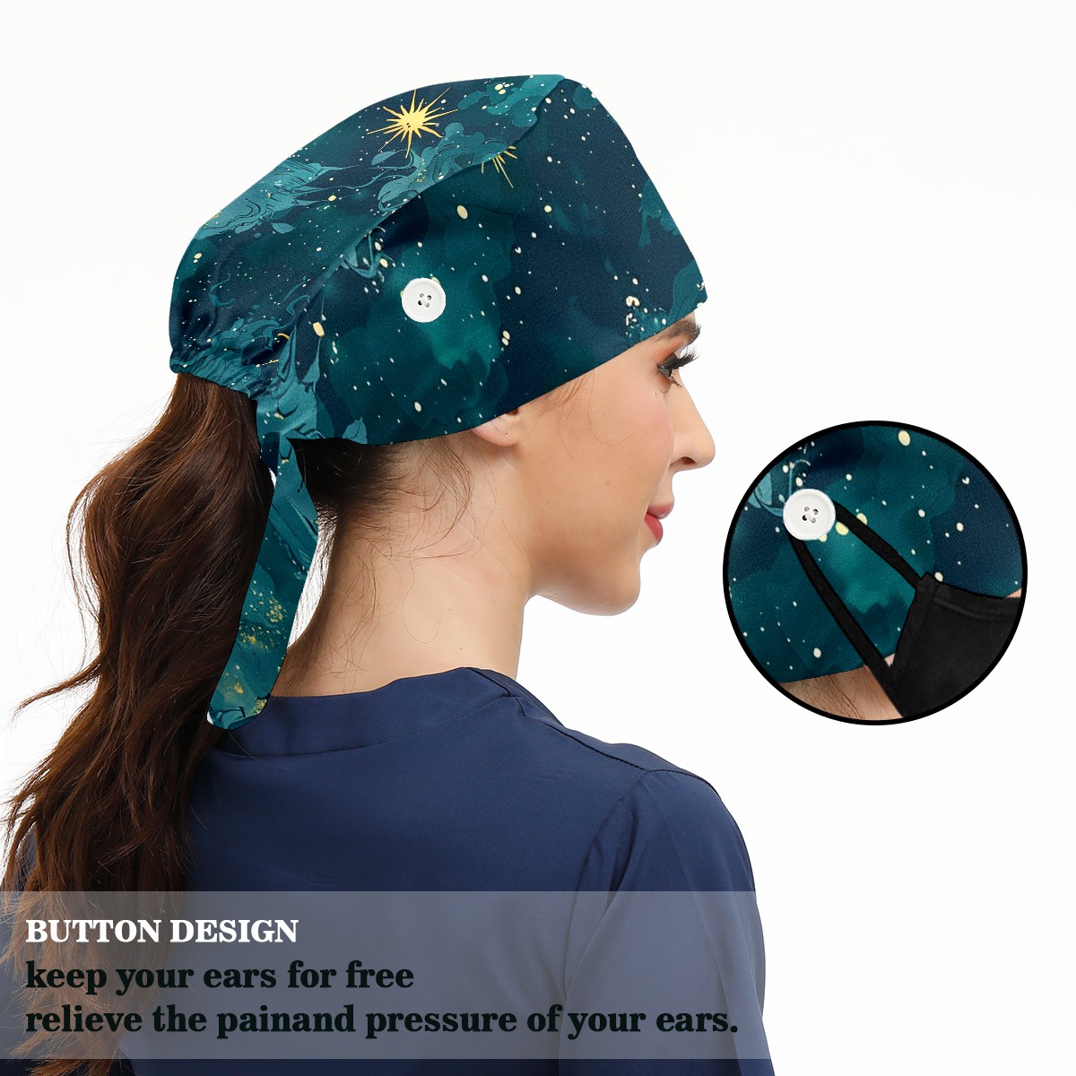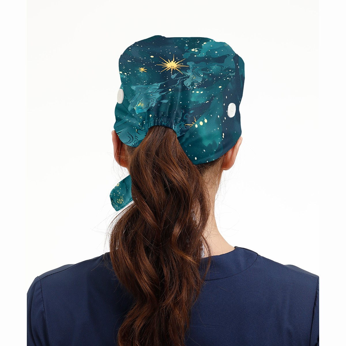 Working Caps with Button & Sweatband Satin Lined Cotton Adjustable Nurse Hats Elastic Band Scrub Cap Surgeon Hat Starry Sky Universe (71)