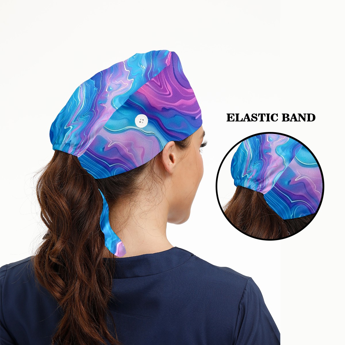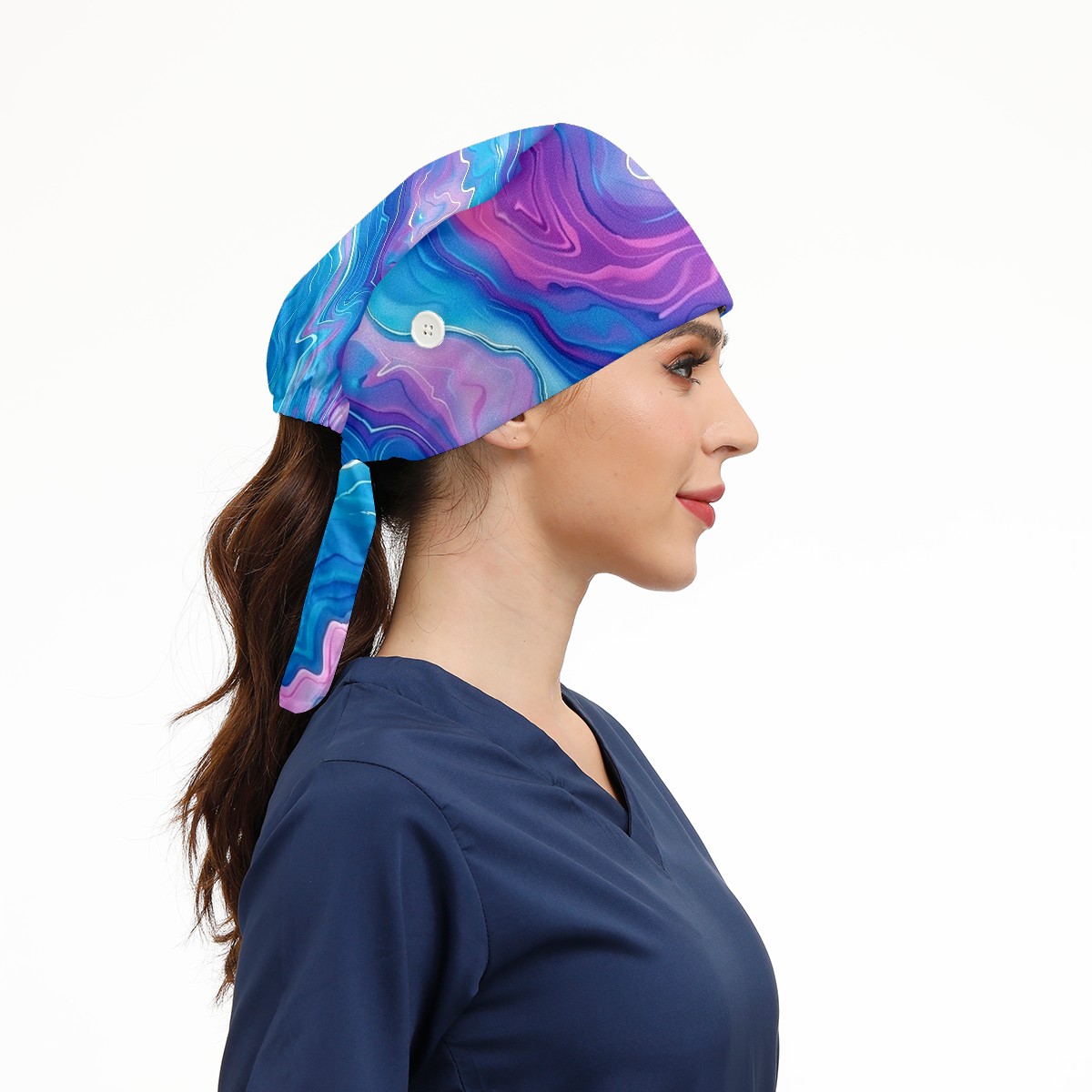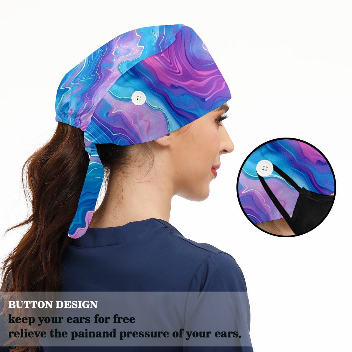 Working Caps with Button & Sweatband Satin Lined Cotton Adjustable Nurse Hats Elastic Band Scrub Cap Surgeon Hat Marble (62)