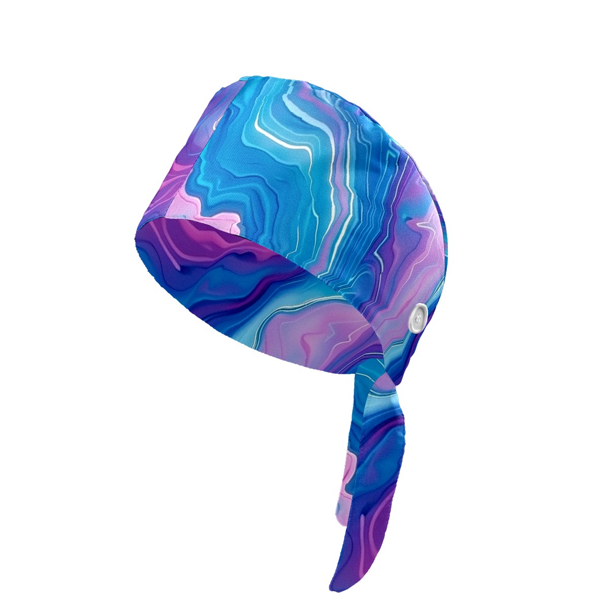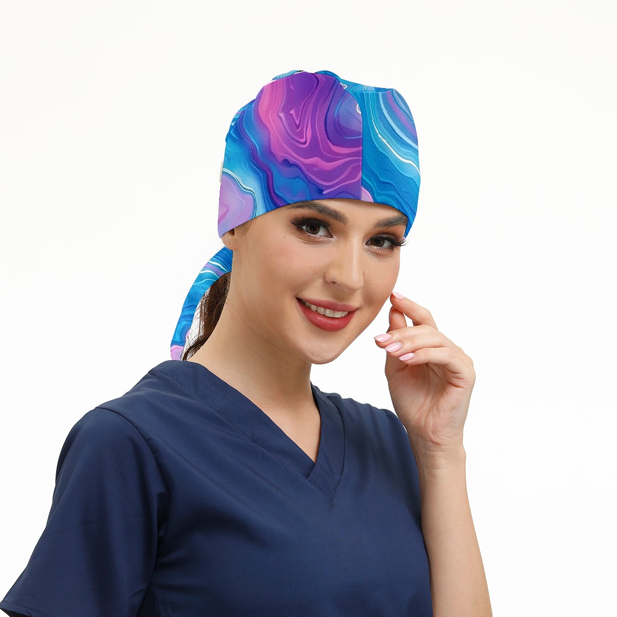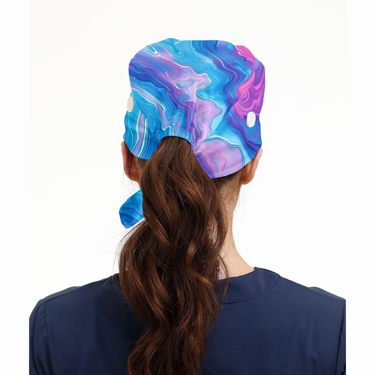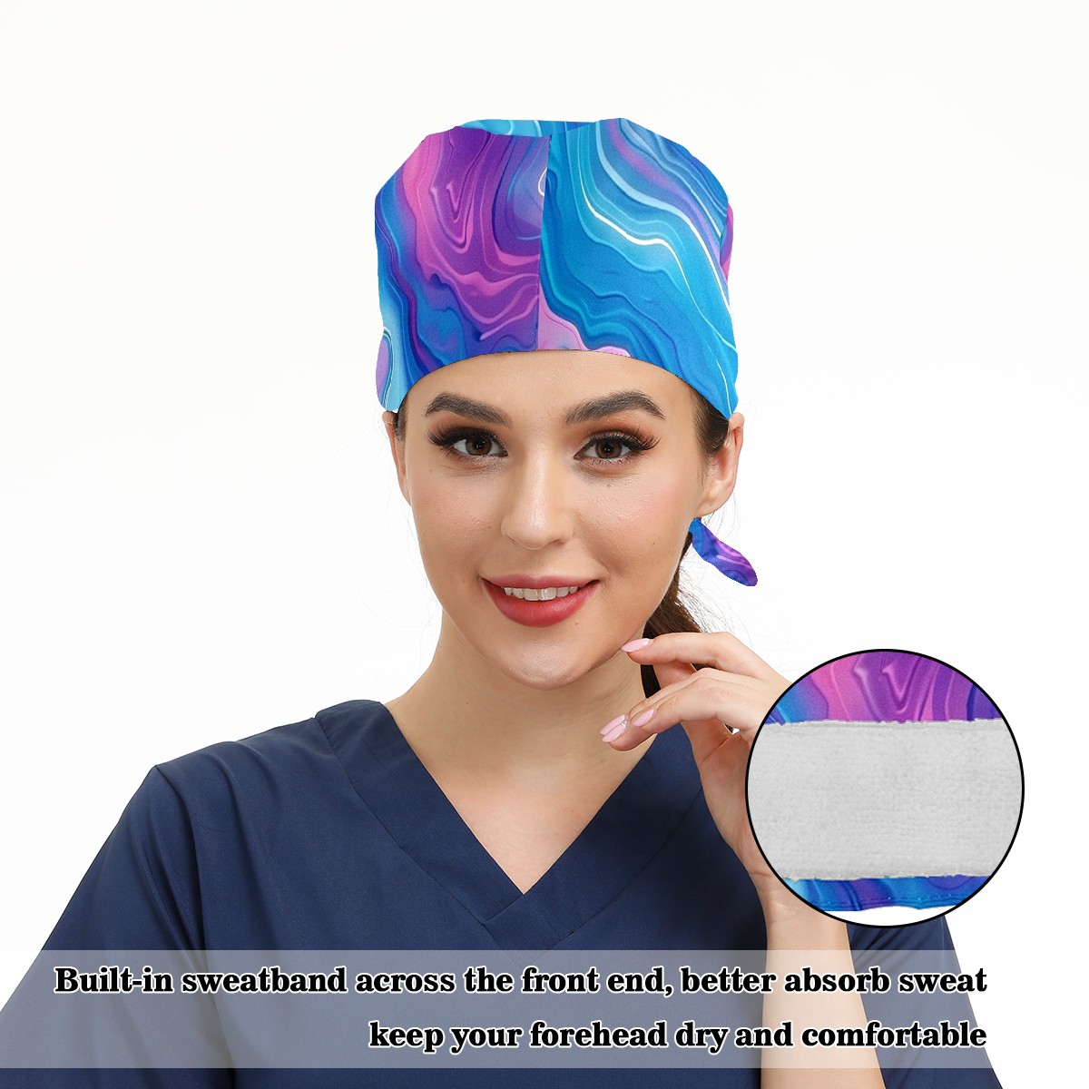 Working Caps with Button & Sweatband Satin Lined Cotton Adjustable Nurse Hats Elastic Band Scrub Cap Surgeon Hat Marble (62)