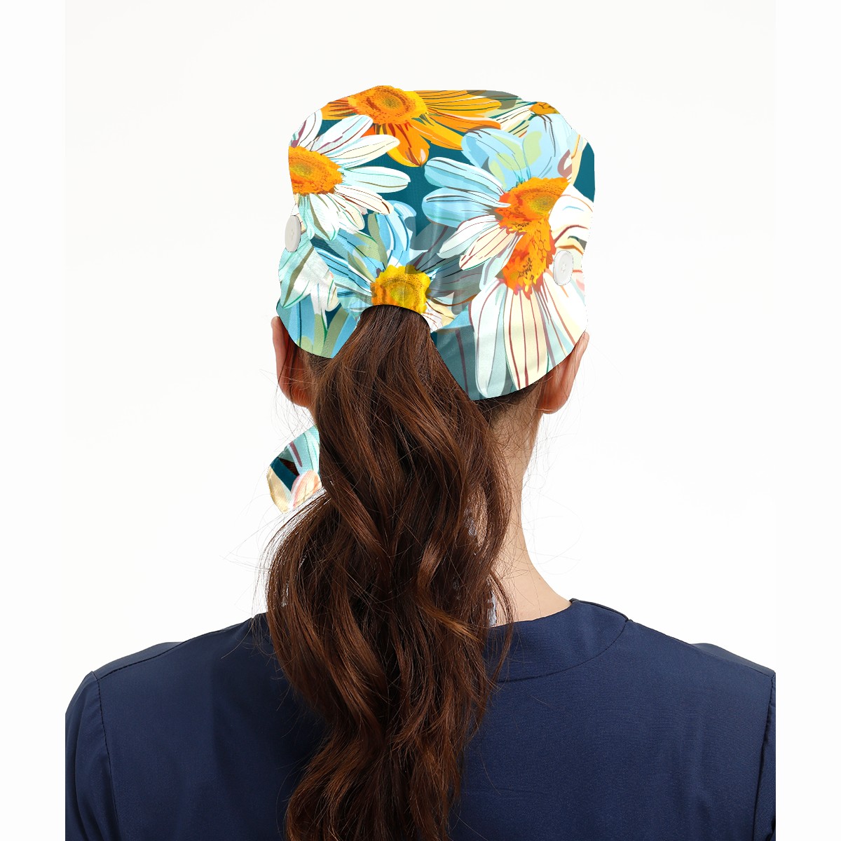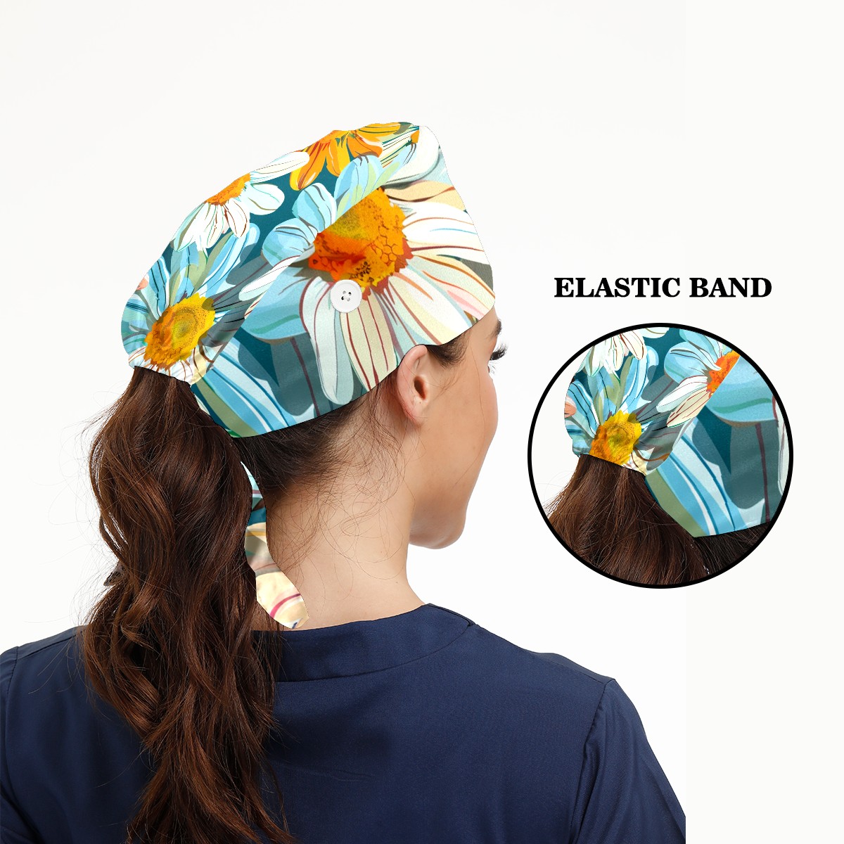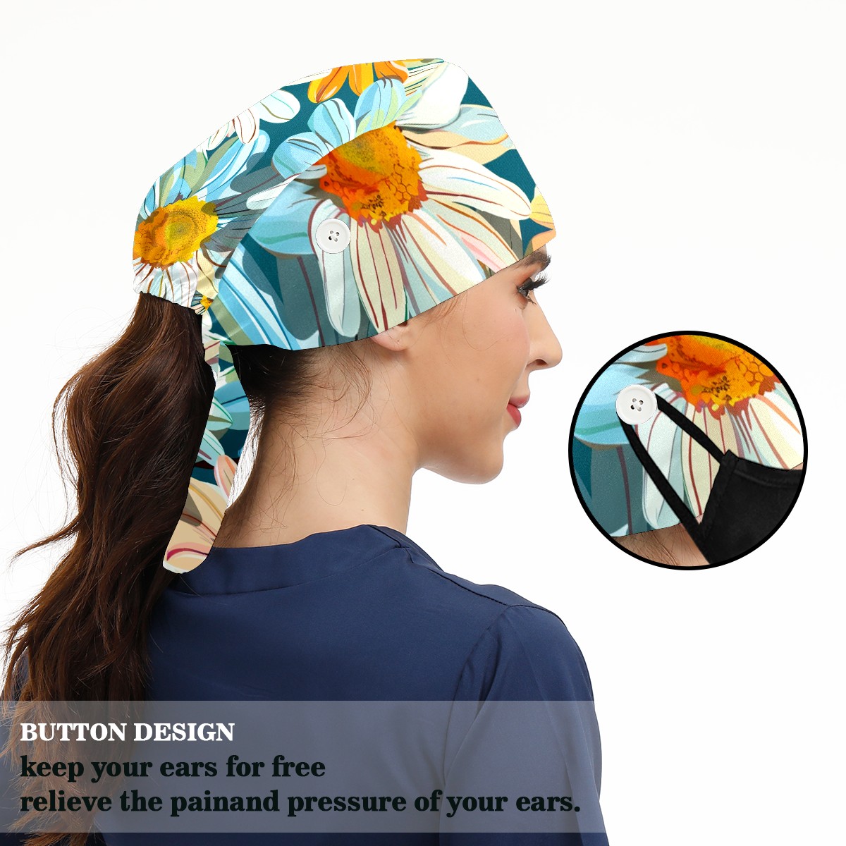 Working Caps with Button & Sweatband Satin Lined Cotton Adjustable Nurse Hats Elastic Band Scrub Cap Surgeon Hat Daisy (16)