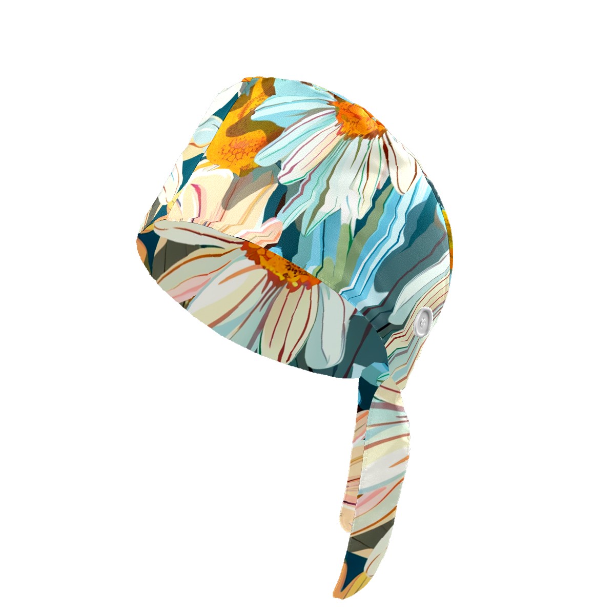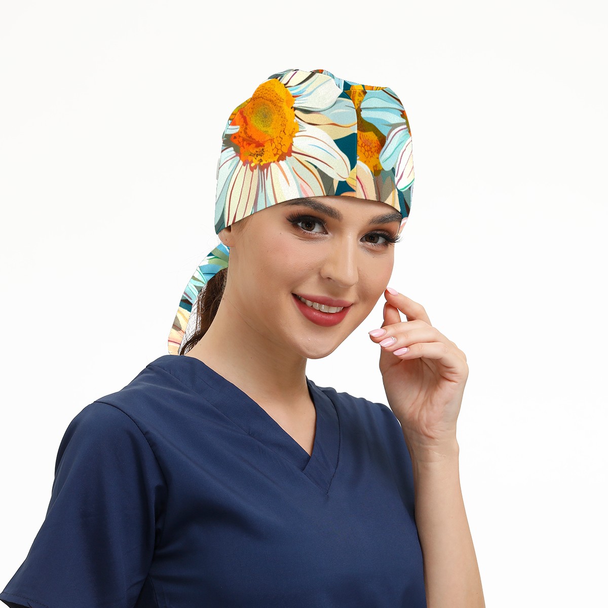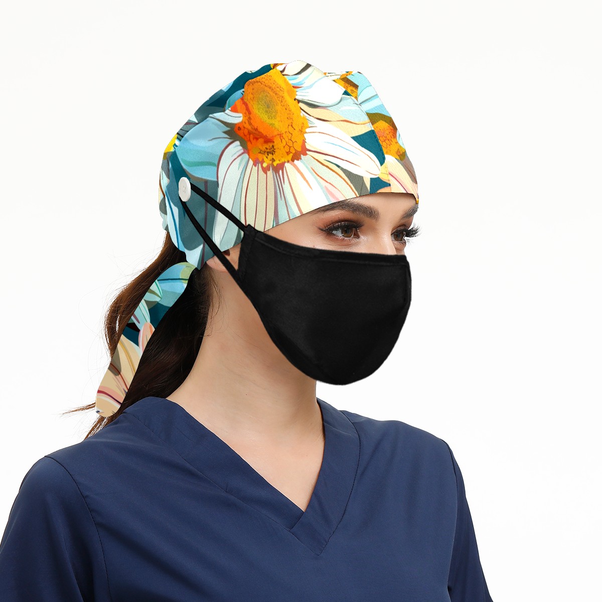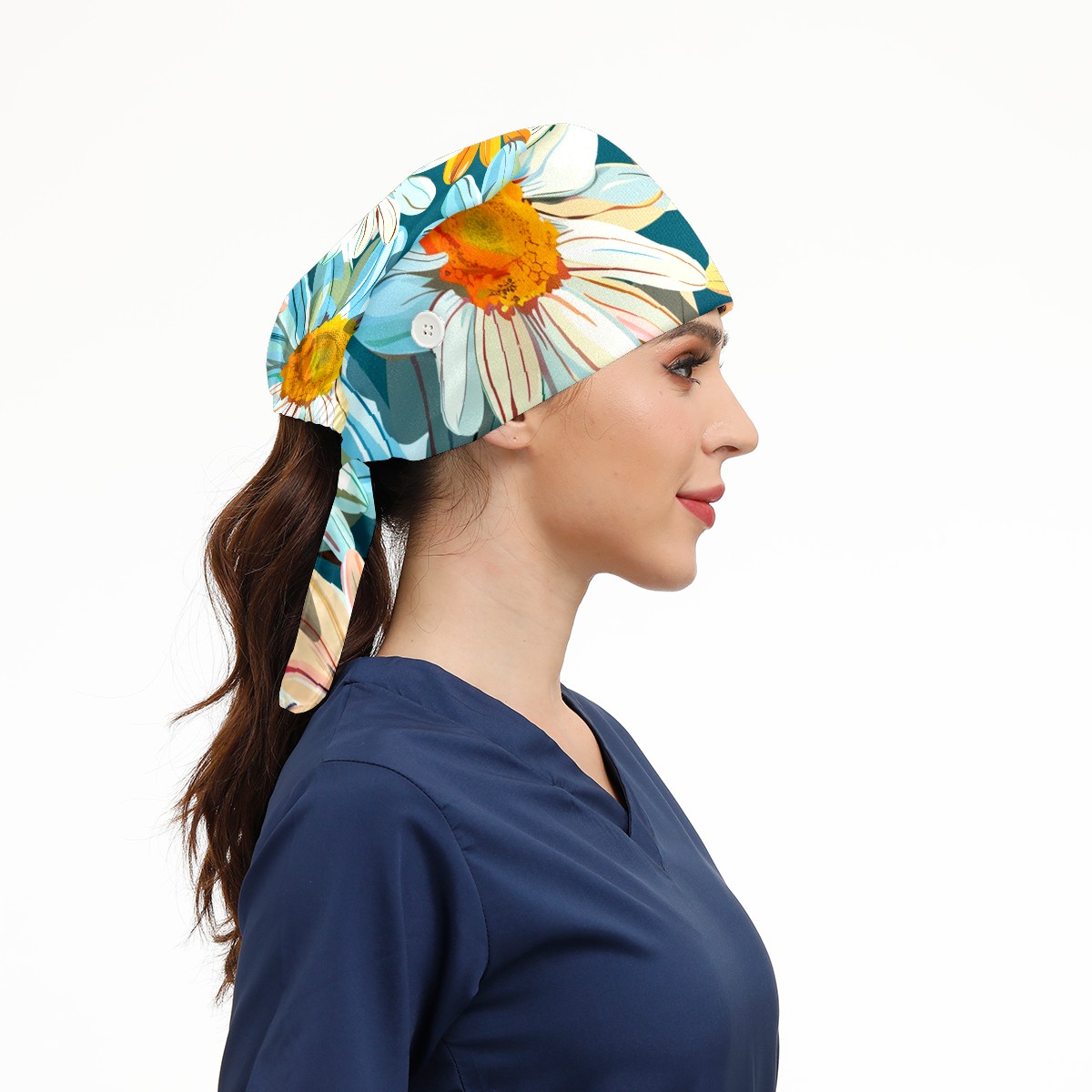 Working Caps with Button & Sweatband Satin Lined Cotton Adjustable Nurse Hats Elastic Band Scrub Cap Surgeon Hat Daisy (16)