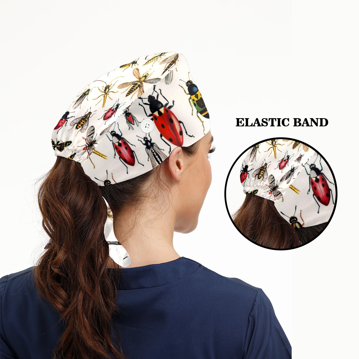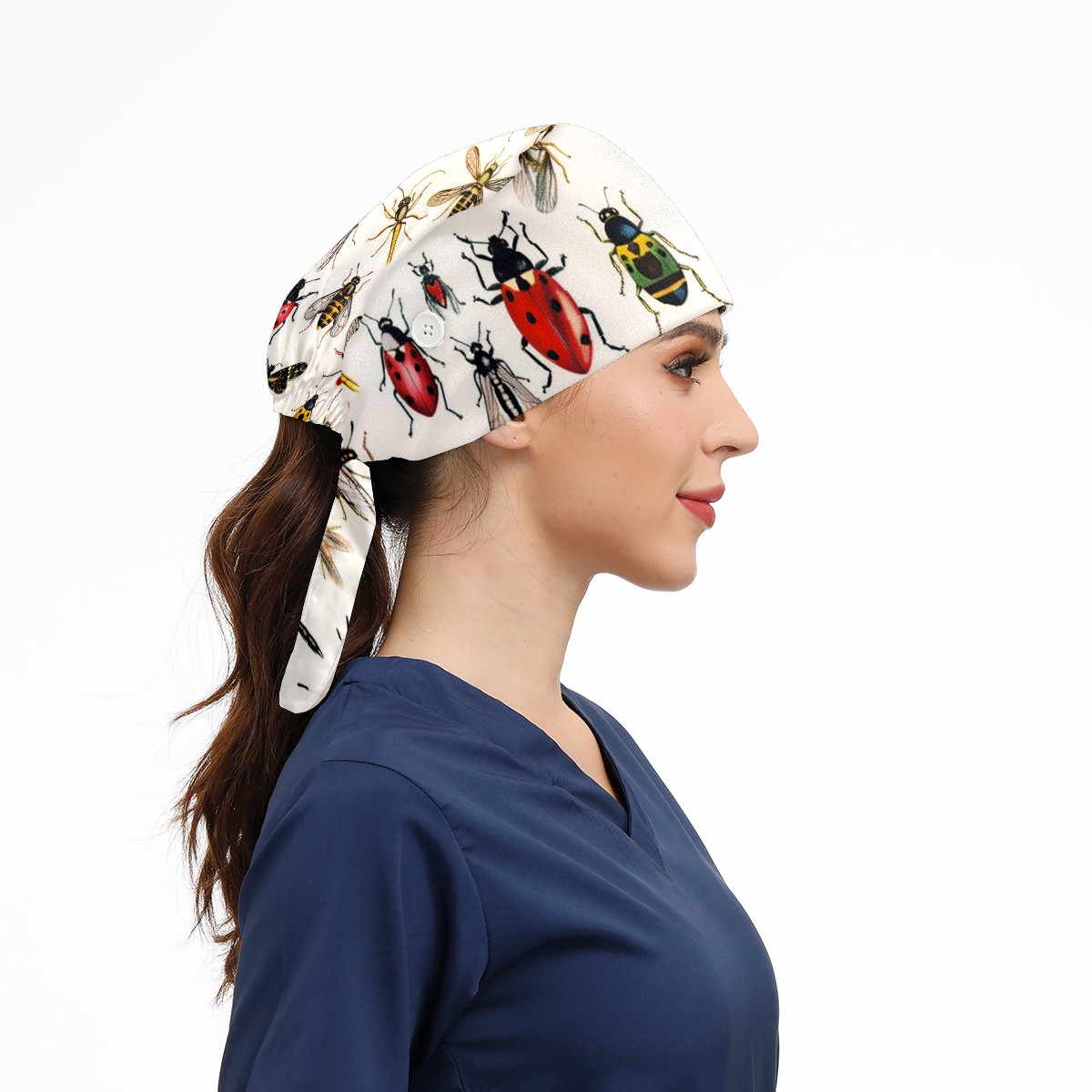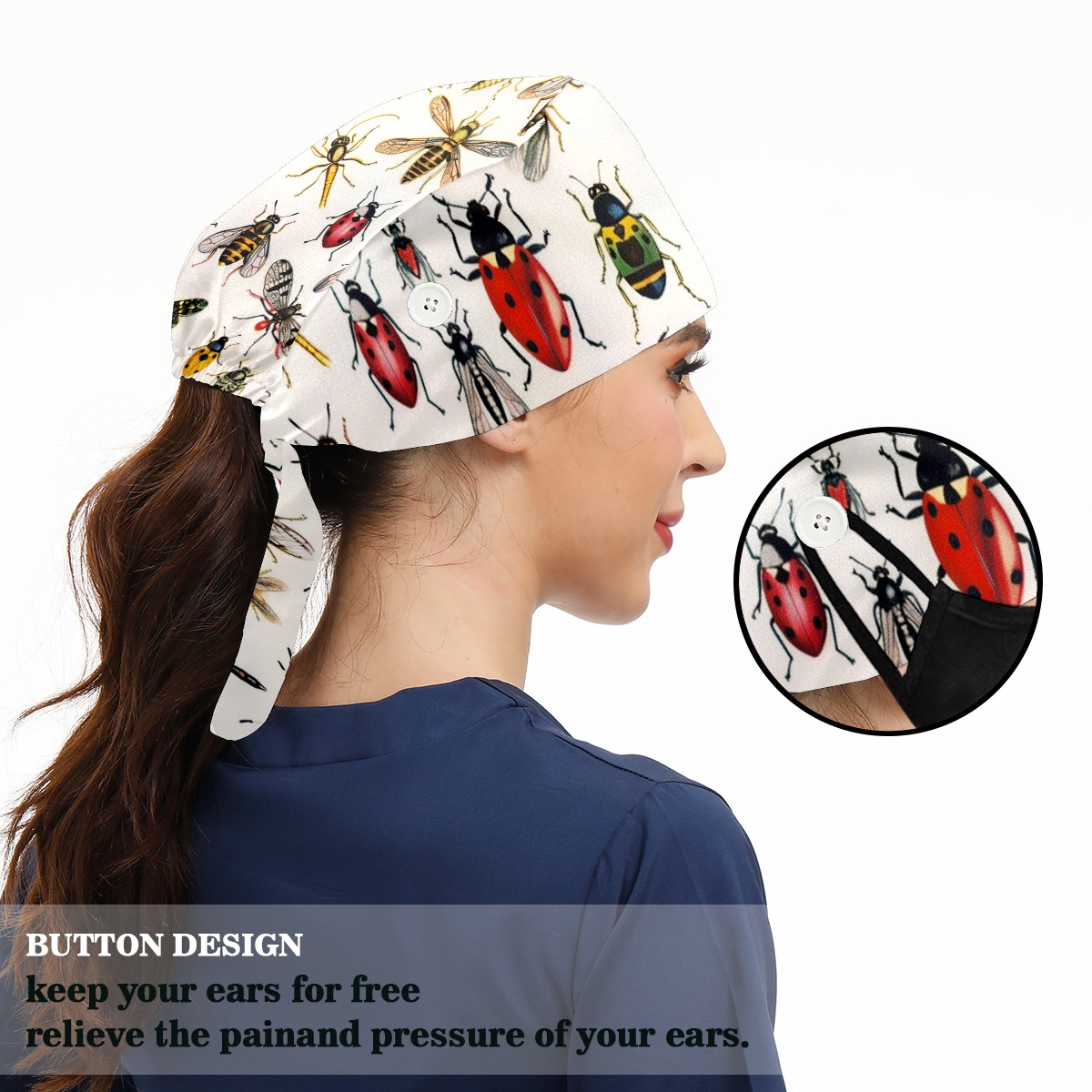 Working Caps with Button & Sweatband Satin Lined Cotton Adjustable Nurse Hats Elastic Band Scrub Cap Surgeon Hat Insects (2)