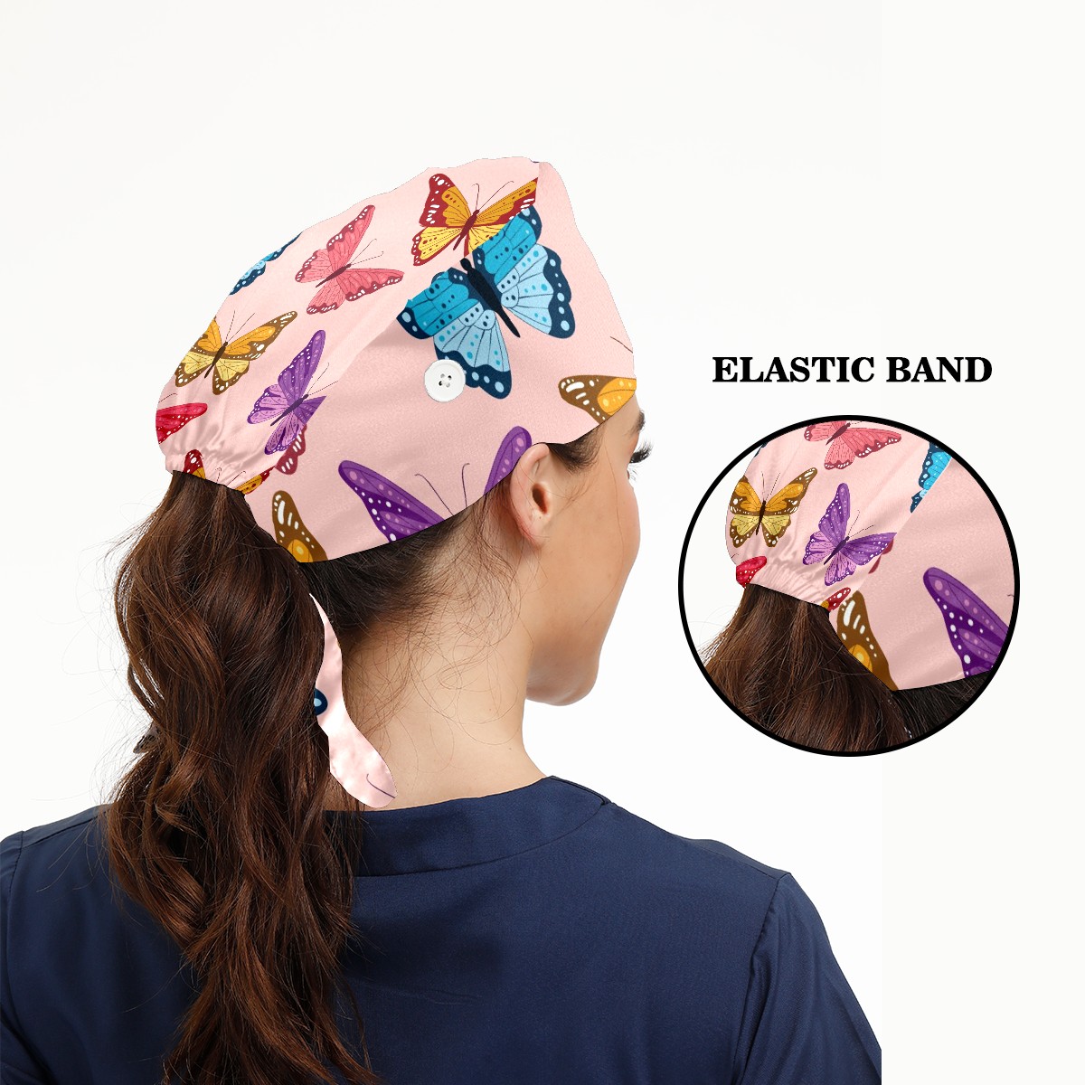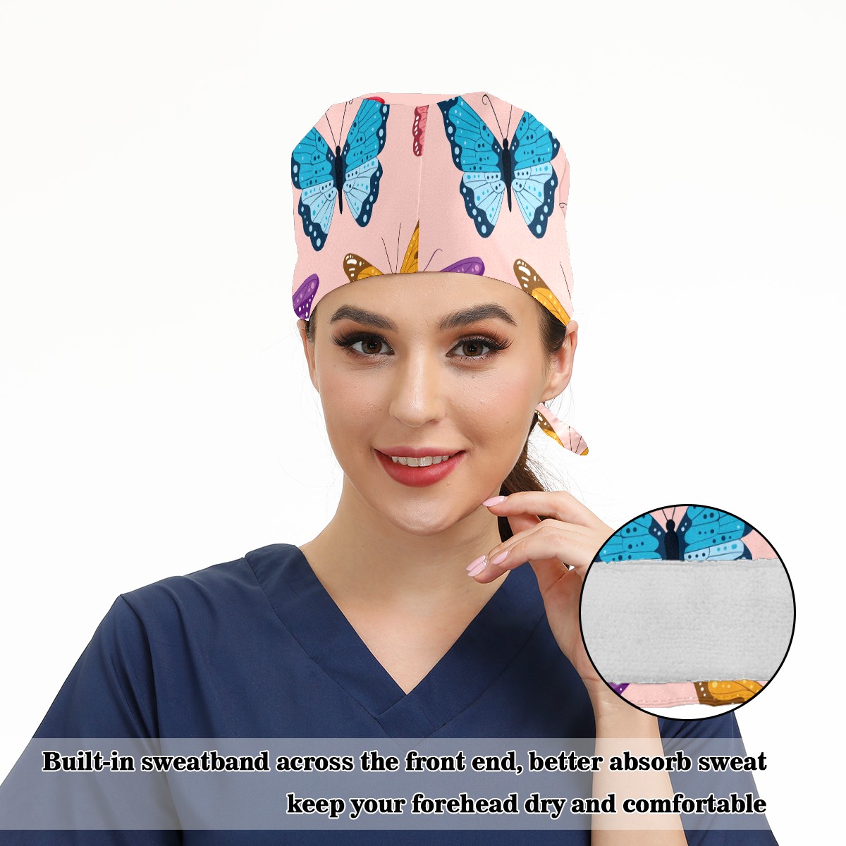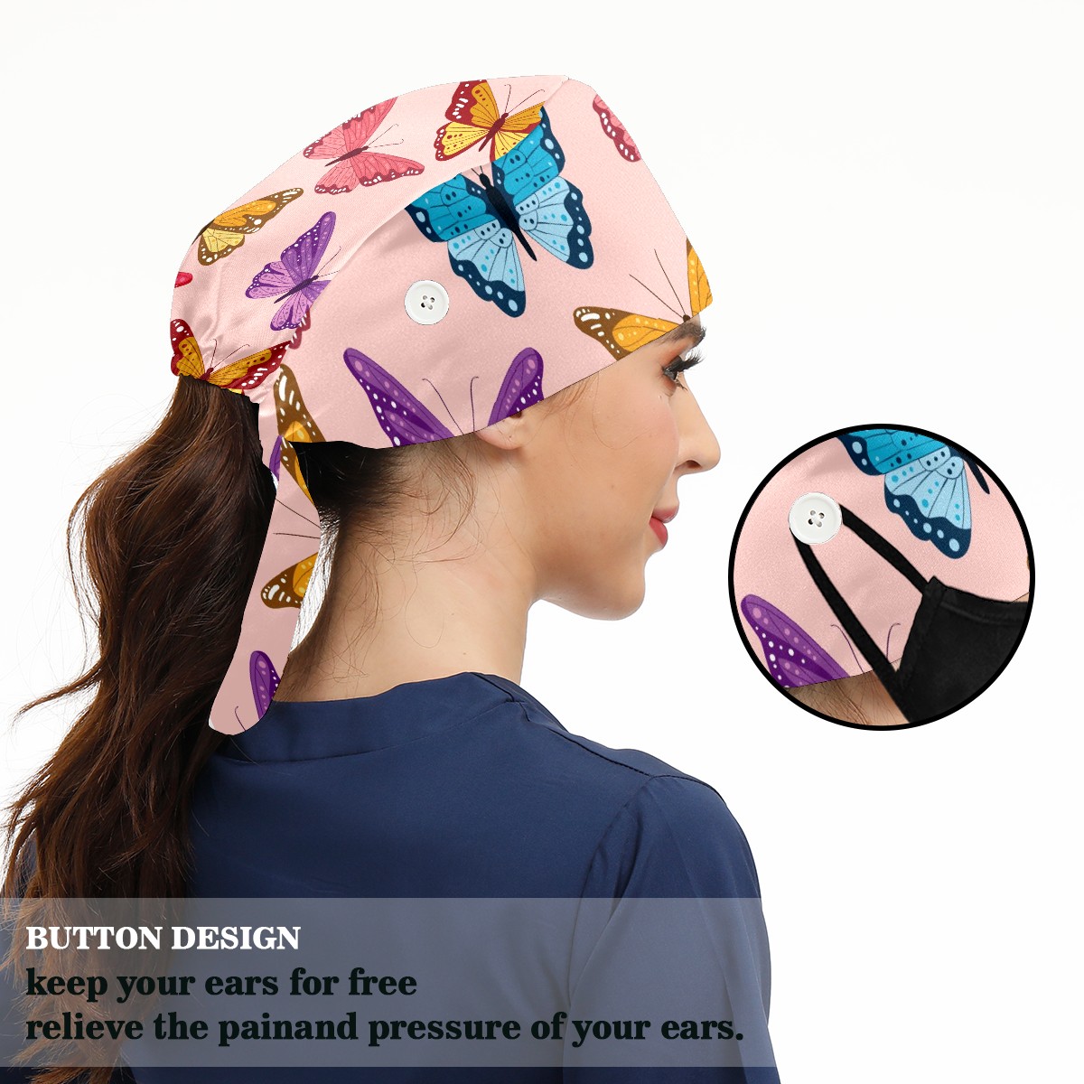 Working Caps with Button & Sweatband Satin Lined Cotton Adjustable Nurse Hats Elastic Band Scrub Cap Surgeon Hat Flying Red Purple Blue Yellow Butterflies