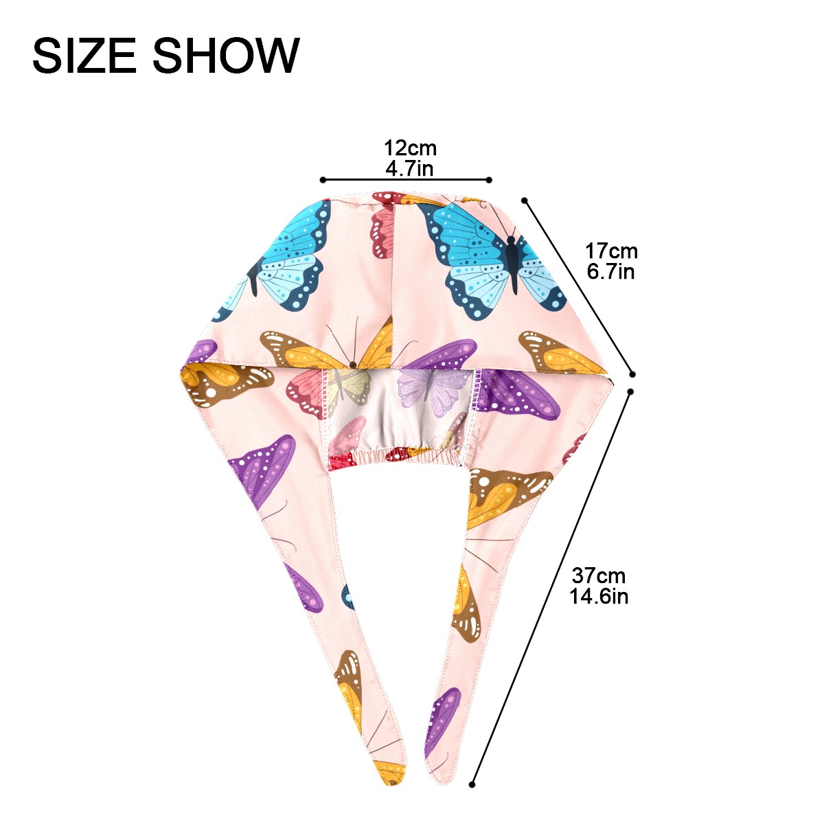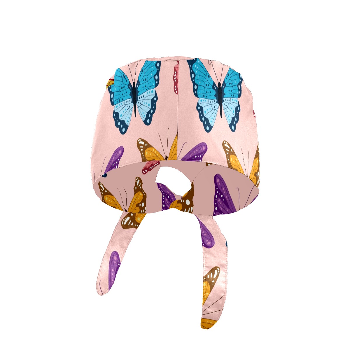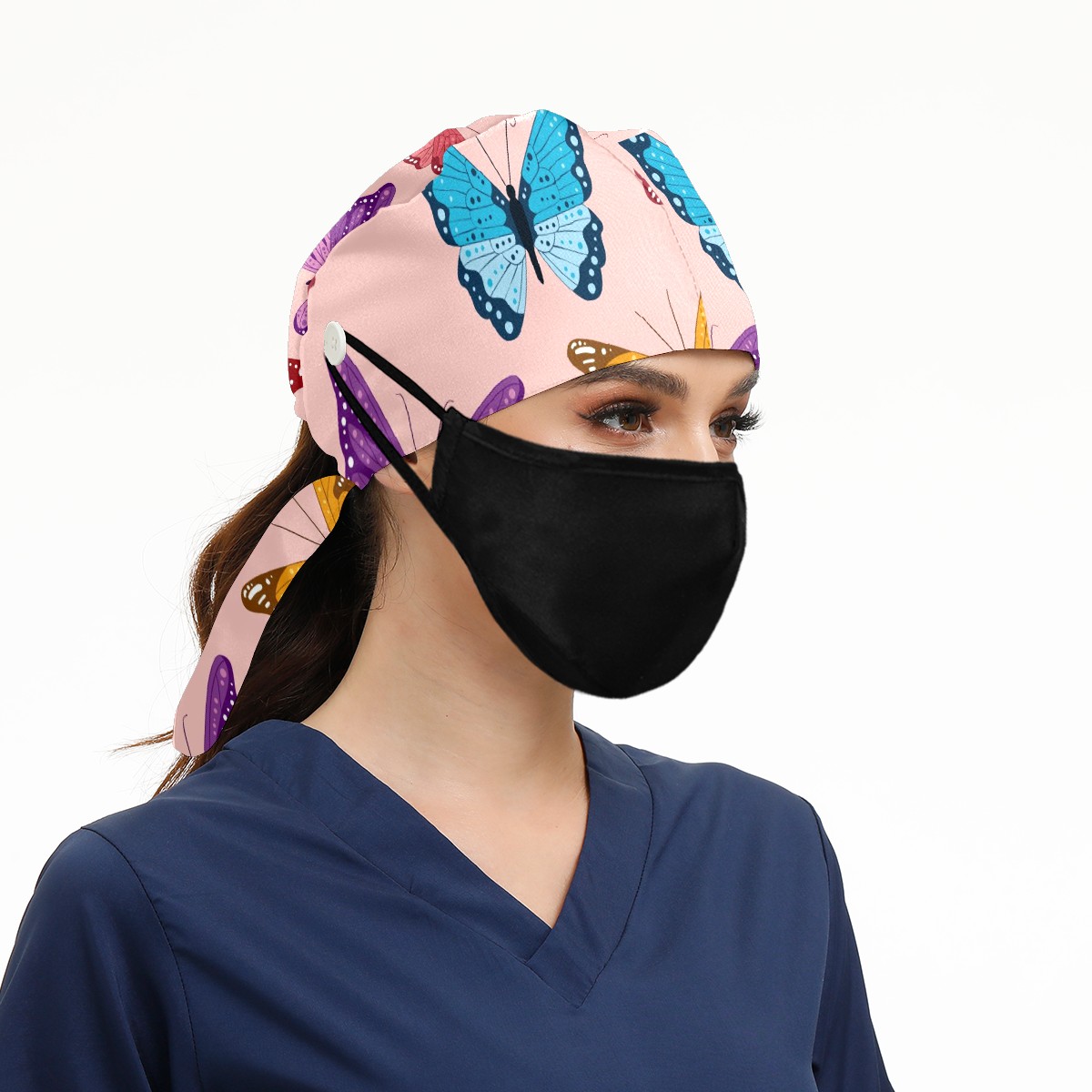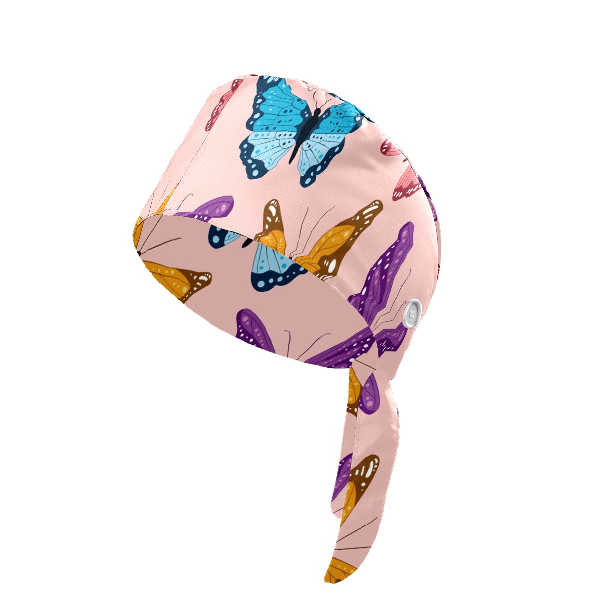 Working Caps with Button & Sweatband Satin Lined Cotton Adjustable Nurse Hats Elastic Band Scrub Cap Surgeon Hat Flying Red Purple Blue Yellow Butterflies